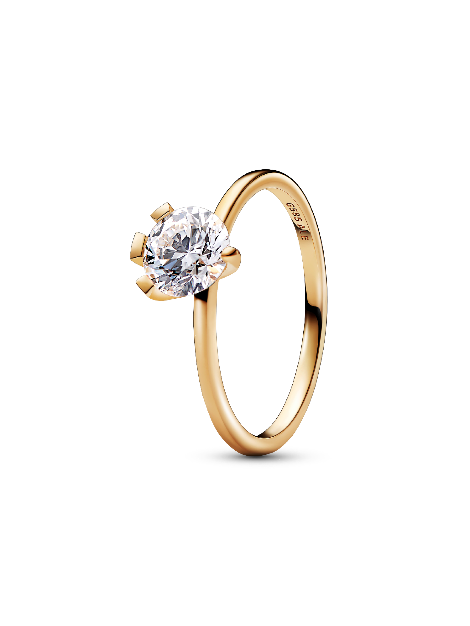 Shine in the Pandora Nova 14k Gold Lab-grown Diamond Ring. Inspired by the illusion of capturing and holding a precious fragment of light, this 14k gold ring showcases a 1.00 carat round brilliant excellent cut lab-grown diamond. The unique asymmetric prong setting opens the stone to the light for ultimate sparkle. A symbol of the unique light within all of us, this eye-catching lab-grown diamond ring is a piece to be worn and treasured for years to come - by you or someone who brings light into your world. Each Pandora Lab-grown diamond is treated with a post-growth color enhancement called annealing.