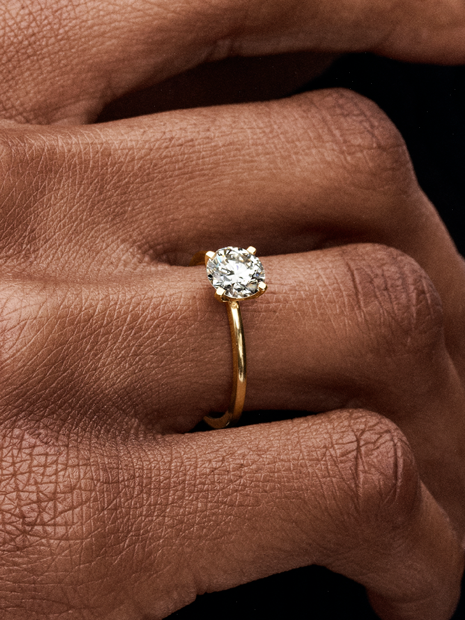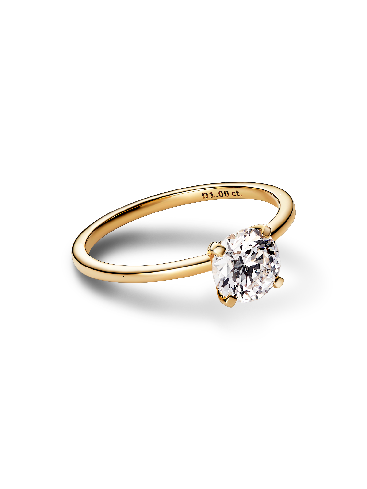 A fresh twist on a classic. The Pandora Era 14k Gold Lab-grown Diamond Ring showcases a 1.00 carat round brilliant excellent cut lab-created diamond in a four-prong setting that combines round and flat profiles, creating a modern aesthetic and opening the stone to the light for amplified sparkle. This eye-catching 14k gold ring is a piece to be worn and treasured for years to come - by you or someone who brings light into your world. Each Pandora Lab-grown diamond is treated with a post-growth color enhancement called annealing.
