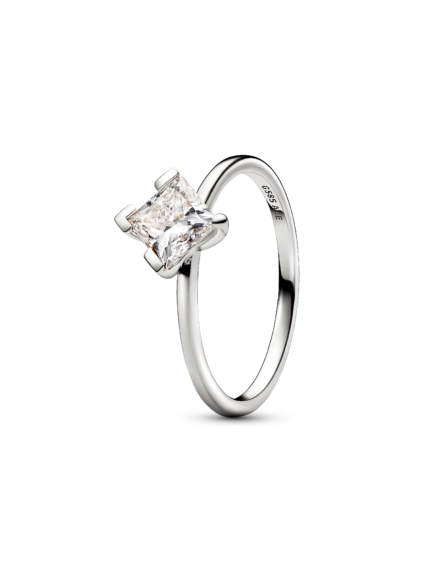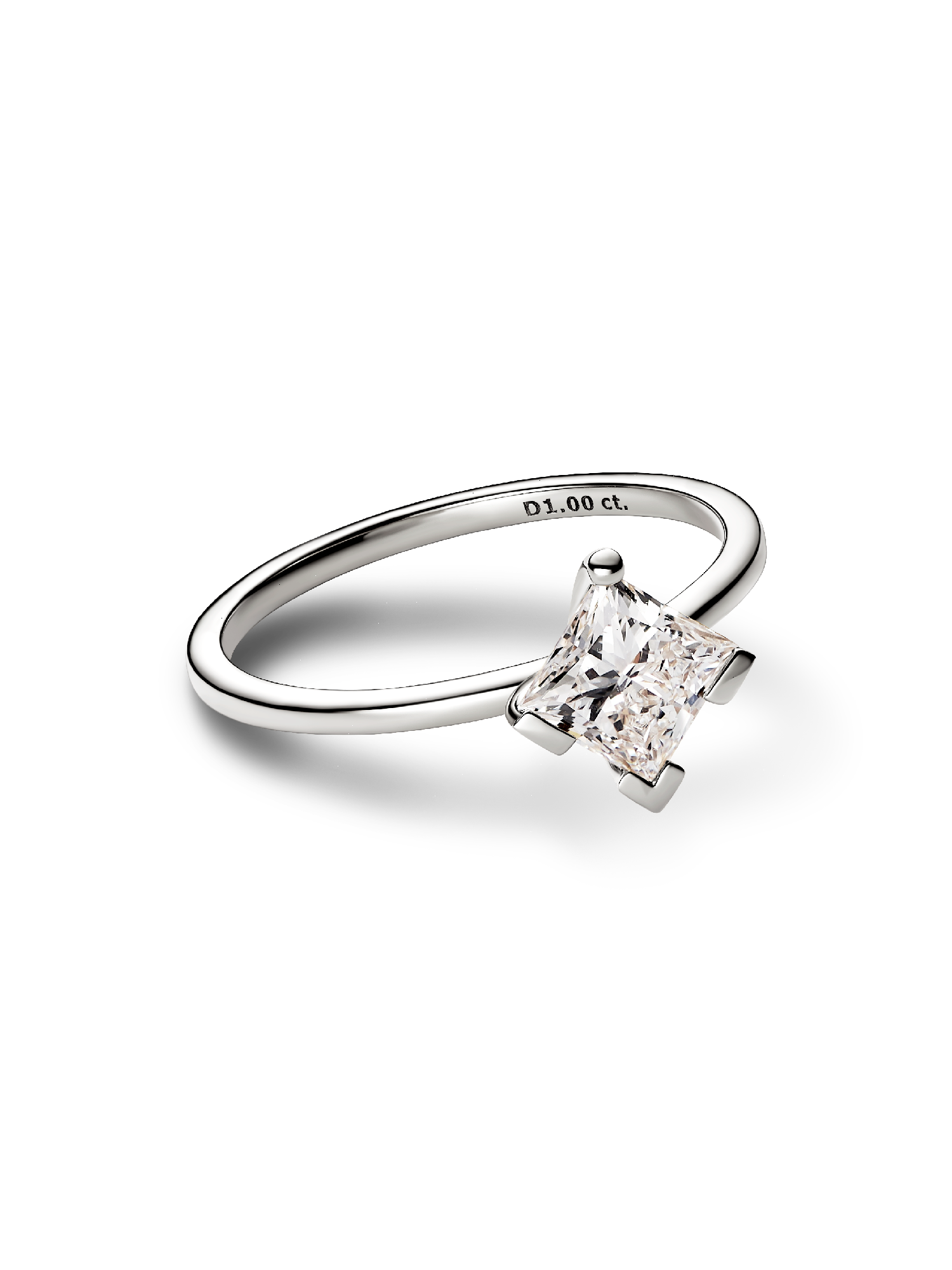 Shine in the Pandora Nova 14k White Gold Lab-grown Diamond Ring. Inspired by the illusion of capturing and holding a precious fragment of light, this 14k white gold ring showcases a 1.00 carat square princess excellent cut lab-grown diamond. The unique asymmetric prong setting opens the stone to the light for ultimate sparkle. A symbol of the unique light within all of us, this eye-catching lab-grown diamond ring is a piece to be worn and treasured for years to come - by you or someone who brings light into your world. Each Pandora Lab-grown diamond is treated with a post-growth color enhancement called annealing.