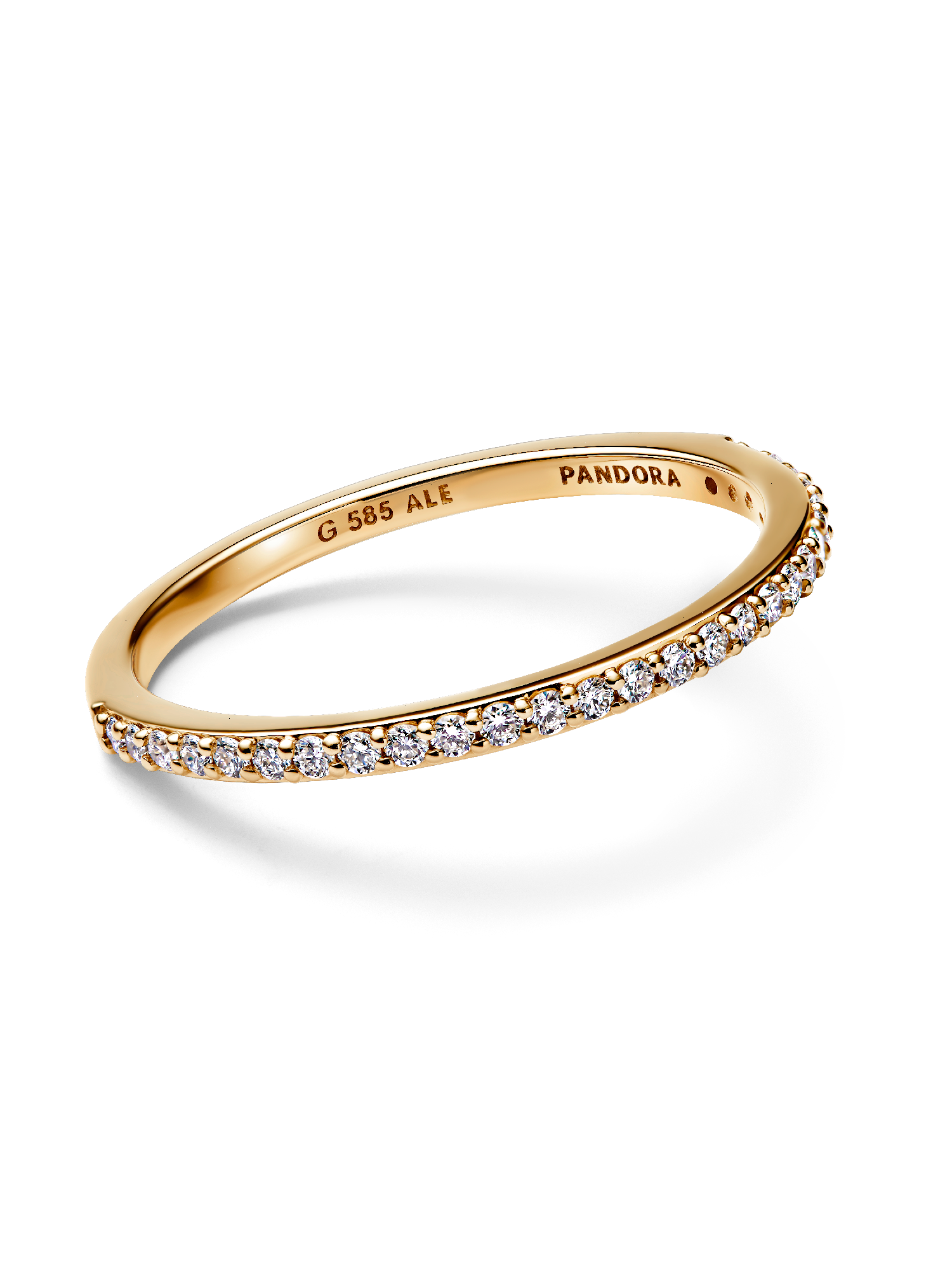 A little light goes a long way, with this radiant lab-grown diamond ring from our Pandora Era collection. A 14k gold band is encrusted with a row of 27 round-brilliant-cut lab-grown diamonds, fitted to the band with prong settings that hold the diamond diagonally, allowing maximum light refraction to enhance sparkle. Whether you're treating yourself or surprising someone special, this ring will add a little radiance to any look. To ensure our rigorous standards of quality in color and clarity, each lab-grown diamond has undergone an additional high heat and pressure treatment prior to cutting and polishing.