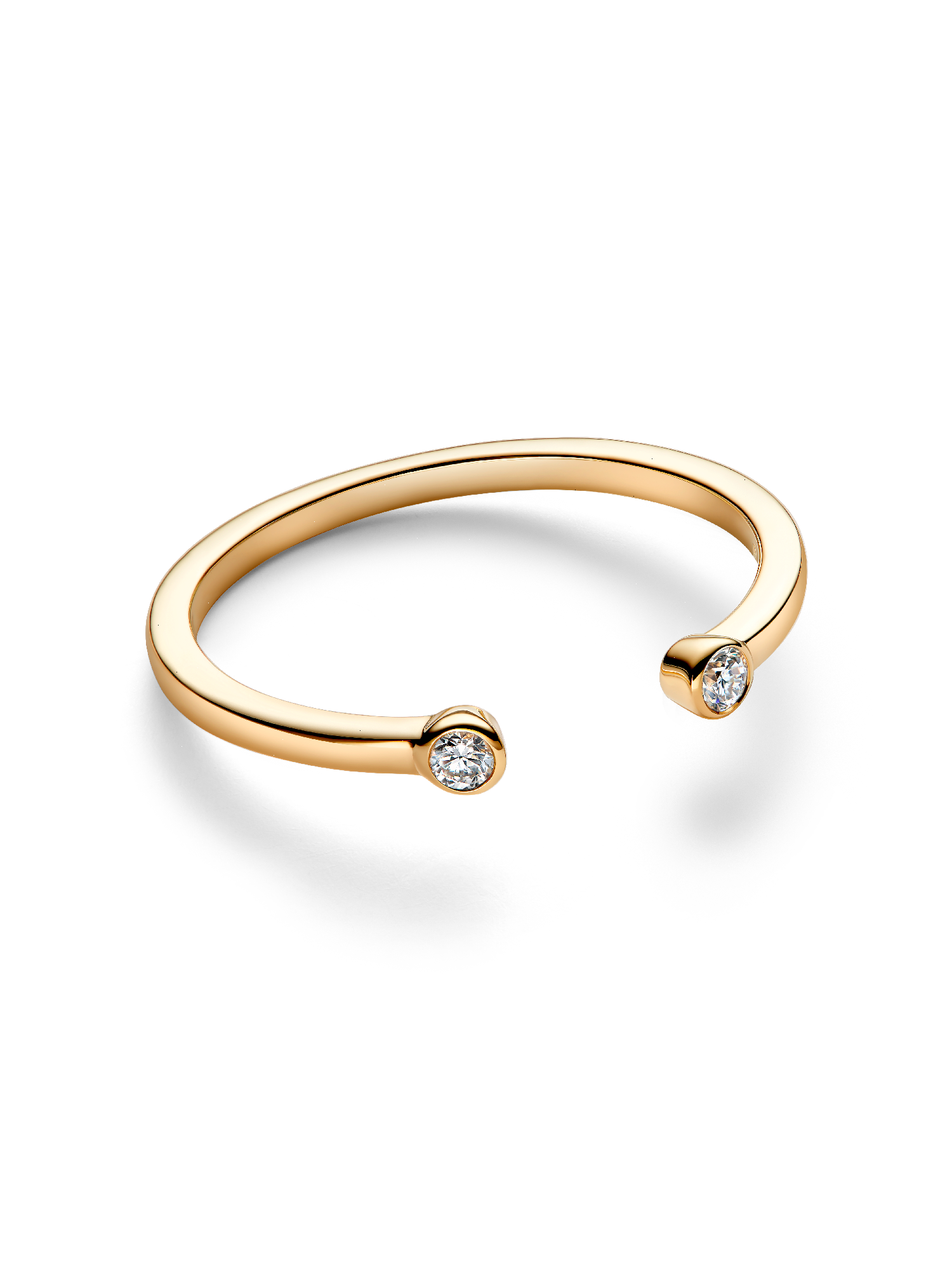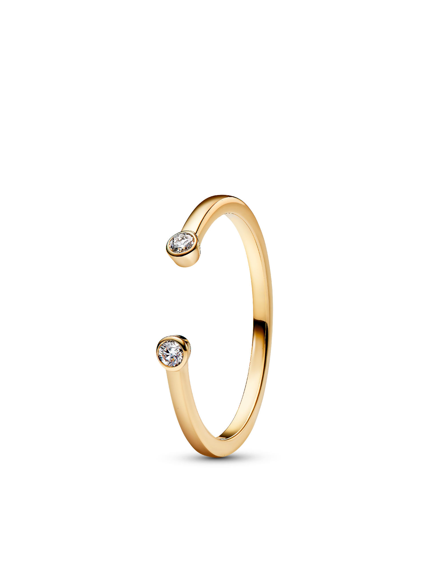 An elevated diamond stacking ring that embodies a minimalist aesthetic. Crafted from solid 14k gold, this ring features two bezel-set lab-grown diamonds on each end of the open ring band. The perfect stacking piece to pair with other Pandora Era designs, like the Pandora Era Lab-Grown Diamond Trio Ring.