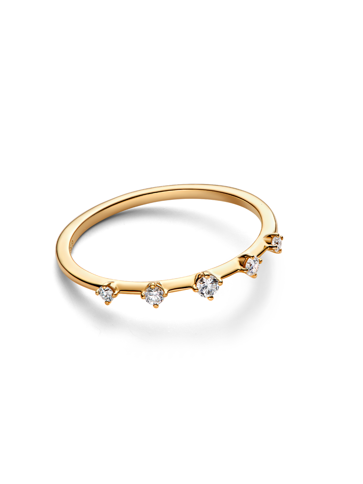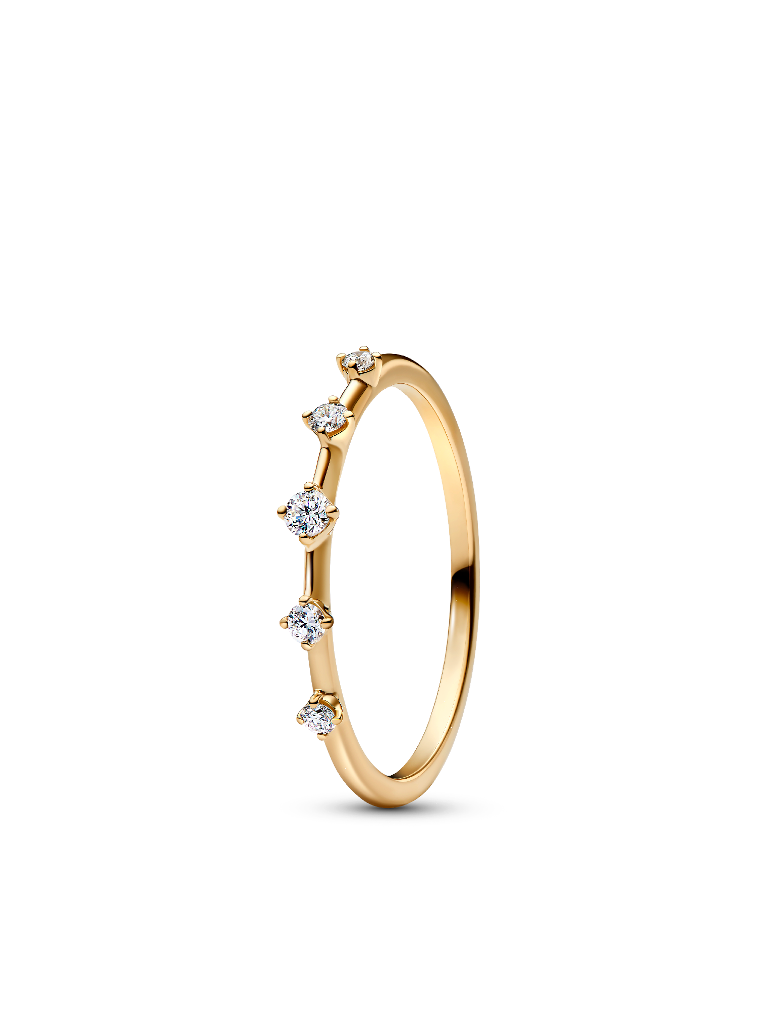 The Pandora Era Lab-Grown Diamond Station Ring features a delicate 14k gold band adorned with five prong-set round brilliant lab-grown diamonds. Graduated in size, the larger center stone adds a focal point that effortlessly elevates your style. Pair it with other rings for a layered look that maximizes on radiance.