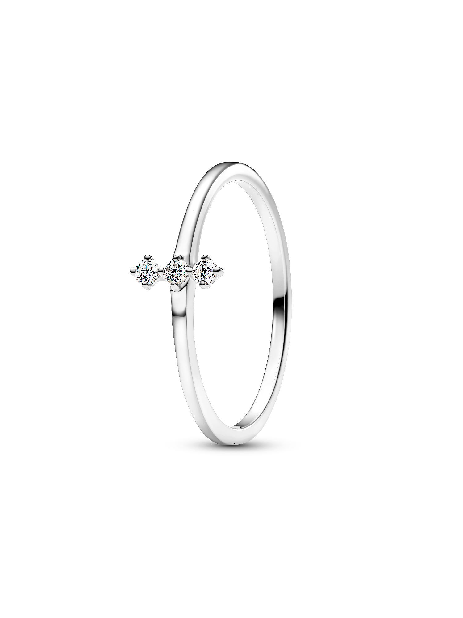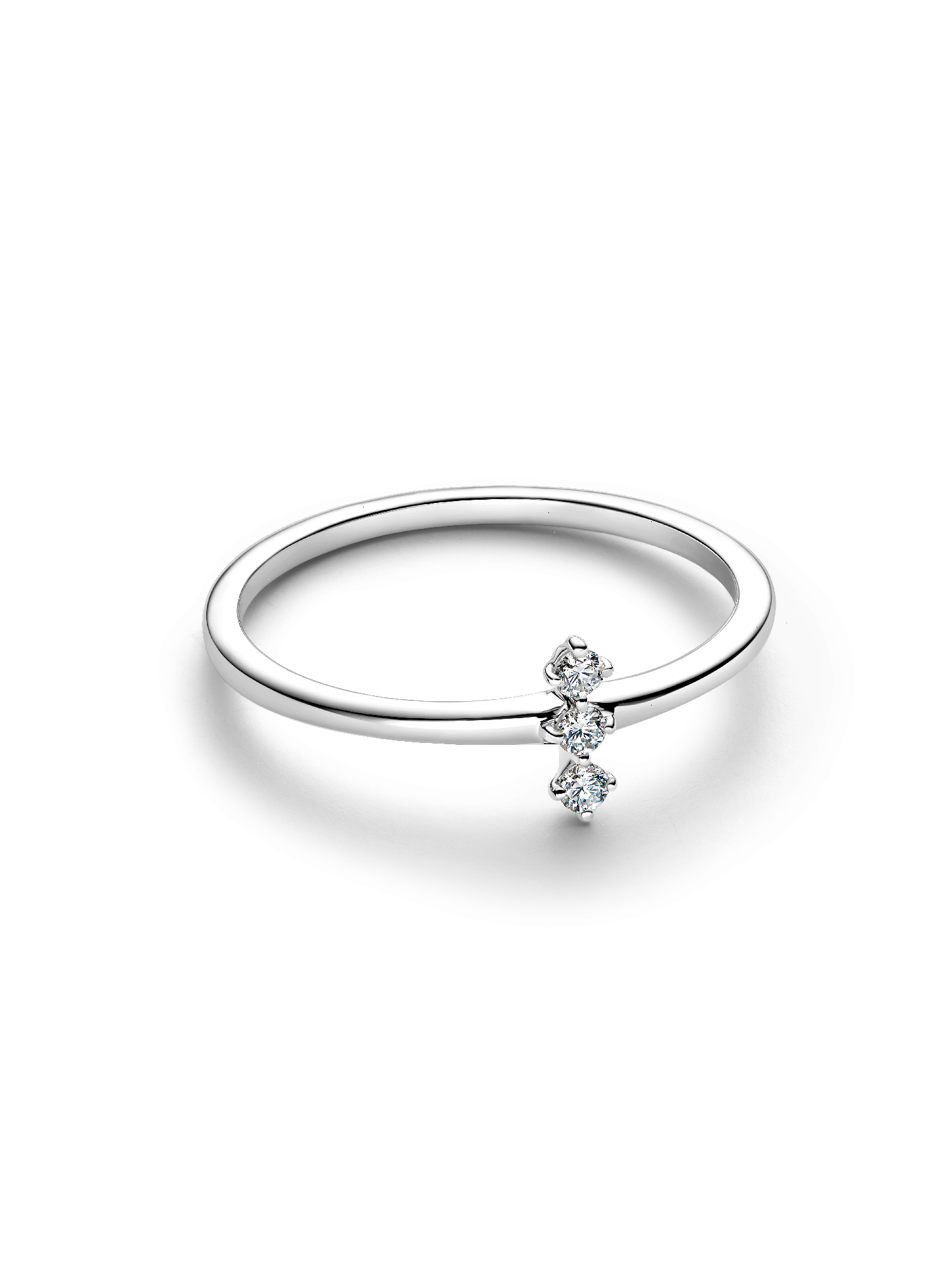 This delicate ring features three prong-set round brilliant lab-grown diamonds, set vertically at the center of a 14k white gold band. Perfect for stacking or wearing solo, it adds unique sparkle to any look.