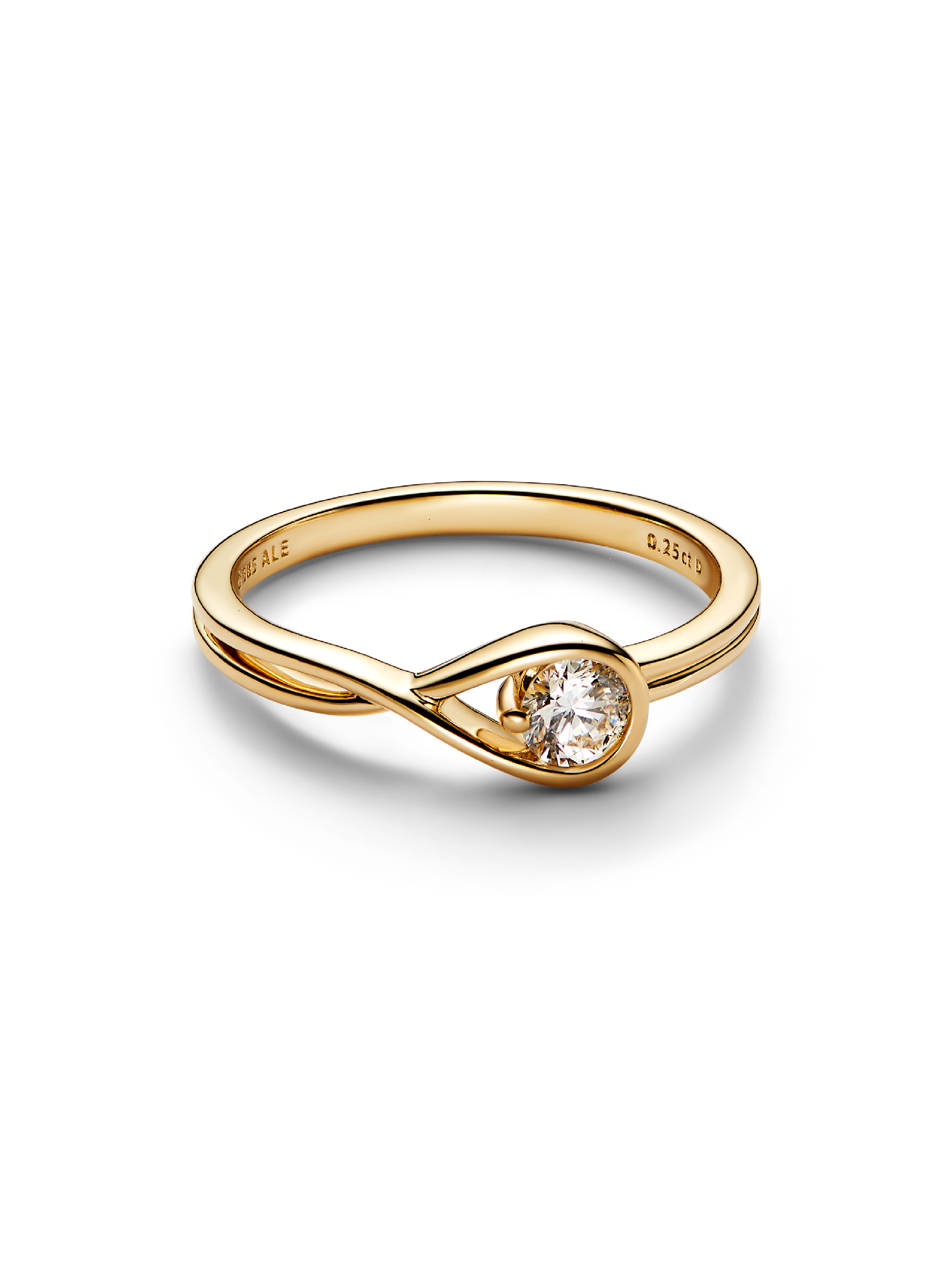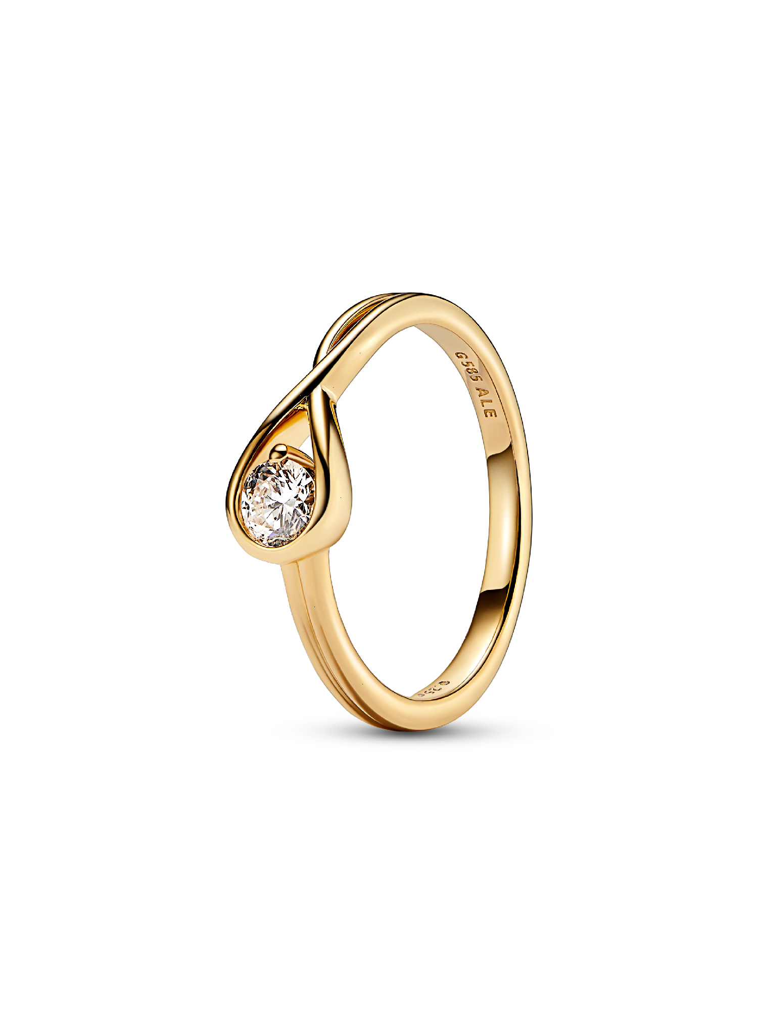 A solid 14k yellow gold ring hand set with a 0.25 carat lab-grown diamond. A beautiful statement of empowerment and possibility, or a simple yet eloquent declaration of love. This ring features a scintillating round brilliant excellent cut lab-grown diamond in a modern infinity setting that flows seamlessly around the stone. It can be worn alone or stacked with other rings from the Pandora Infinite collection. Each Pandora Lab-grown diamond is treated with a post-growth color enhancement called annealing.