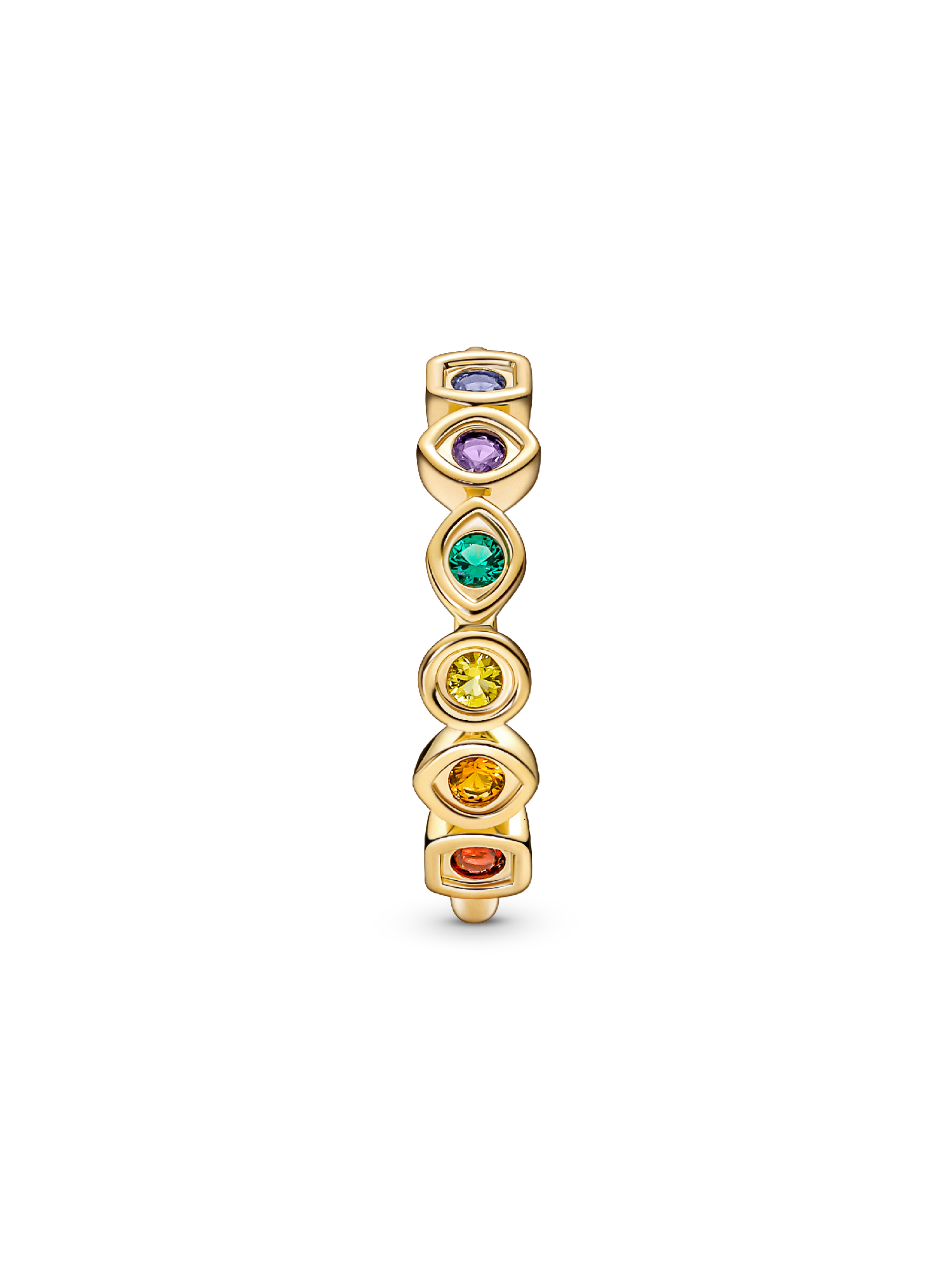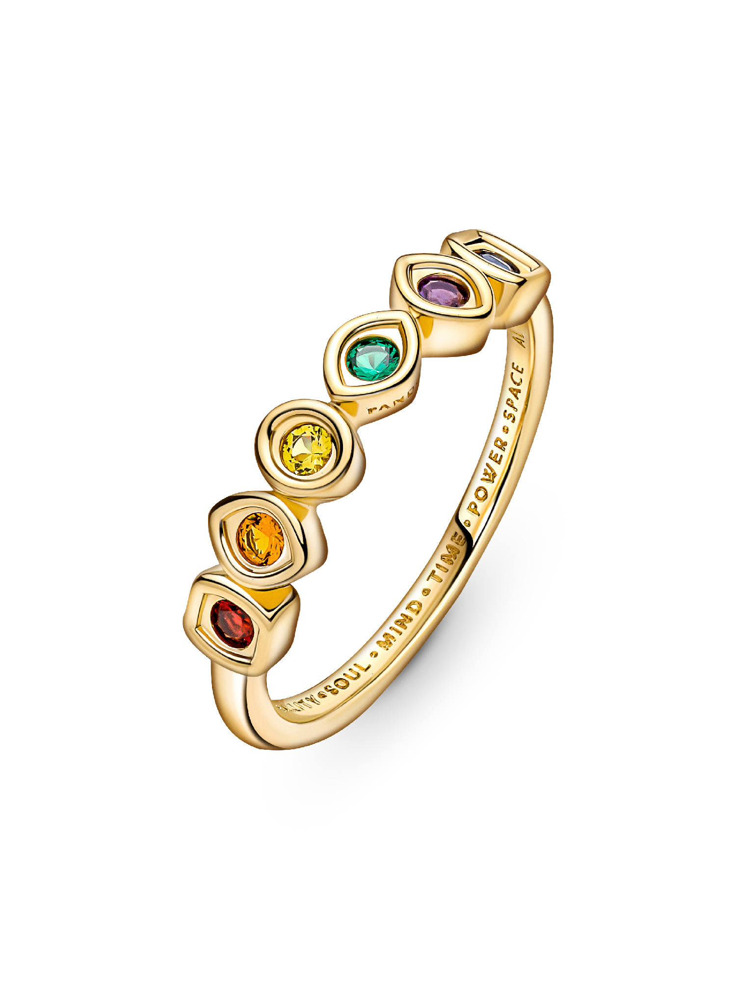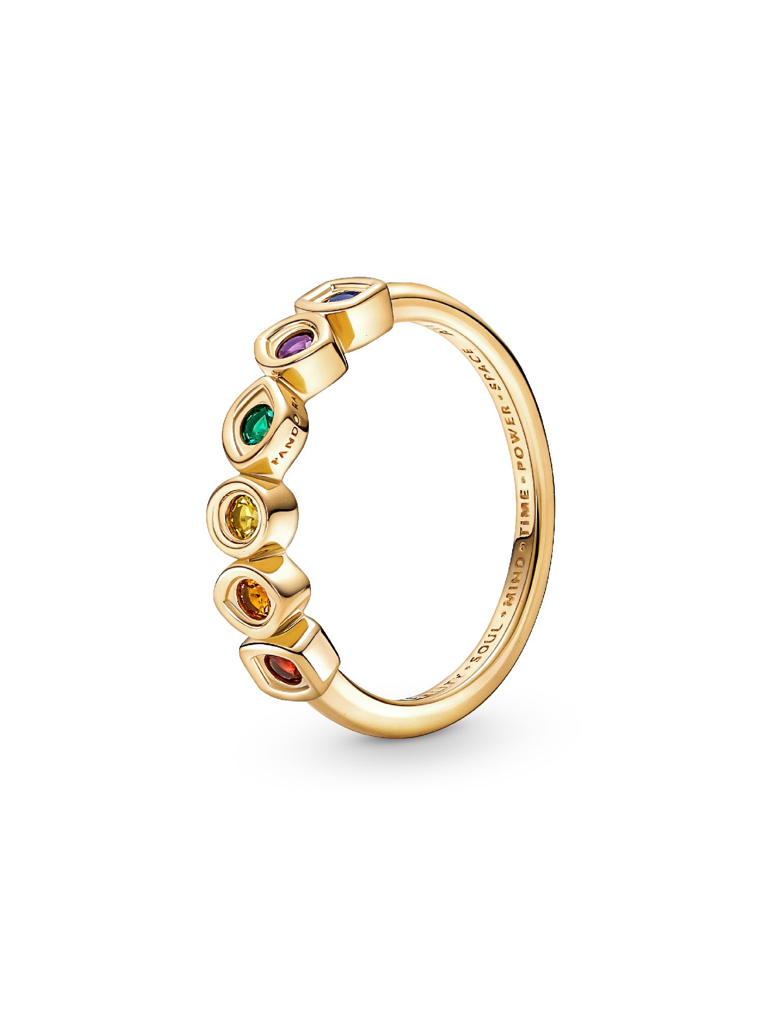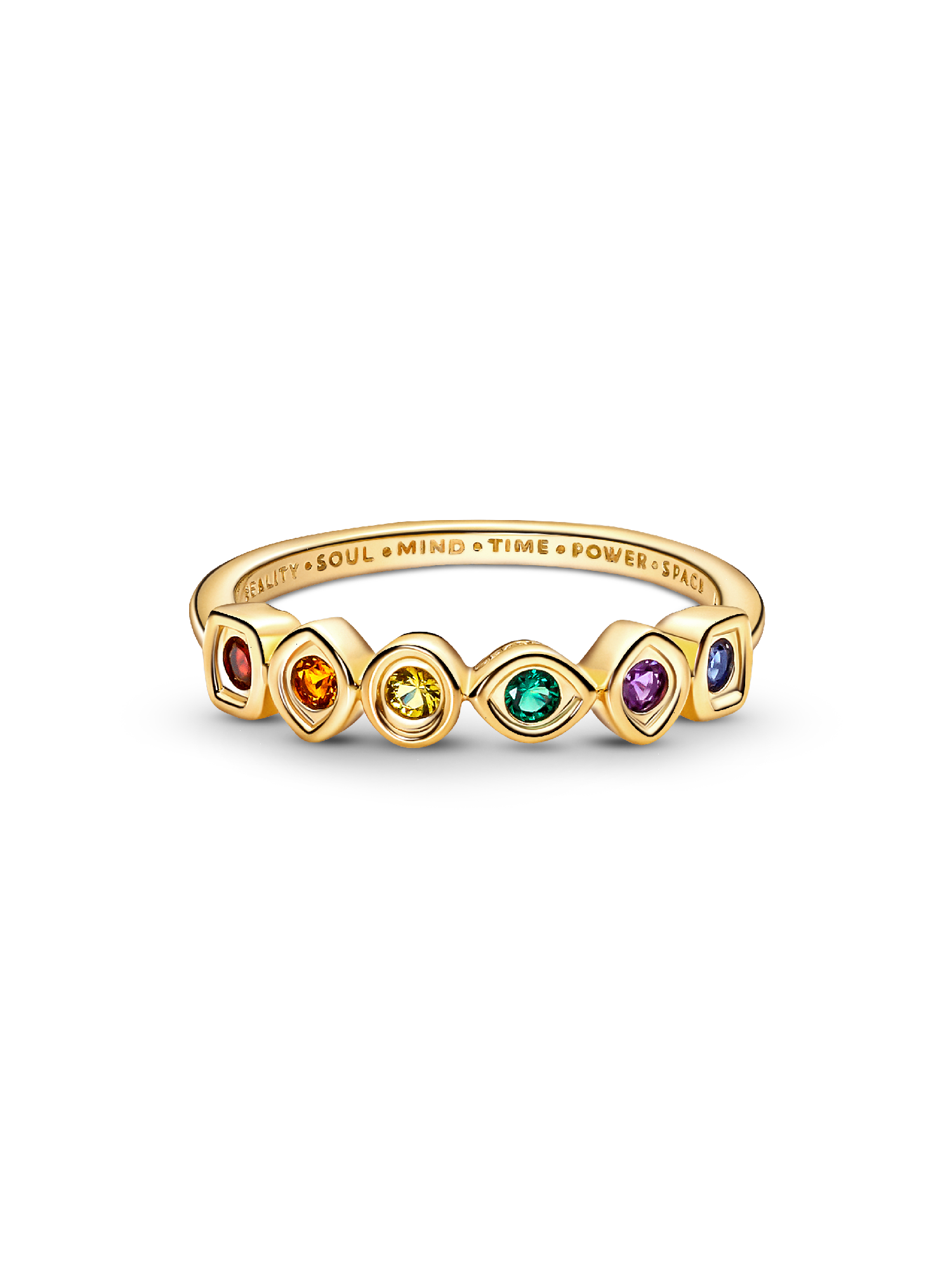 Harness the power of the Infinity Stones with our Marvel The Avengers Infinity Stones Ring. Perfectly balanced, as all things should be, our 14k gold-plated ring features six colorful man-made crystals, representing the most coveted objects in the universe. The inside of the band is engraved with each stone's corresponding power: space, reality, power, soul, mind and time. Pair this ring with other battle-ready pieces from our Marvel x Pandora collection.