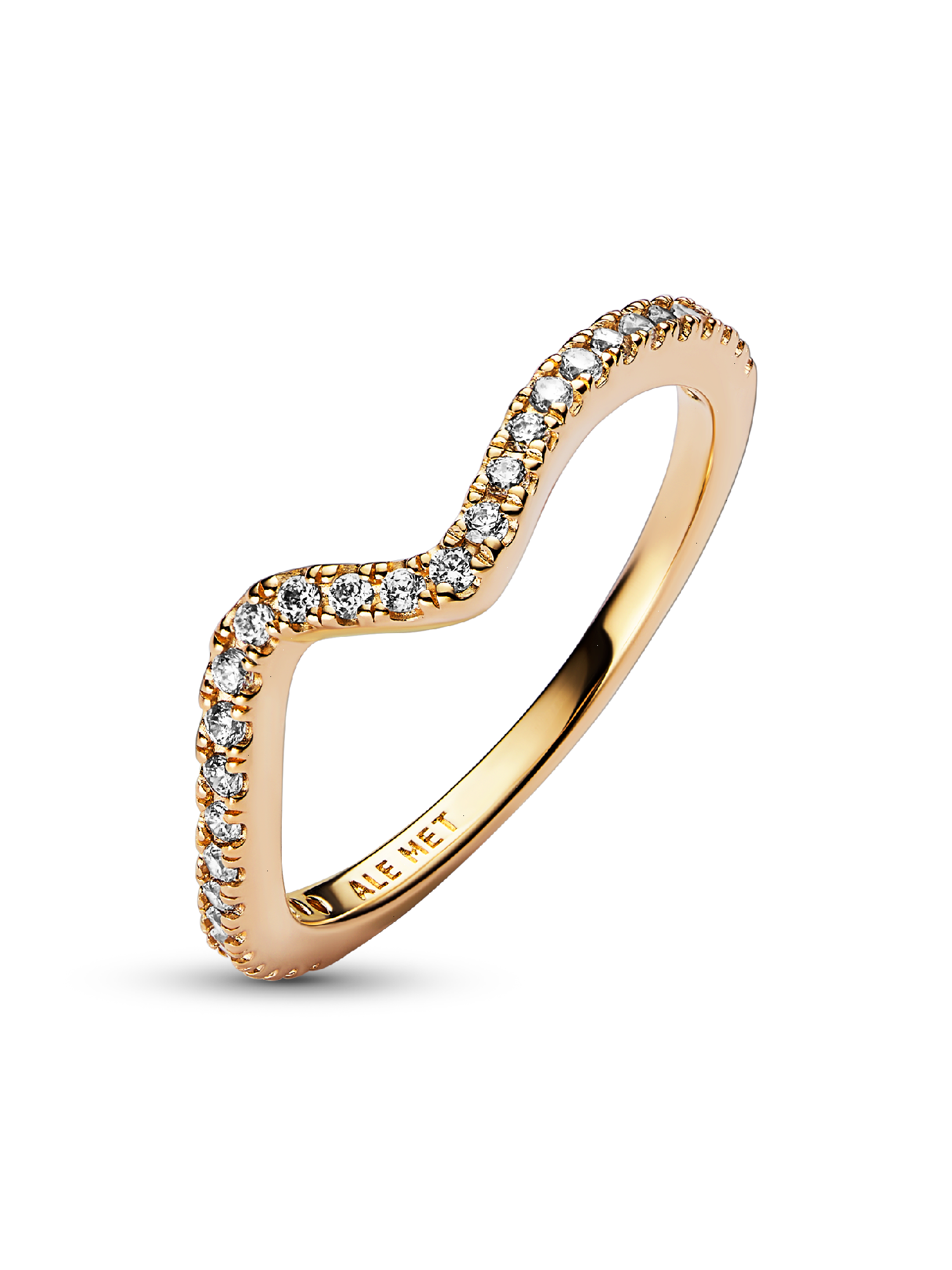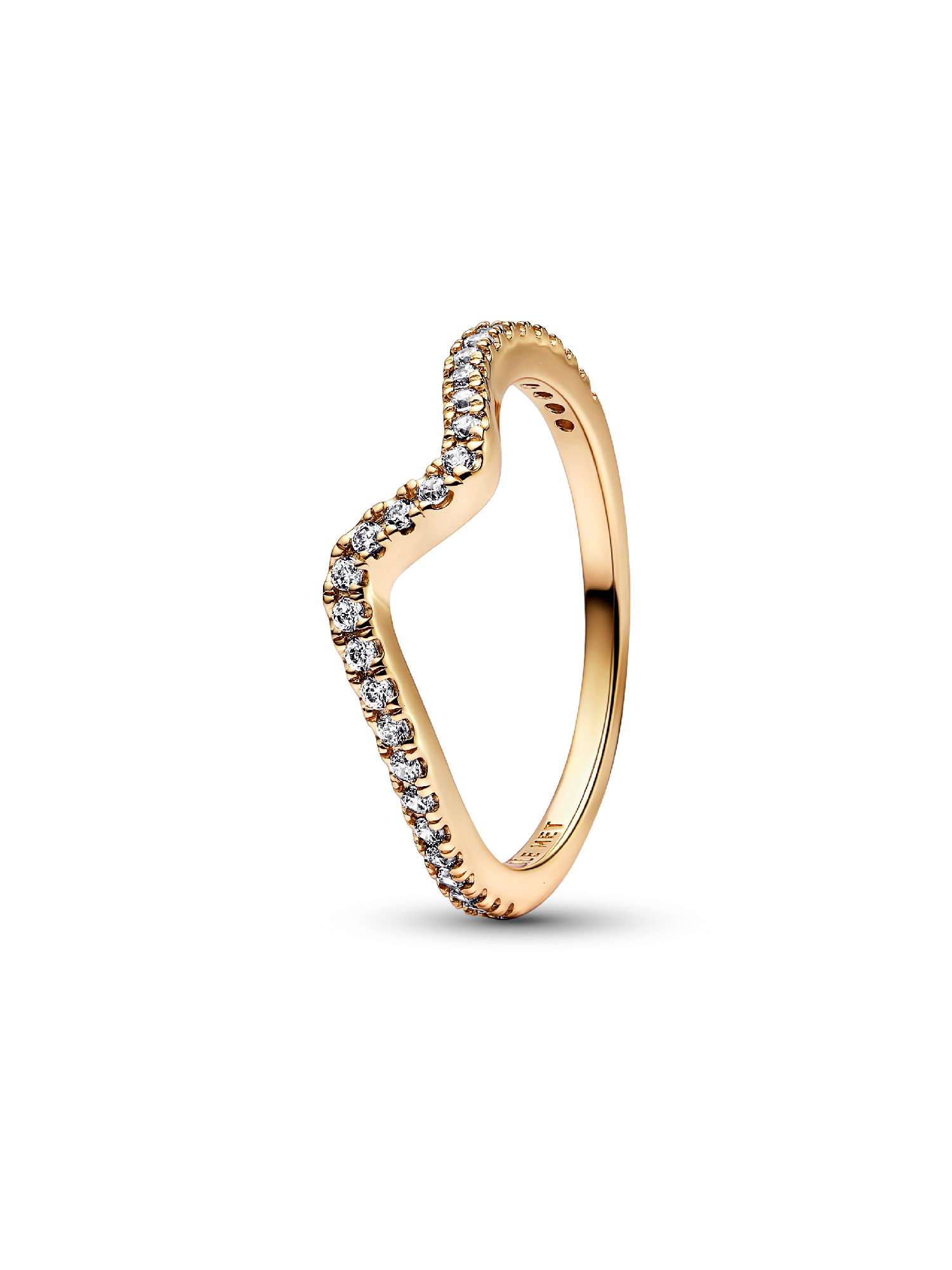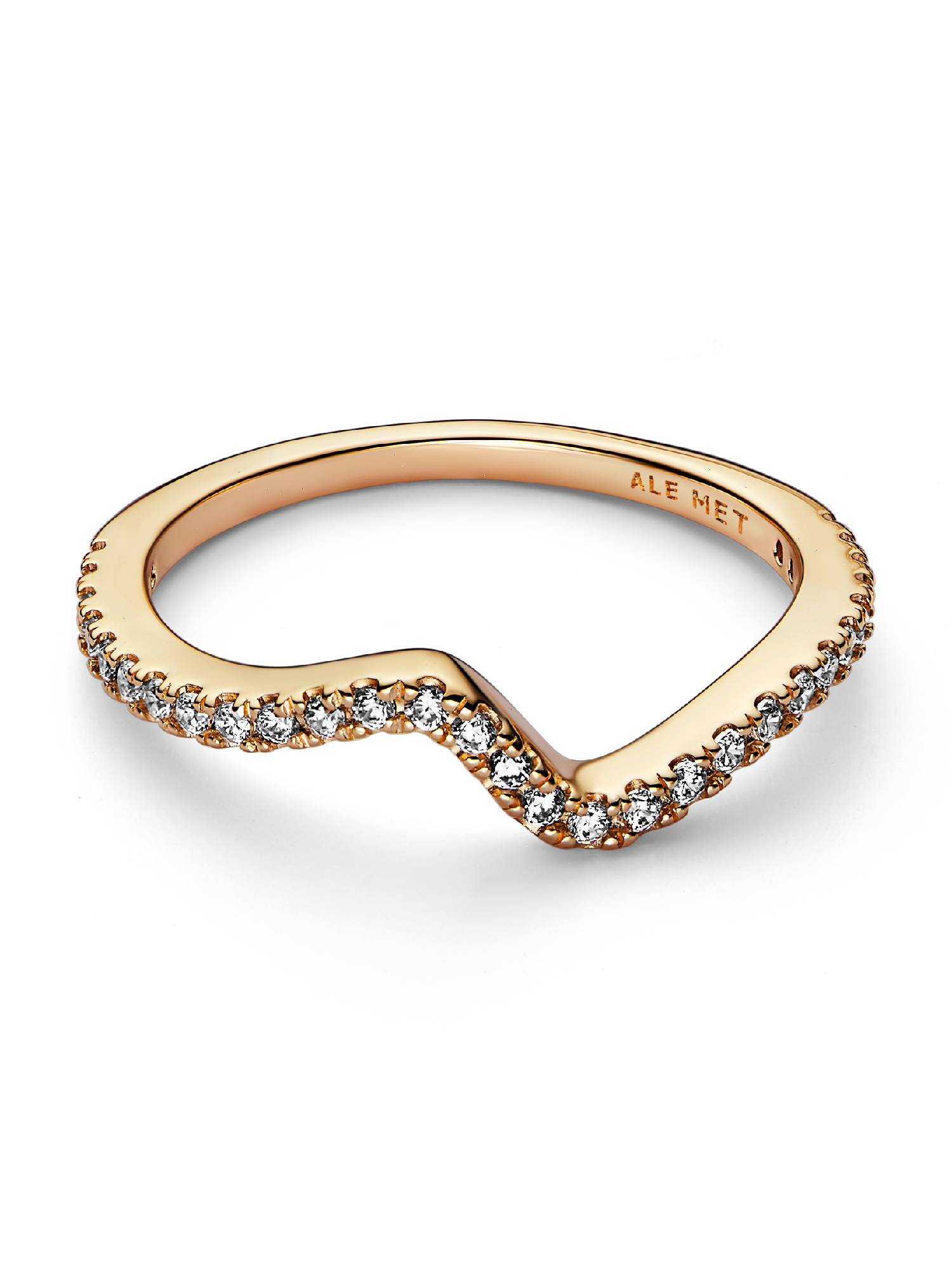 Hand-finished in 14k gold plating, our Sparkling Wave Ring curves to resemble the movement of a wave and features a row of round brilliant-cut clear cubic zirconia along its front. Wear it solo or stacked for a contemporary look you’ll love for years to come.