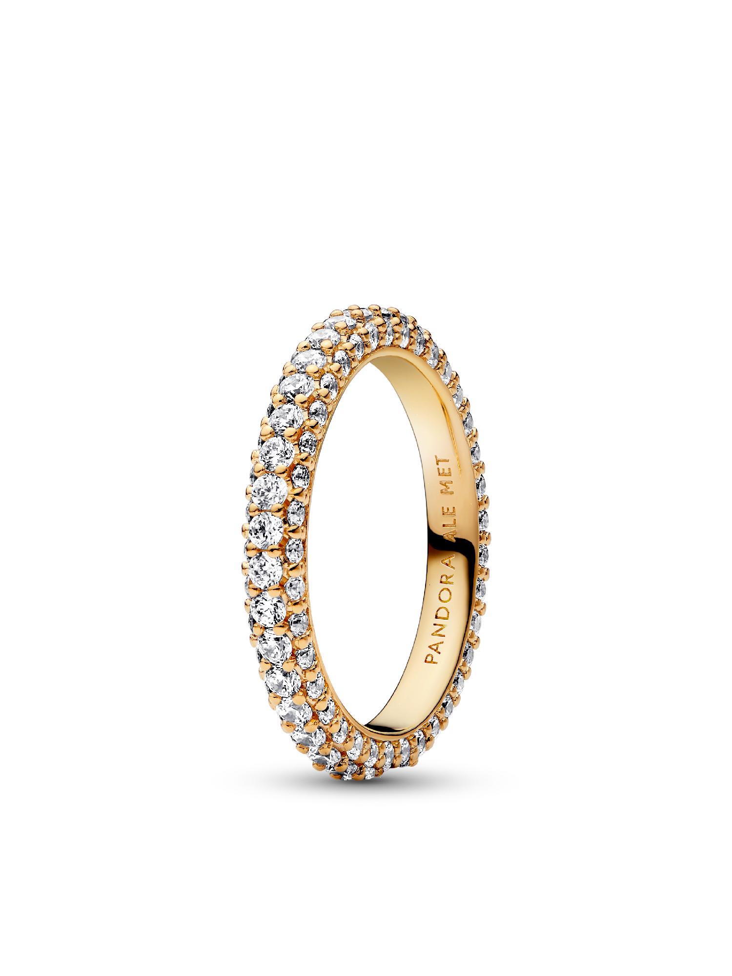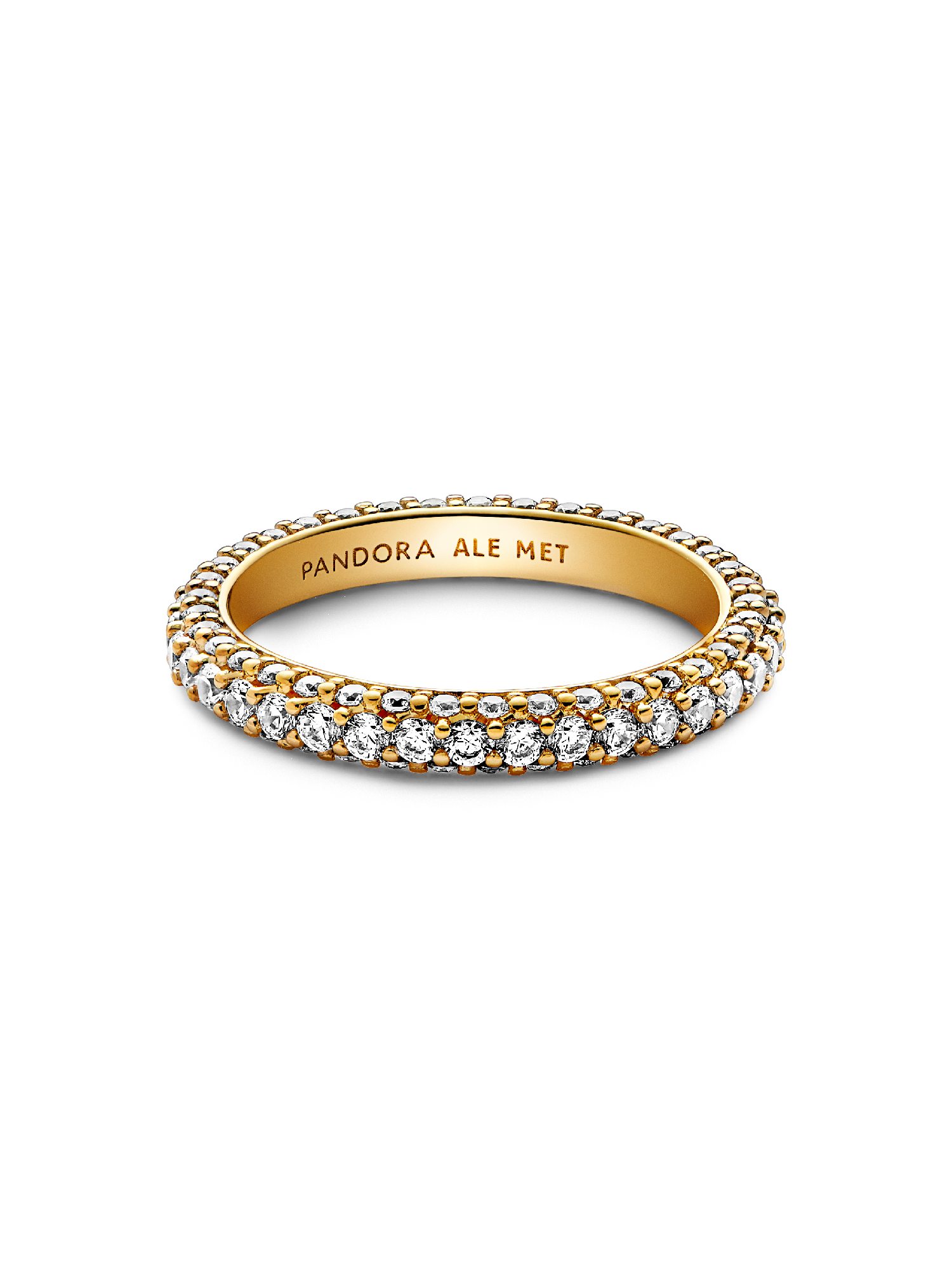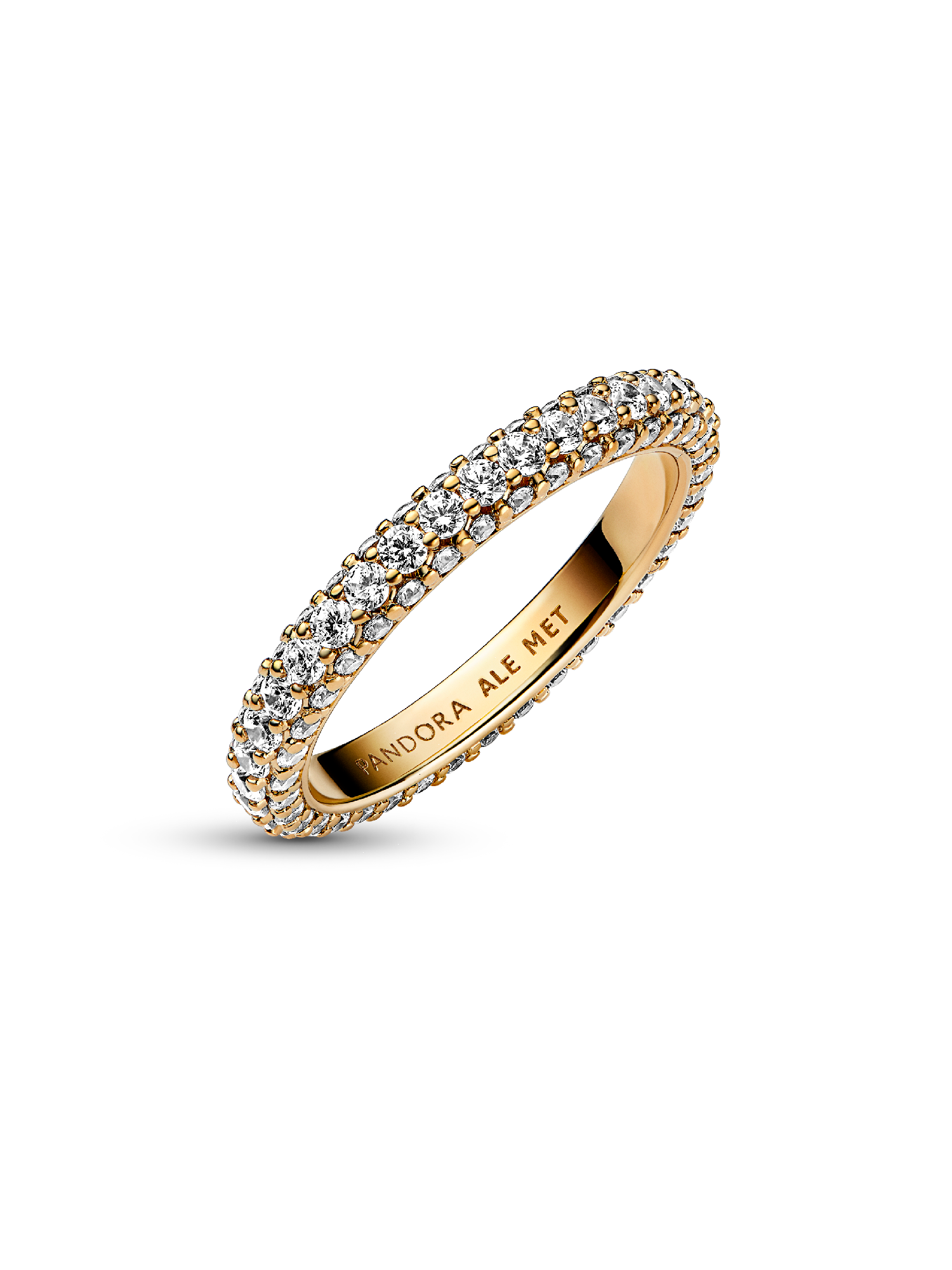 Stackable, radiant, timeless. Shining in 14k gold plating, our hand-finished Pandora Timeless Pavé Single-row Ring features one row of clear cubic zirconia around the center and one row facing outwards around each side, creating a slightly rounded square profile that sparkles from every angle. Style it on its own or with other Timeless Pavé pieces to create as much of a minimalist or maximalist effect as you want.