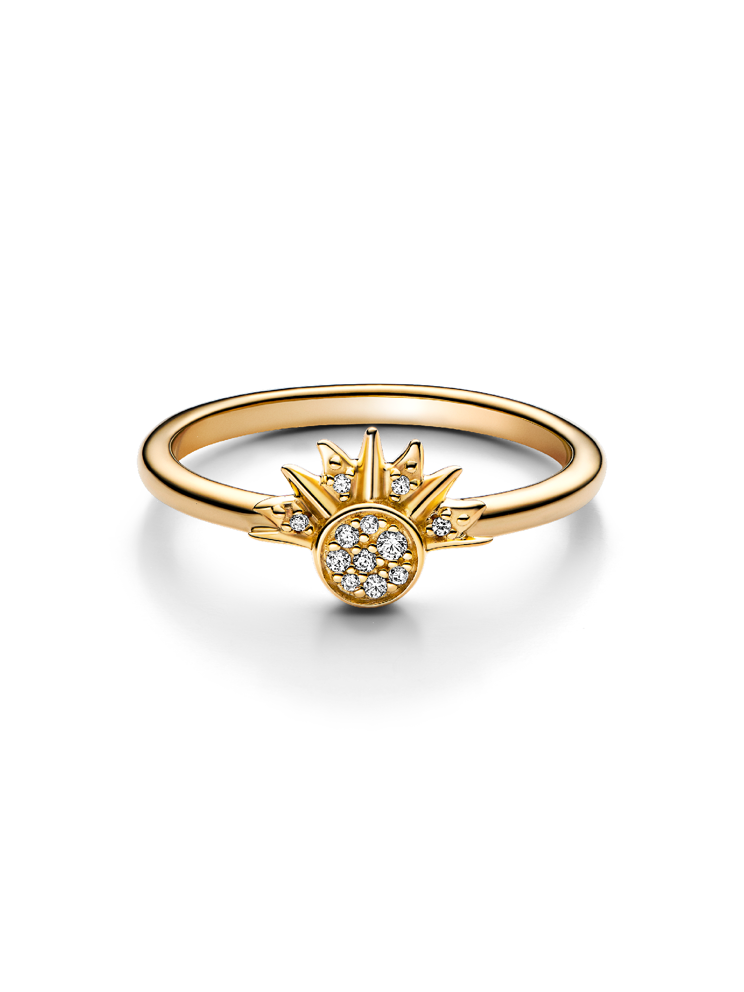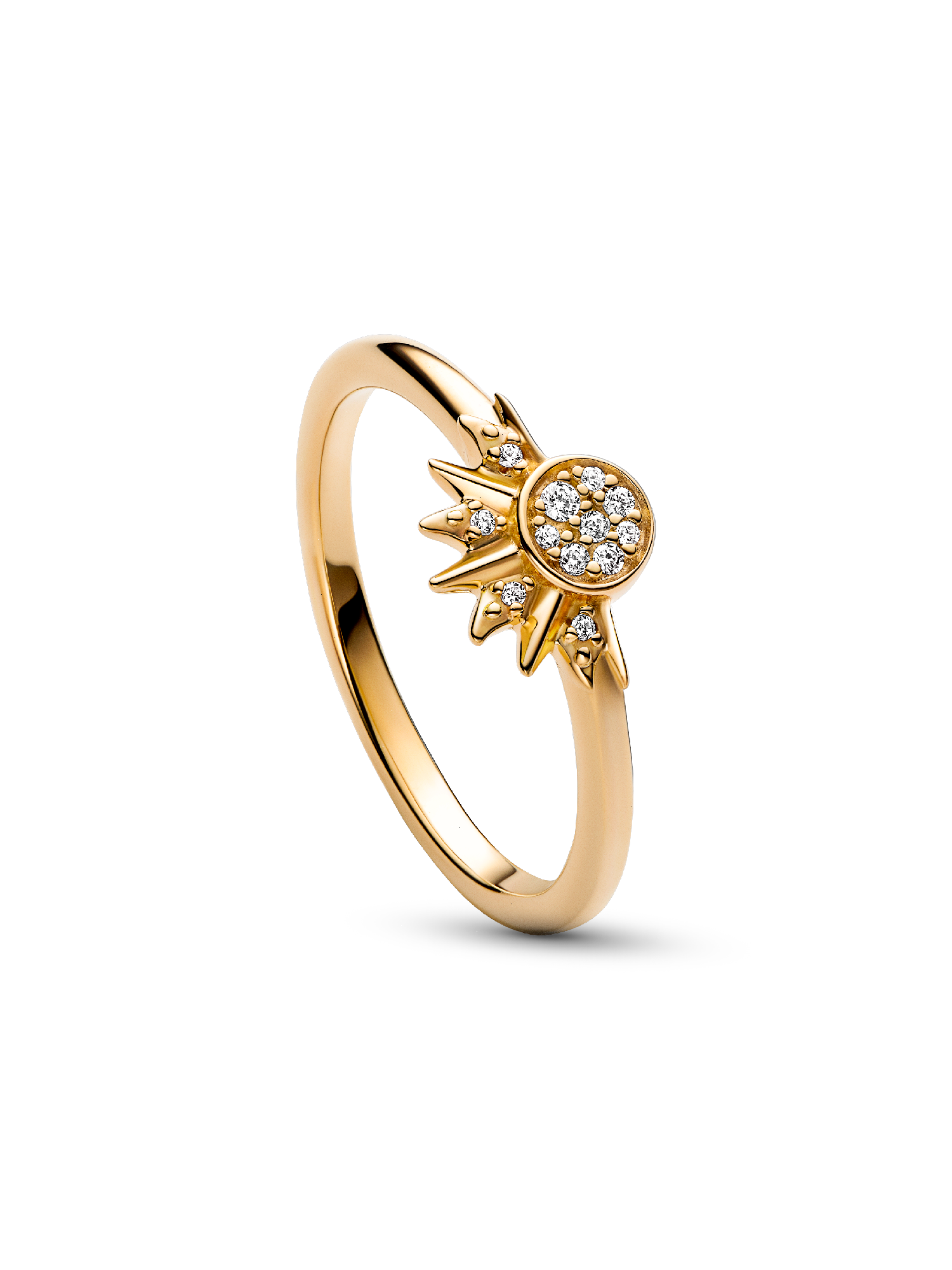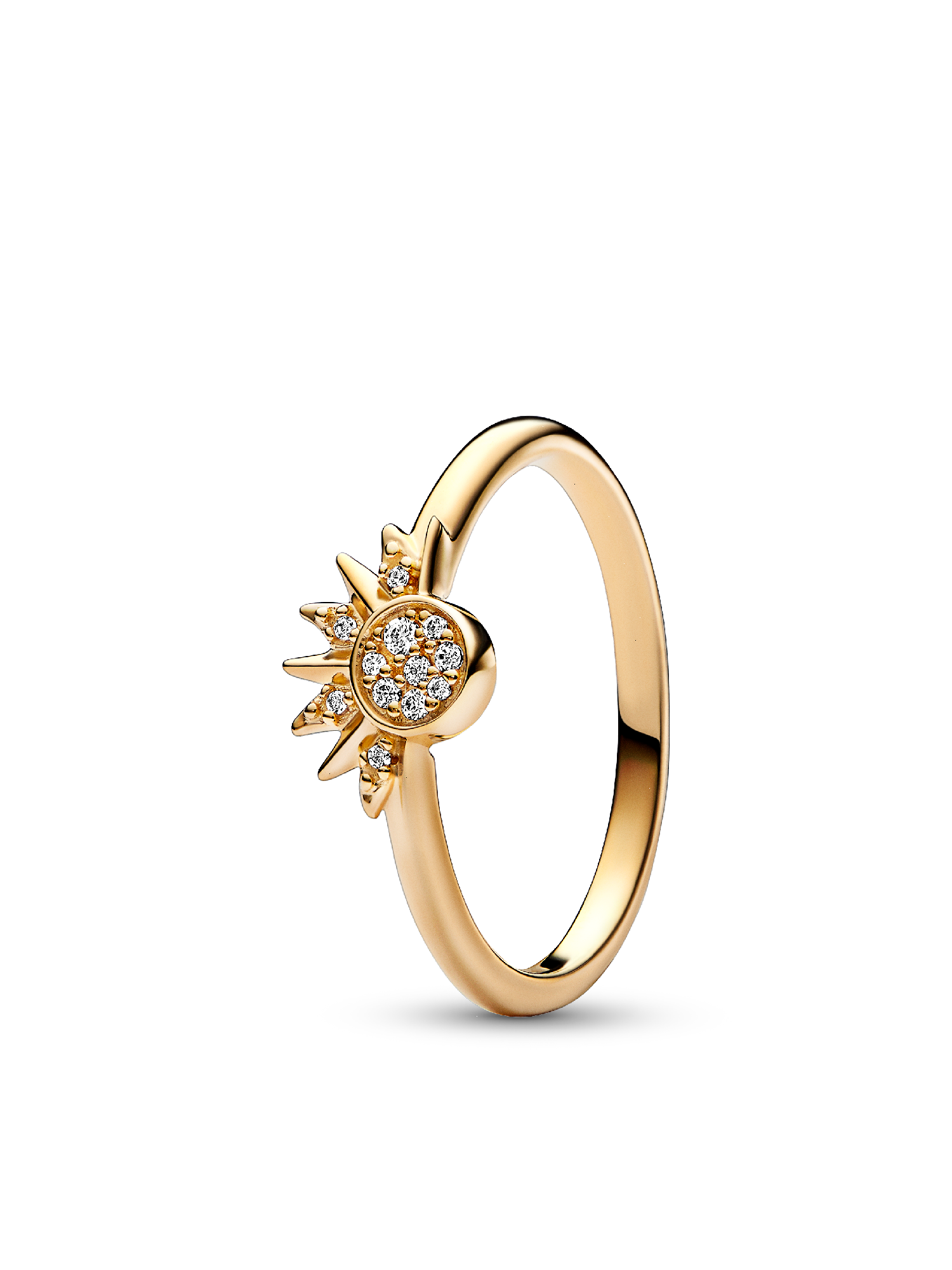 Radiate summer energy with the Celestial Sparkling Sun Ring. This hand-finished ring glows in 14k gold-plating, with a sun motif in the center formed by a circle of clear pavé with rays emanating from one side. Wear it by itself as a symbol of energy, positivity and life, or stack it with its counterpart, the Celestial Blue Sparkling Moon Ring. The two rings fit perfectly together, representing duality and harmony in nature and within ourselves.