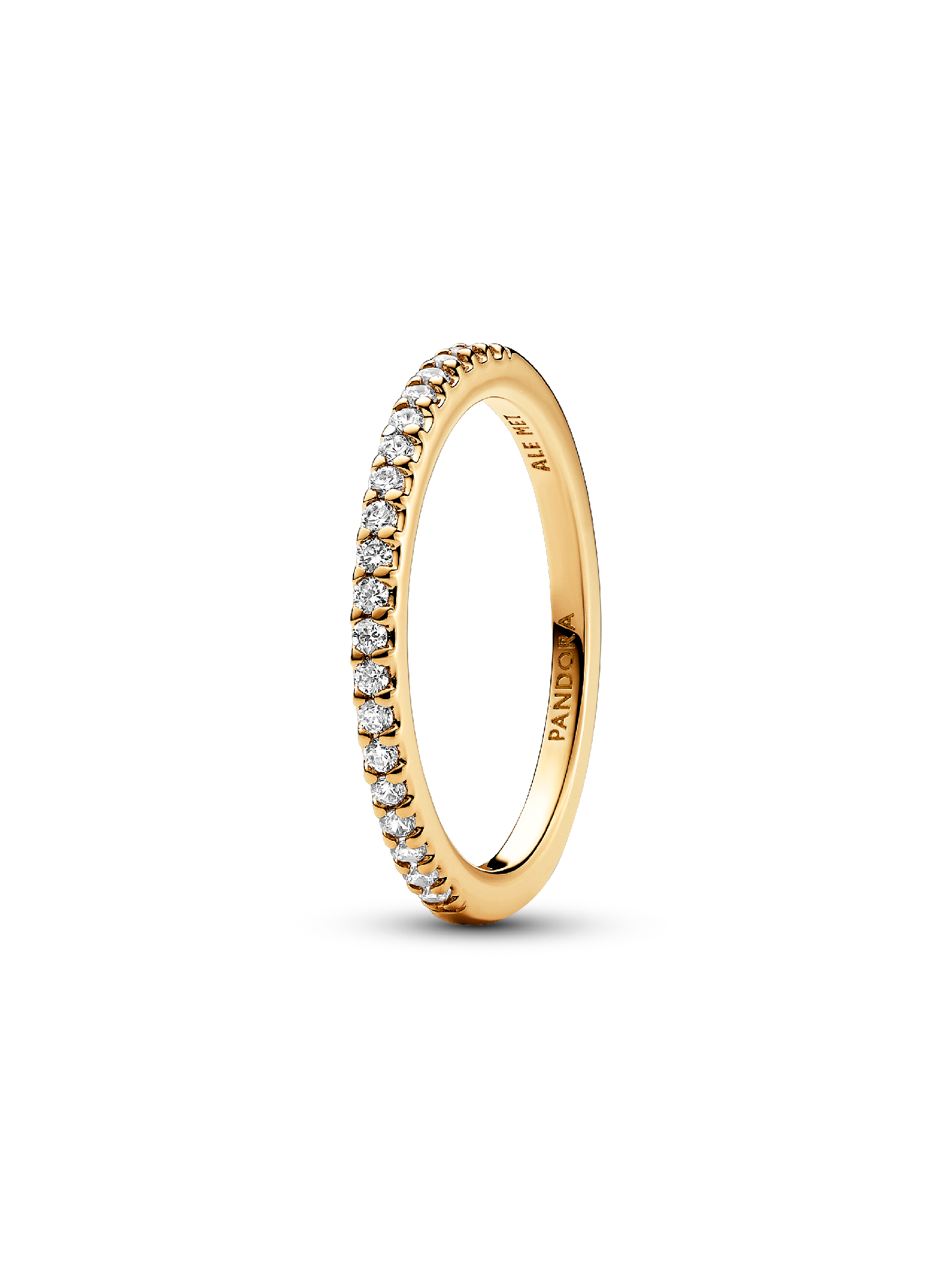 Choose delicate sparkle when you wear the Sparkling Band Ring. An essential piece for every collection, this 14k gold-plated ring is set with a row of clear cubic zirconia. The pavé row sparkles from the outer front half of the band, which features a squared profile. Peek inside the band to see the engraved iconic Pandora logo. Whether you wear it solo for subtle sparkle or stack it with other styles, this shining ring will elevate your everyday.