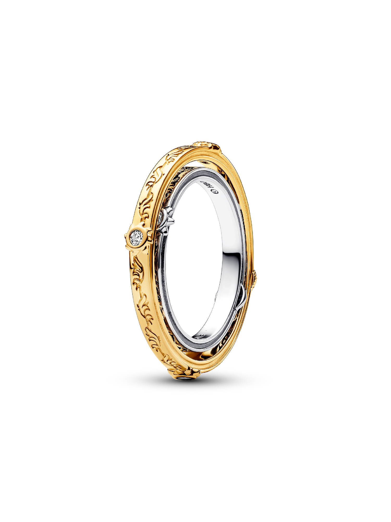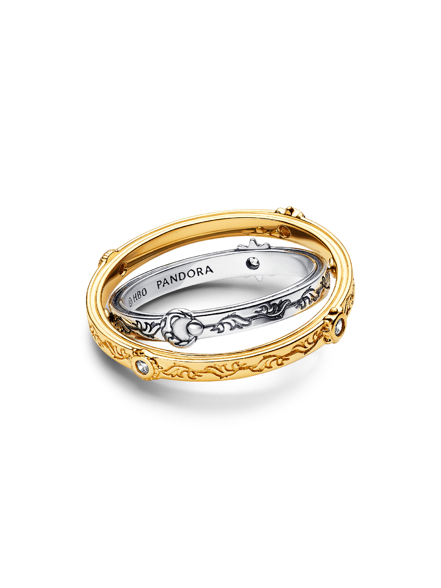 Show your strength with the Game of Thrones Spinning Astrolabe Ring. This spinning ring from the Game of Thrones x Pandora collection is plated with 14k gold and features spinning bands with intricate detailing, reminiscent of a true astrolabe. The two ring bands are connected by pins, allowing for movement. The intricate detailing adds a mythical touch together with the sparkling cubic zirconia. Inspired by the history of Westeros, it's the perfect piece for the Game of Thrones fan in your life.