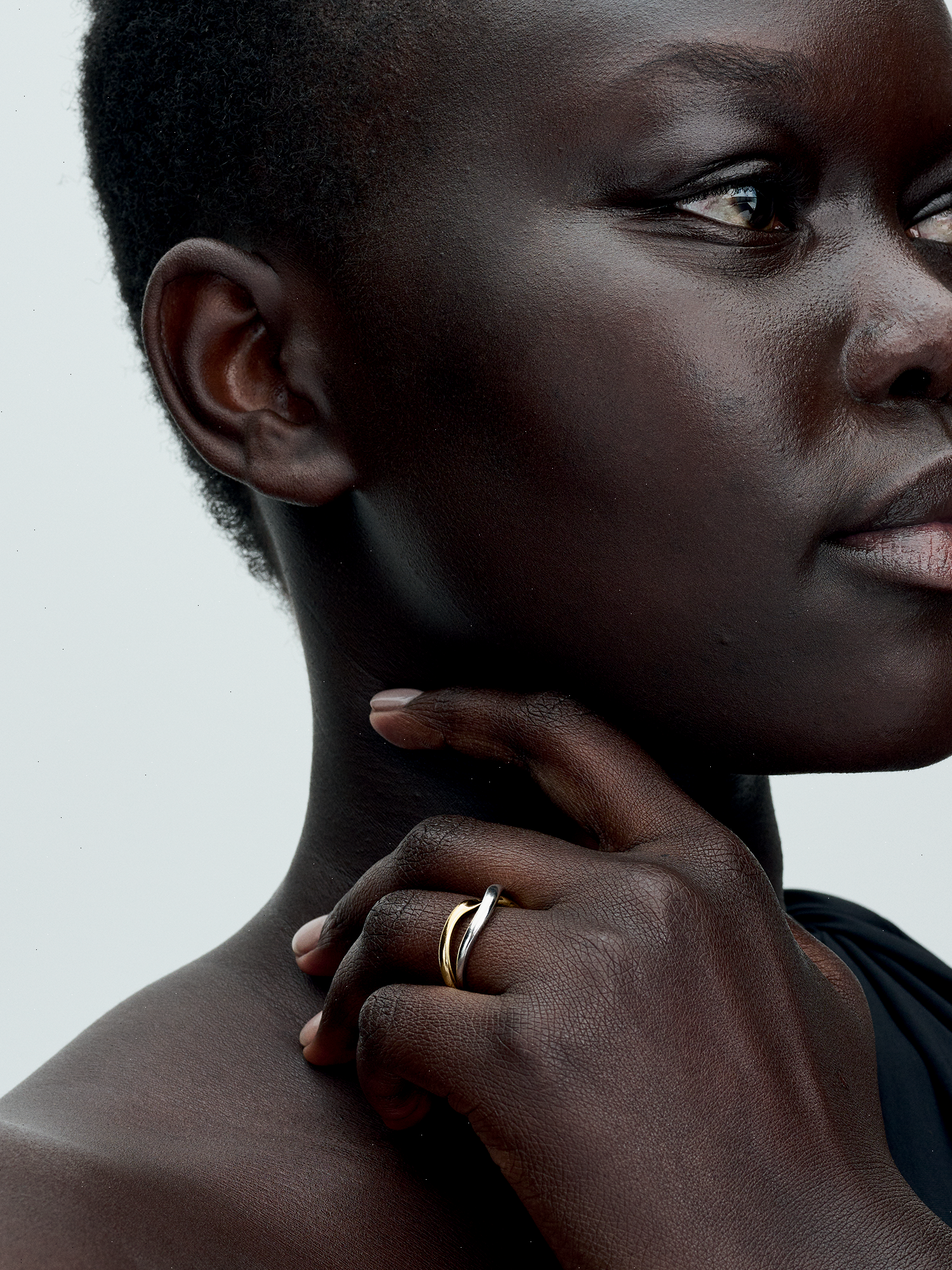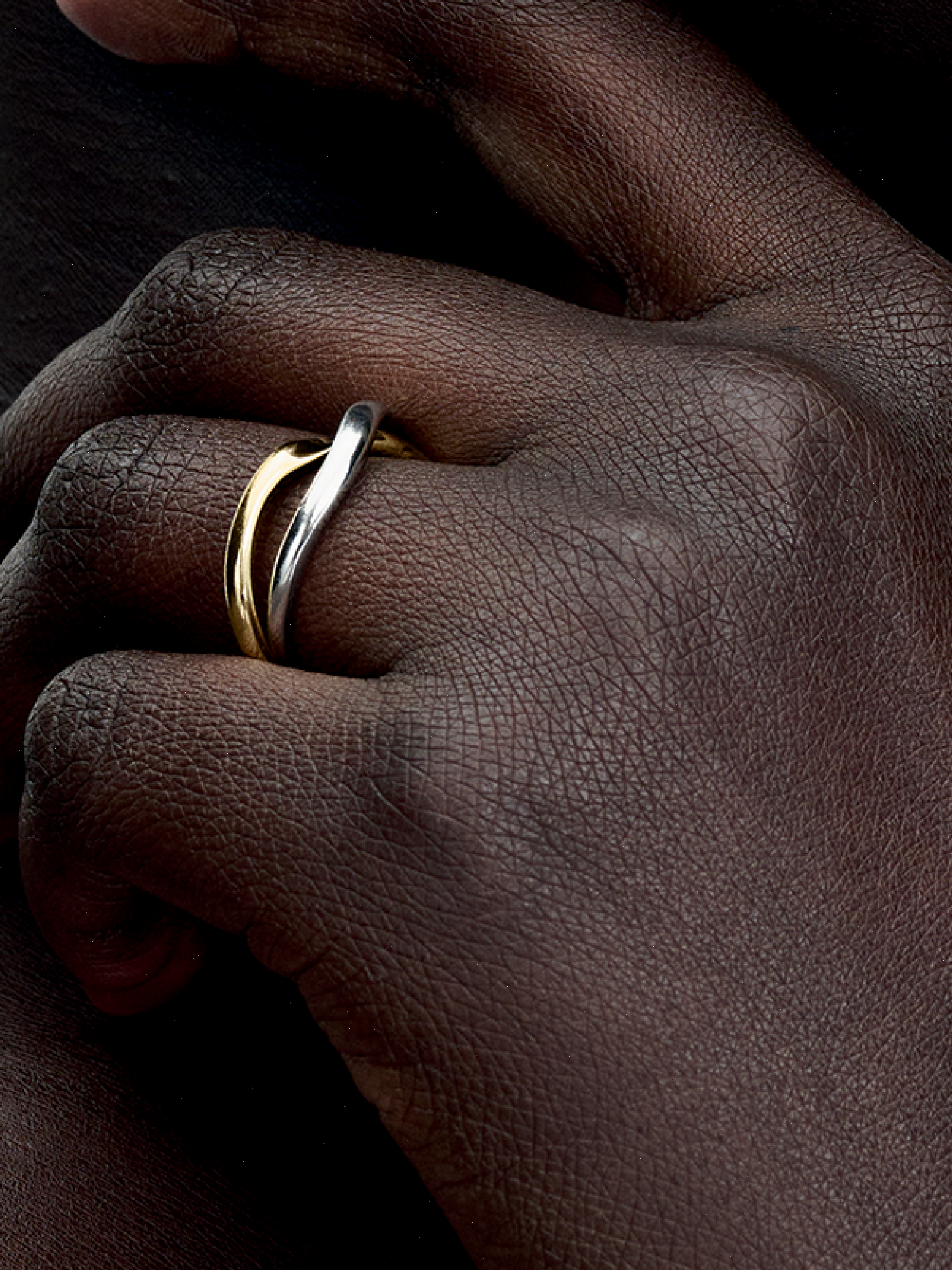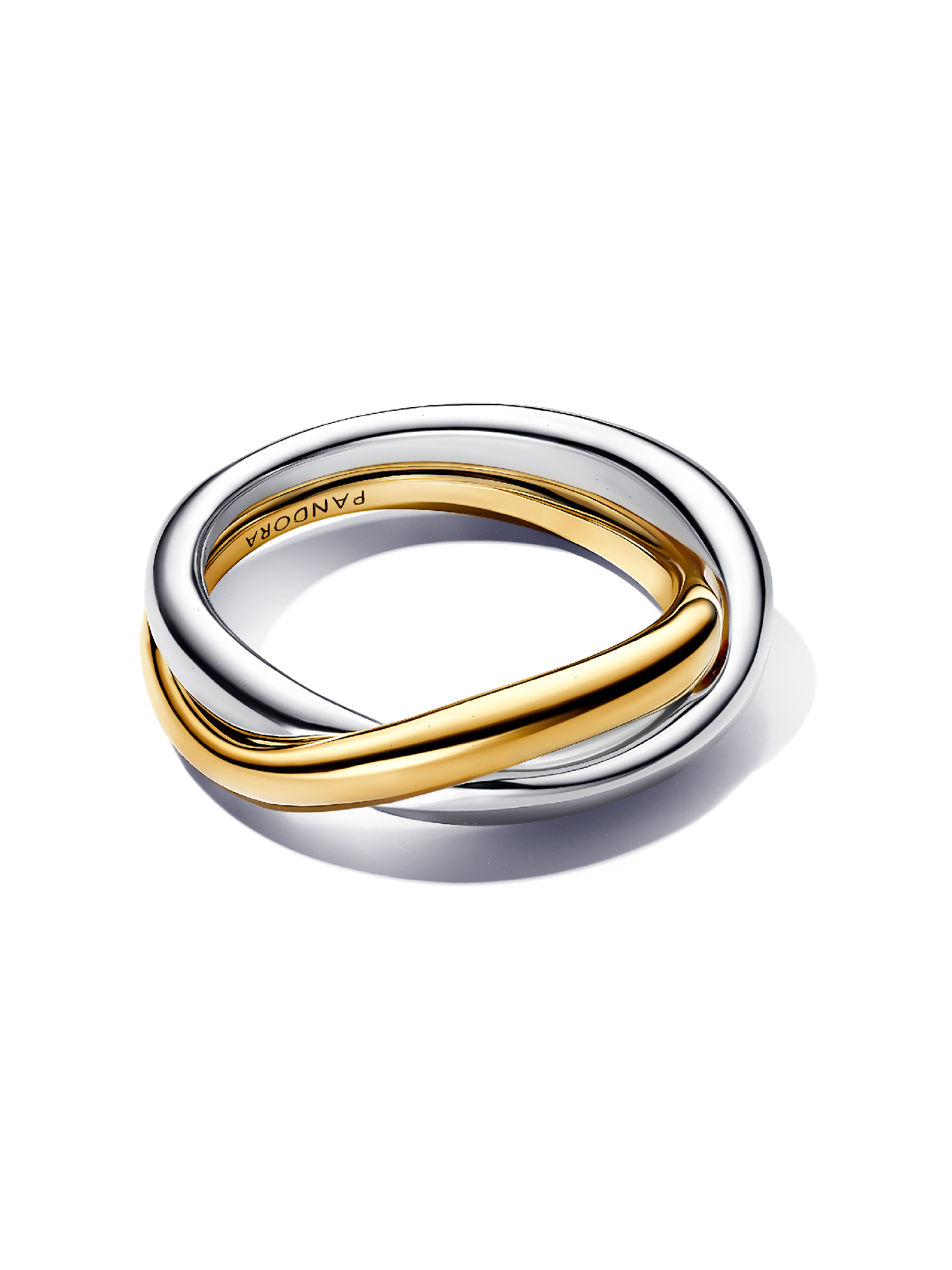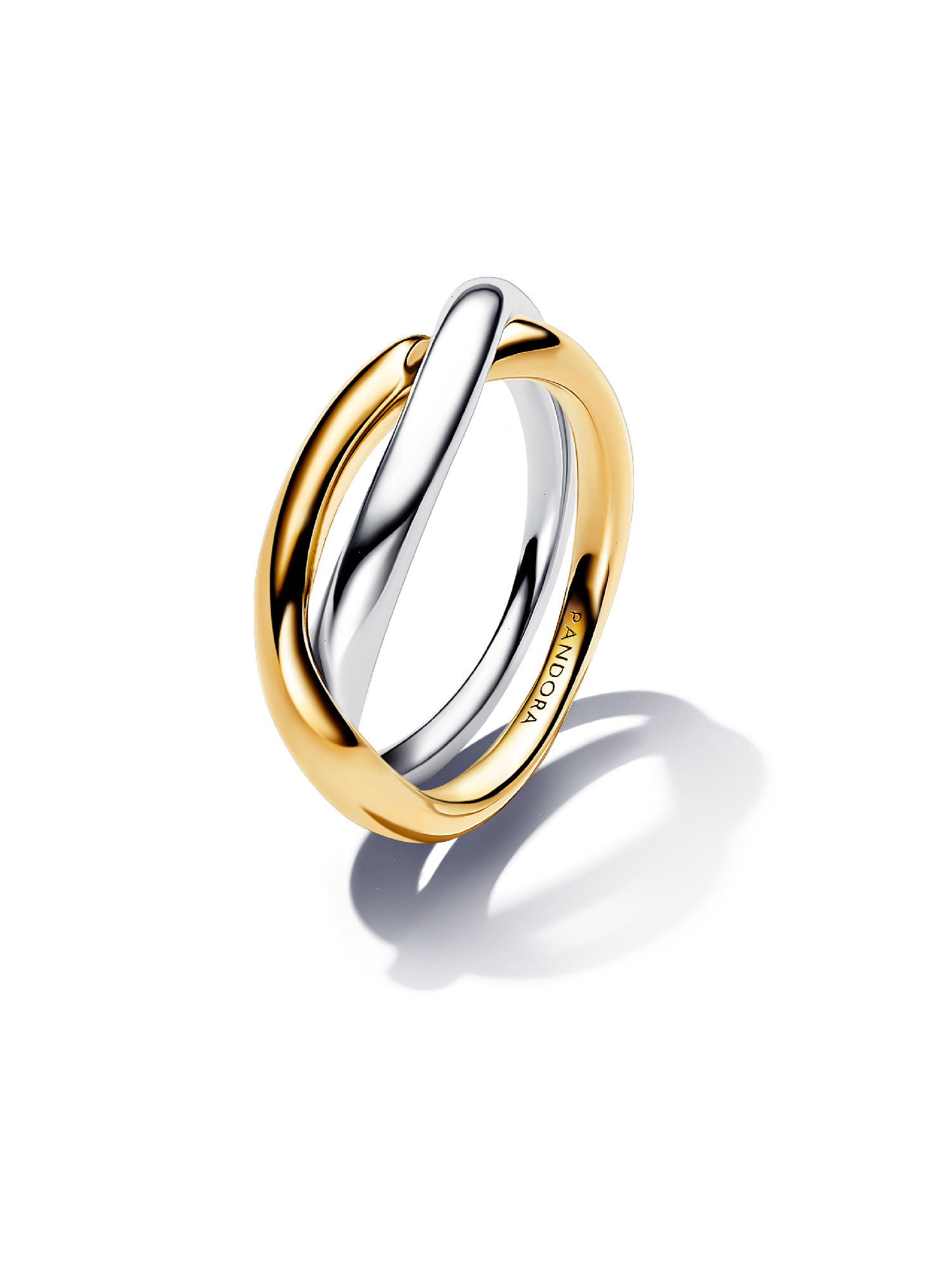Two tones are better than one with the Two-tone Entwined Bands Ring. This ring features two slightly wavy rounded bands – one sterling silver and one 14k gold-plated – that overlap and intertwine with one another. The best part about this sleek, sculptural style is that you don't have to choose your favorite metal because it features both, making it an extra versatile addition to your own collection or as a gift for a loved one.
