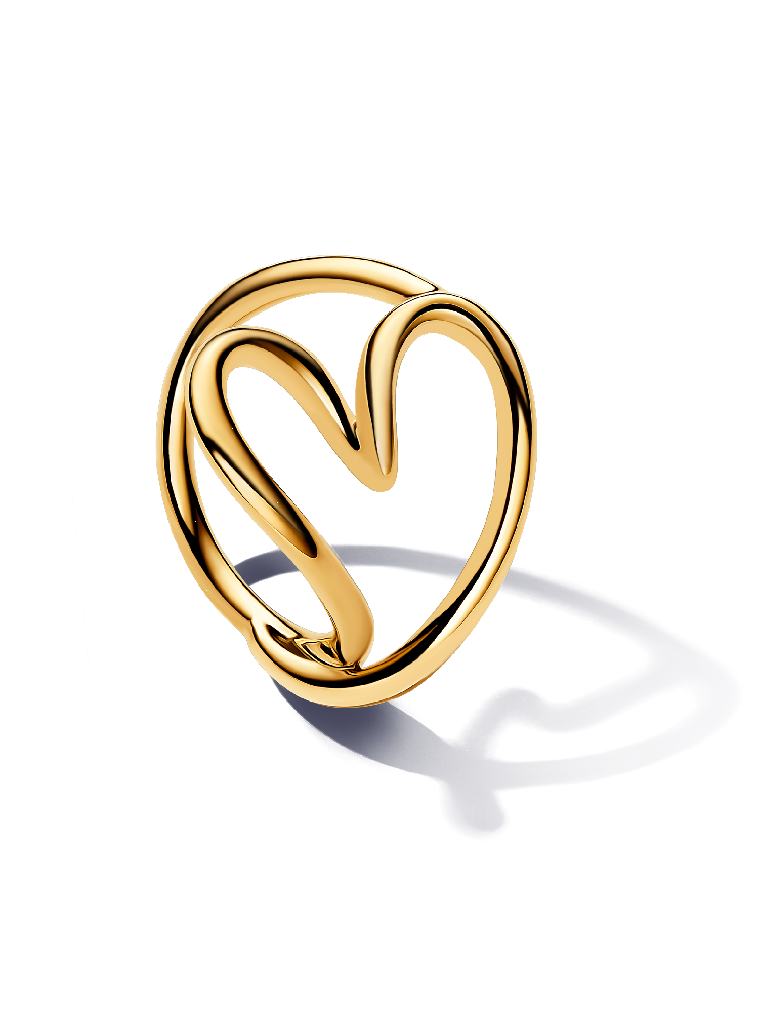 Bring love and nature together with the Organically Shaped Heart Ring. A subtly wavy 14k gold-plated band splits into an imperfectly-shaped openwork heart that follows the finger horizontally at the front. When worn, only the middle part of the heart touches the finger while the rest of the ring is raised. Designed in a slightly scaled-up size, this sculptural heart ring makes a sleek and modern statement and pairs beautifully with other warm-toned minimalist styles.