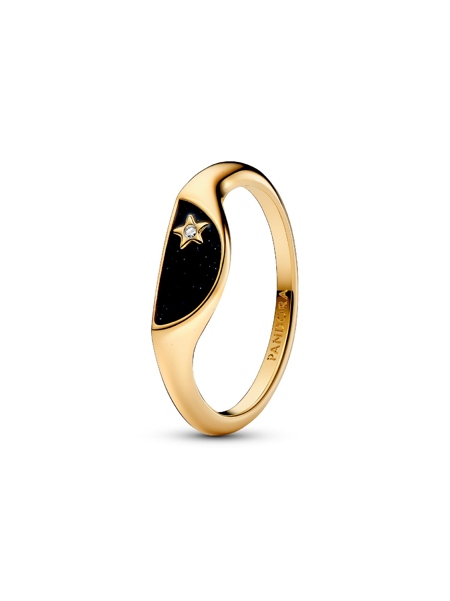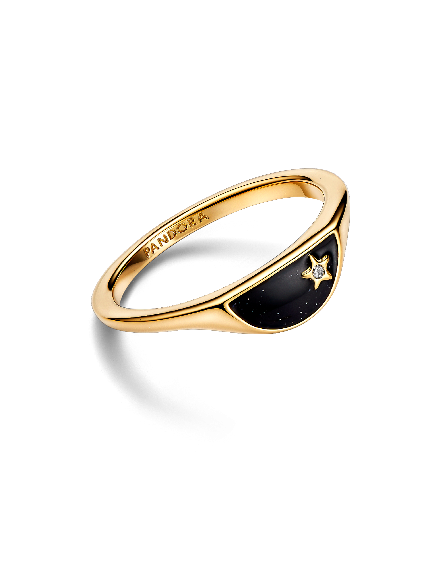 Invoke the power of opposites when you wear the Pandora ME Halved Enamel Signet Ring. A 14k gold-plated ring features a semicircle with a raised star – which has a sparkling stone set at its center – surrounded by glittery black enamel. Wear this black-and-gold ring alone or with the Pandora ME Halved Enamel Signet Ring in sterling silver, which is designed to fit together with this ring and place the stars opposite one another.
