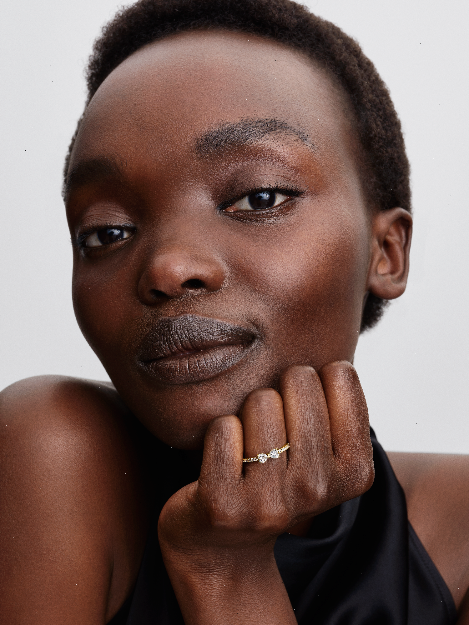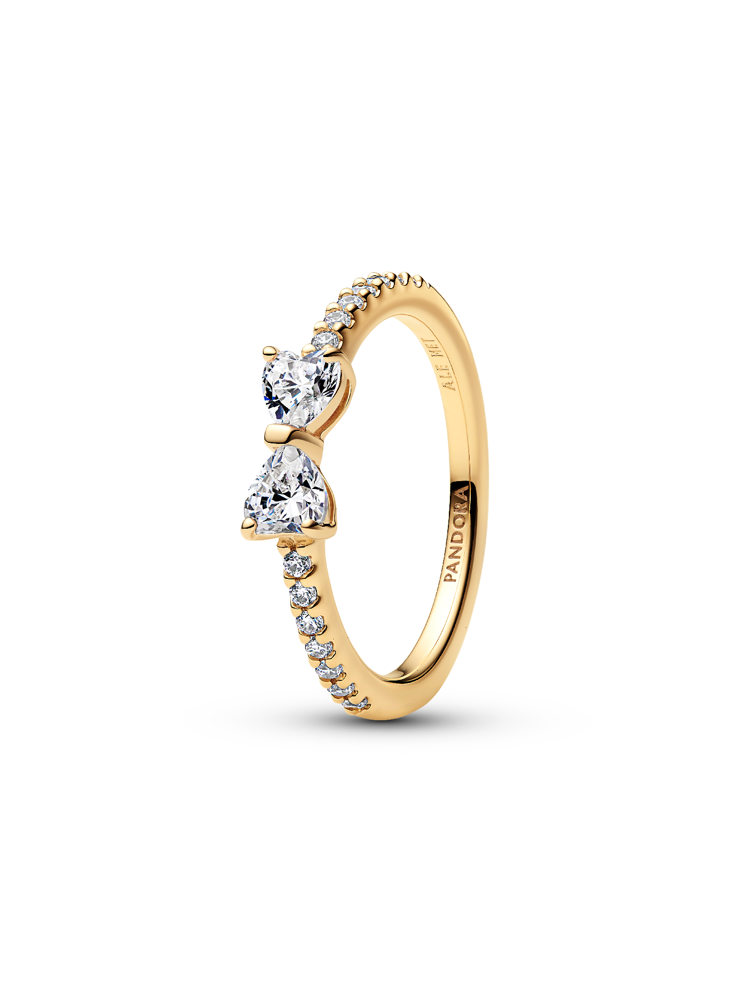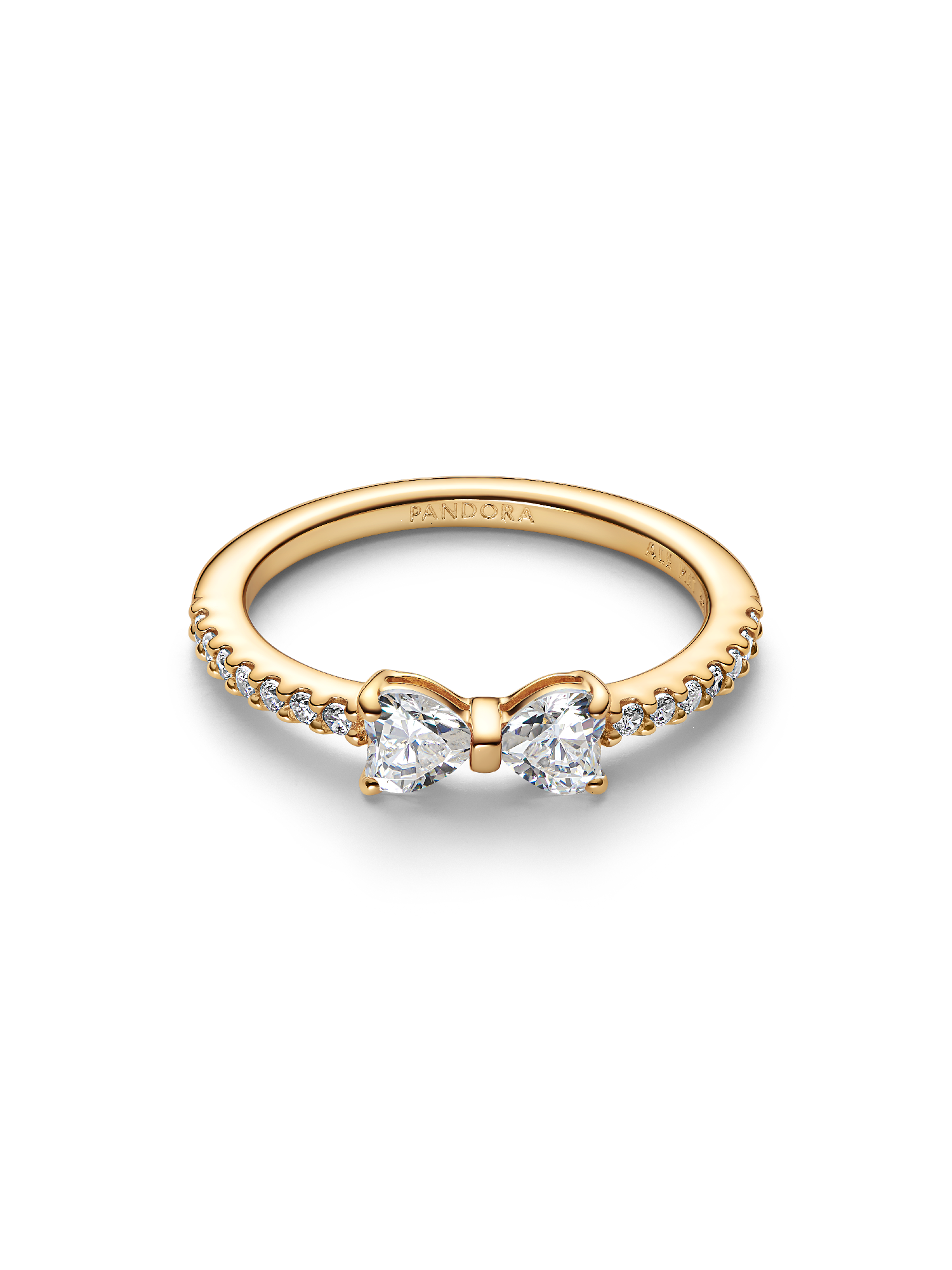 A dainty bow design formed by two heart-shaped stones sits at the centre of this sparkling ring, blending sweetness and elegance for a striking look.