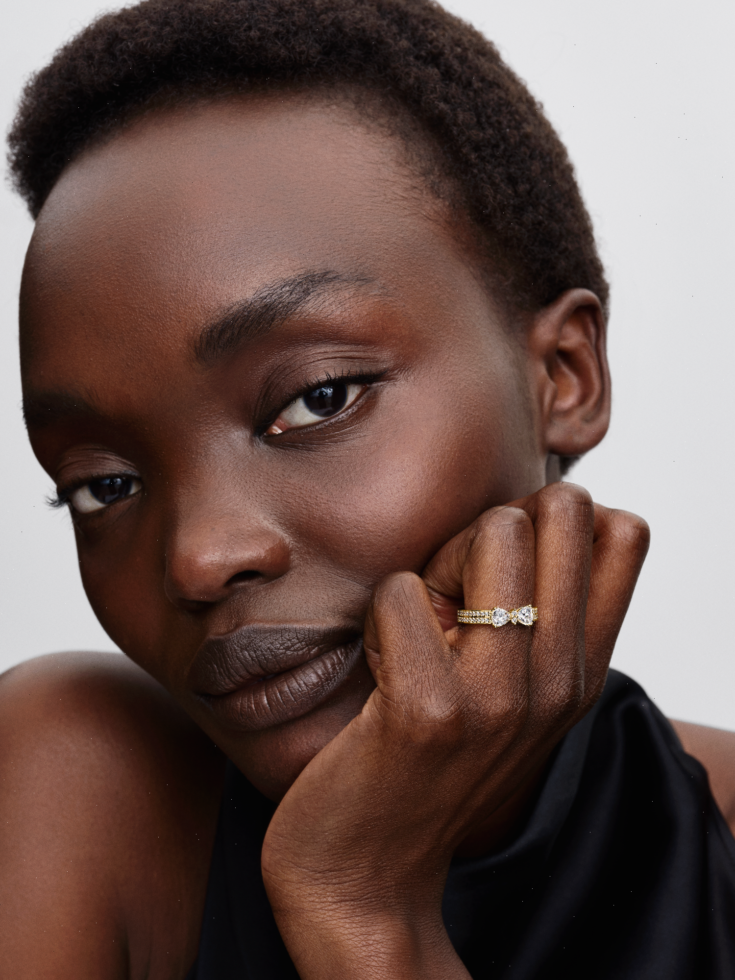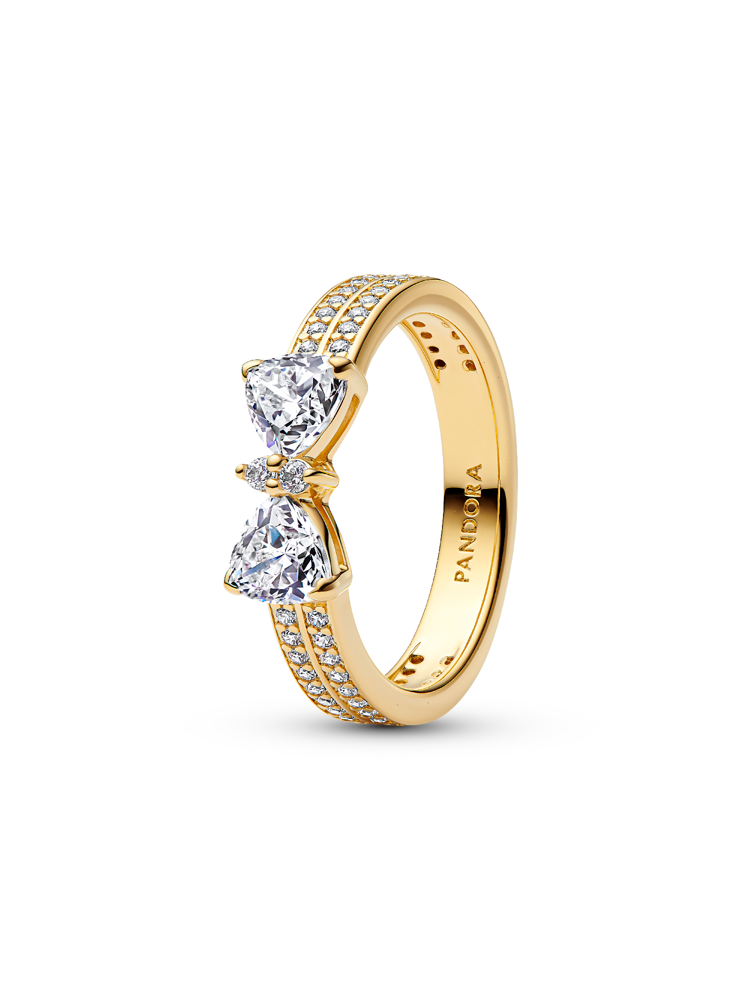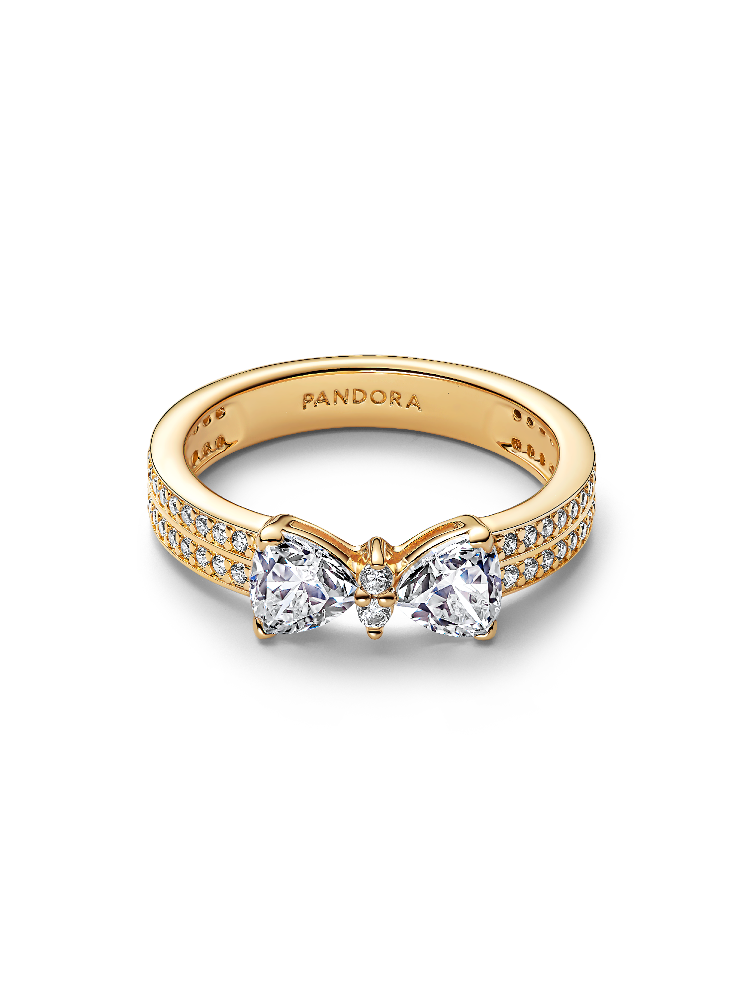 This eye-catching ring features a contemporary bow motif surrounded by cubic zirconia, accented by a double row of pavé stones. Perfect for adding a touch of shine to any outfit.