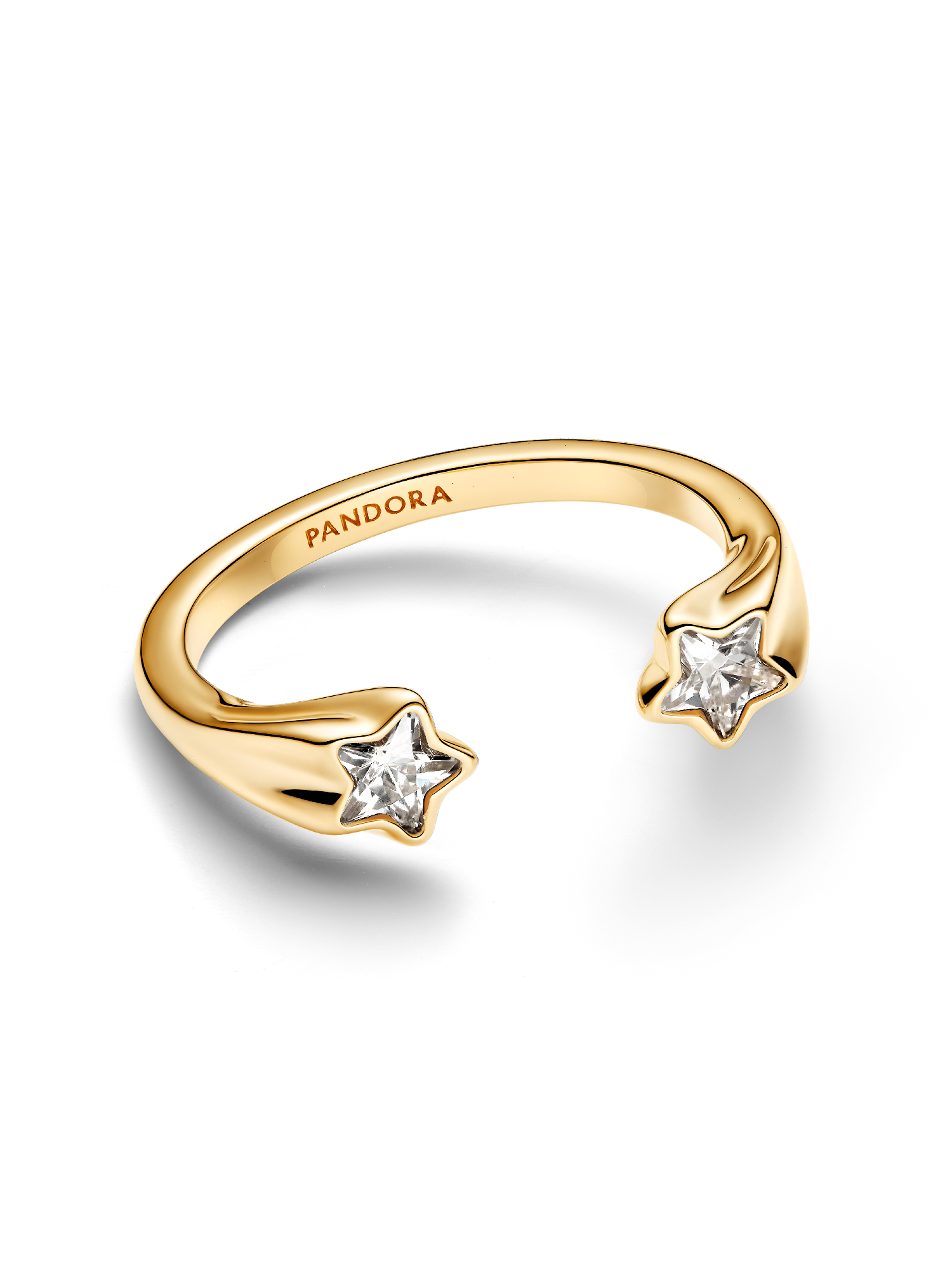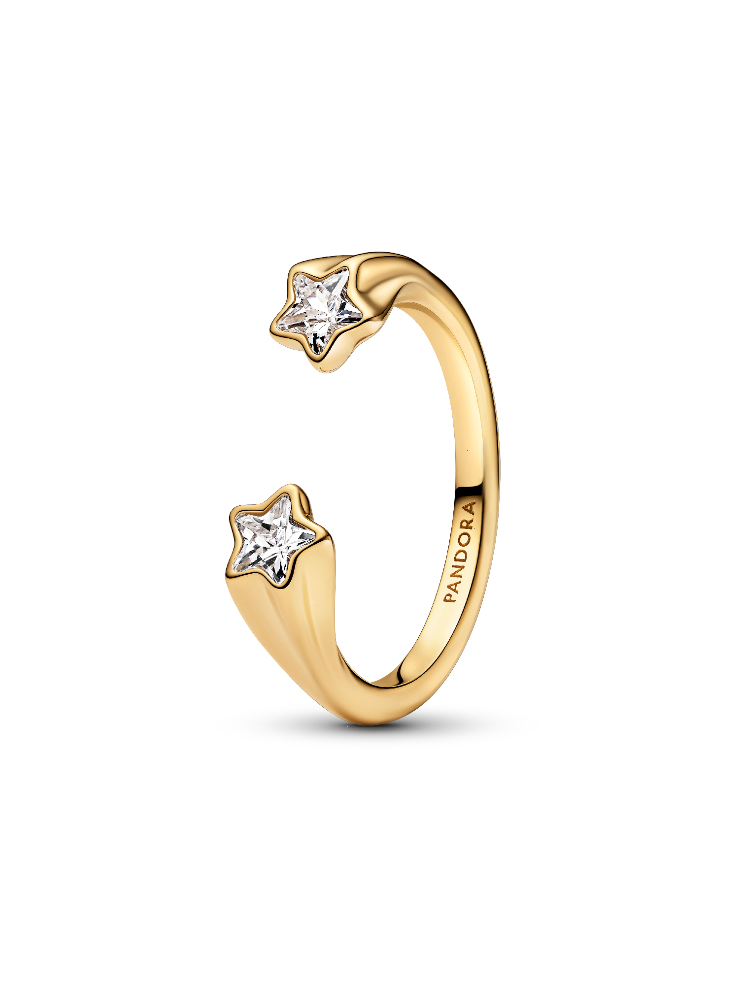 Elevate your style with the Shooting Stars Open Ring, crafted from our 14k gold-plated unique metal blend. This eye-catching piece features two star-cut clear cubic zirconia, each positioned at the ends of an open band adorned with a delicate shooting stars motif. Inspired by the idea that the world shines brighter when we’re with loved ones, it’s perfect for stacking with other rings or wearing solo for a celestial statement. Pair it with a simple bracelet for a festive look.