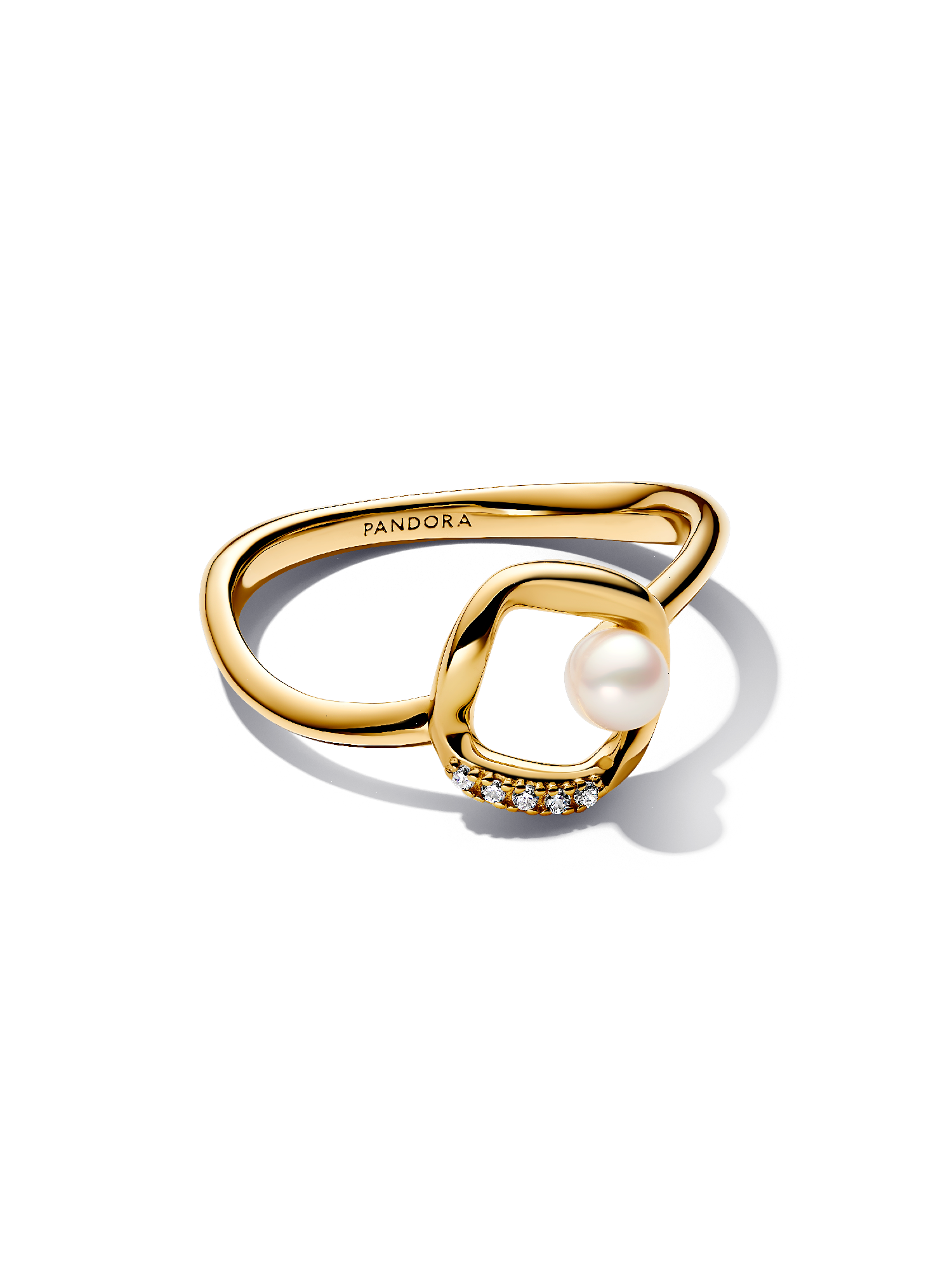 Discover a symbol of freedom and self-expression with this organically shaped circle ring, paved with clear cubic zirconia and adorned with a treated freshwater cultured pearl, perfect for those who embody creativity and playfulness.