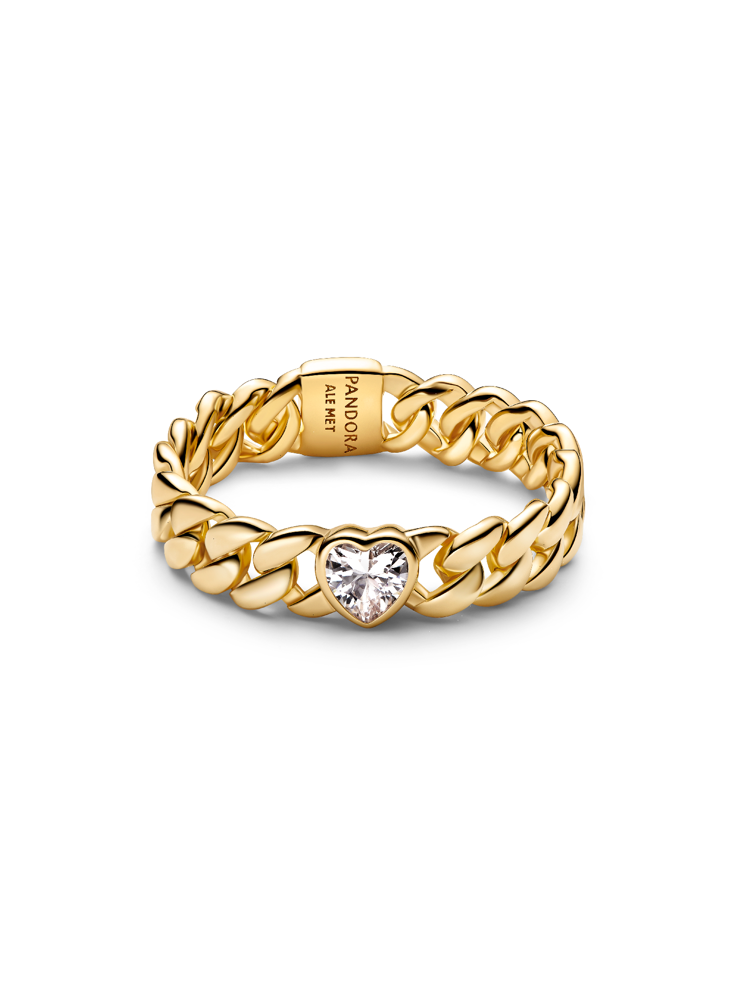 Go for bold. Our 14k gold-plated Cuban chain ring features one bezel-set heart-shaped cubic zirconia, blending modern romance with effortless edge.