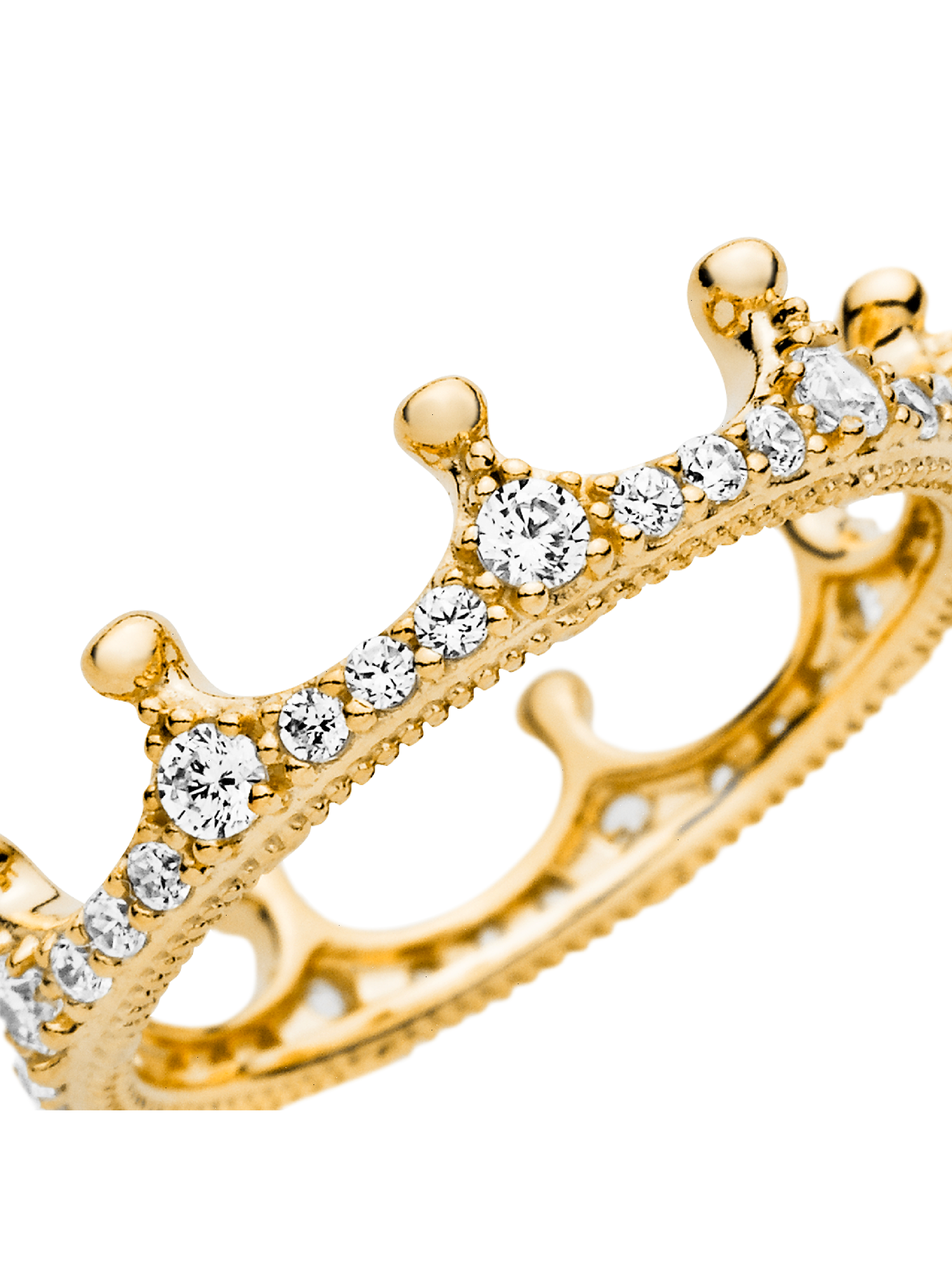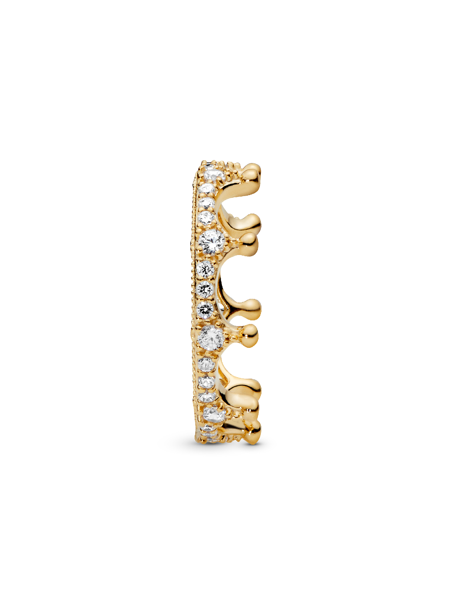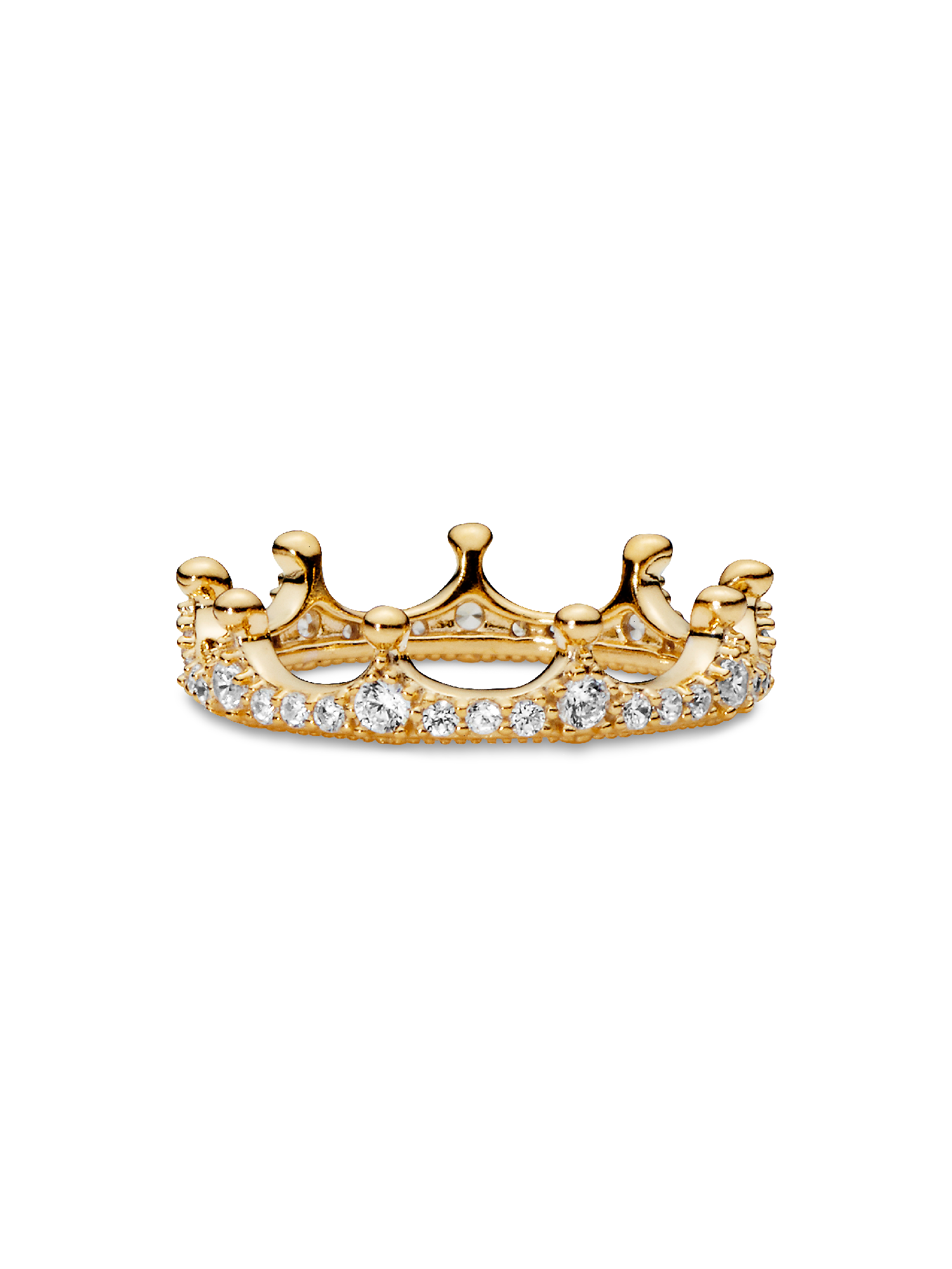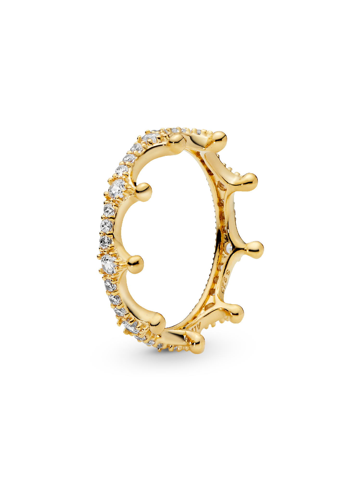 Our Pandora Crown Ring proves you don't have to be royal to dress like a queen. In a 14k gold-plated finish, the regal piece is set with sparkling stones that catch the light with your every move. Let your style reign free on your fingers and stack it together with similar pieces in different metals. You can even wear two of these on one finger, aligning the straight or pointed edges for a mirror image effect.
