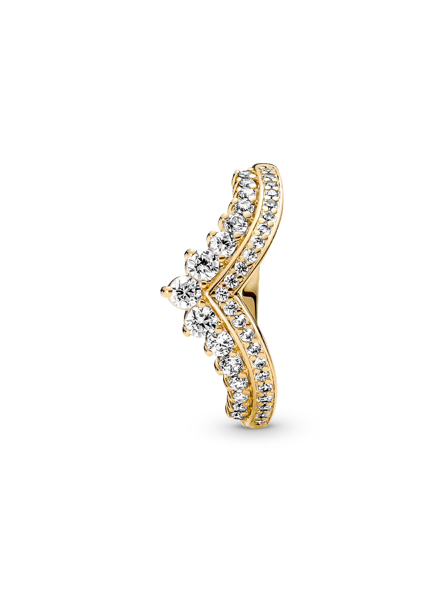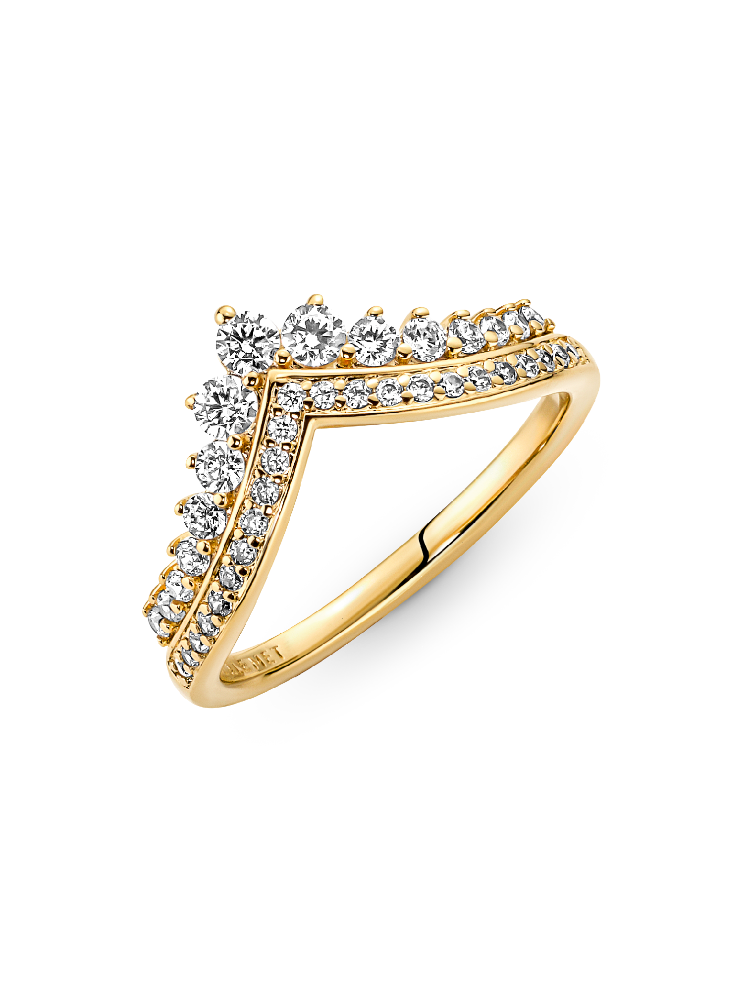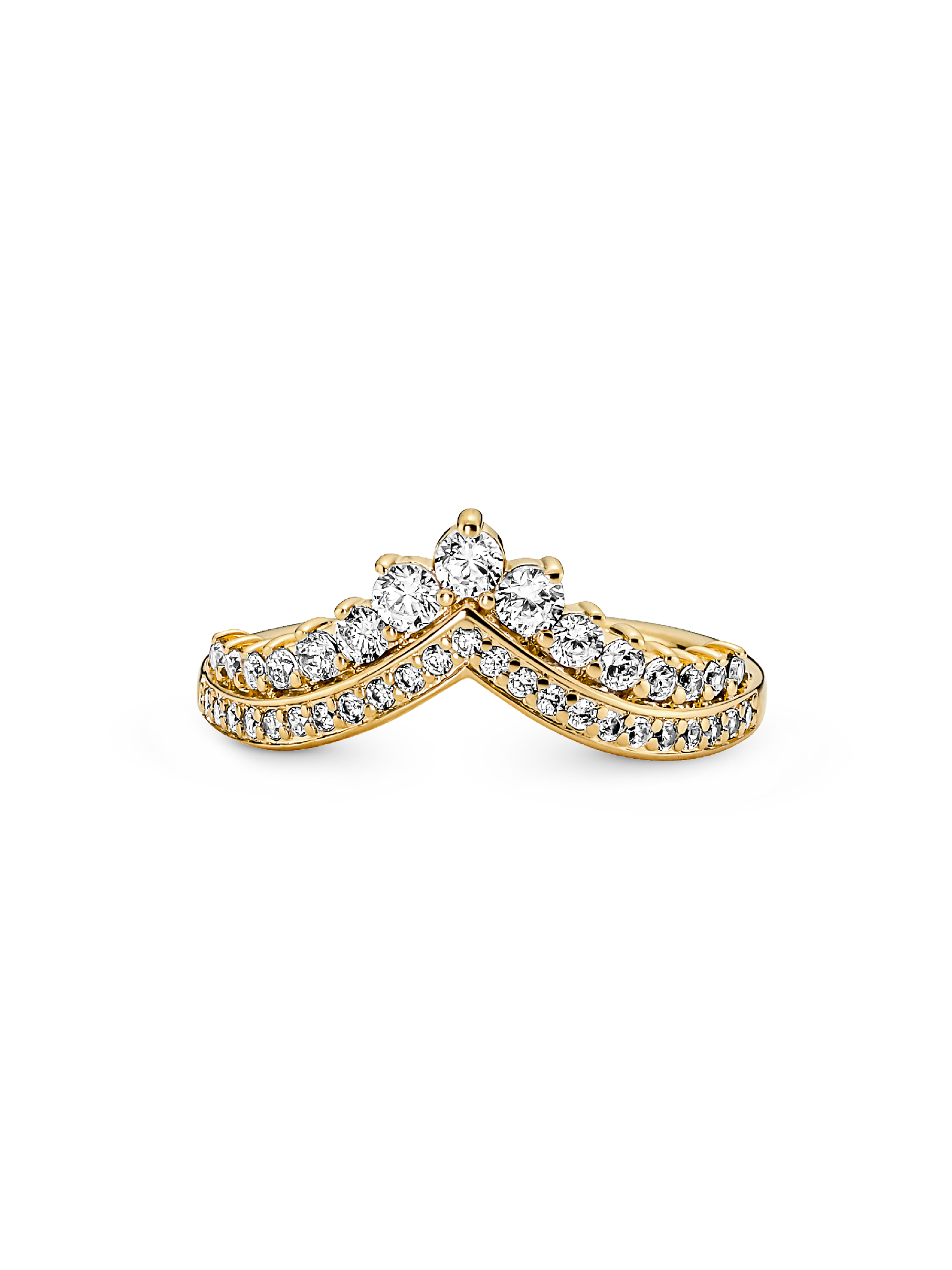 Let even more radiance into your ring styling with this glittering tiara ring, fit for a modern-day princess. Inspired by royal headpieces from across history, this 14k gold-plated wishbone ring will add a regal feel to your everyday looks. Set with rows of glittering cubic zirconia in classic settings, the chevron-shaped piece is sure to be the crowning glory in any ring stack.