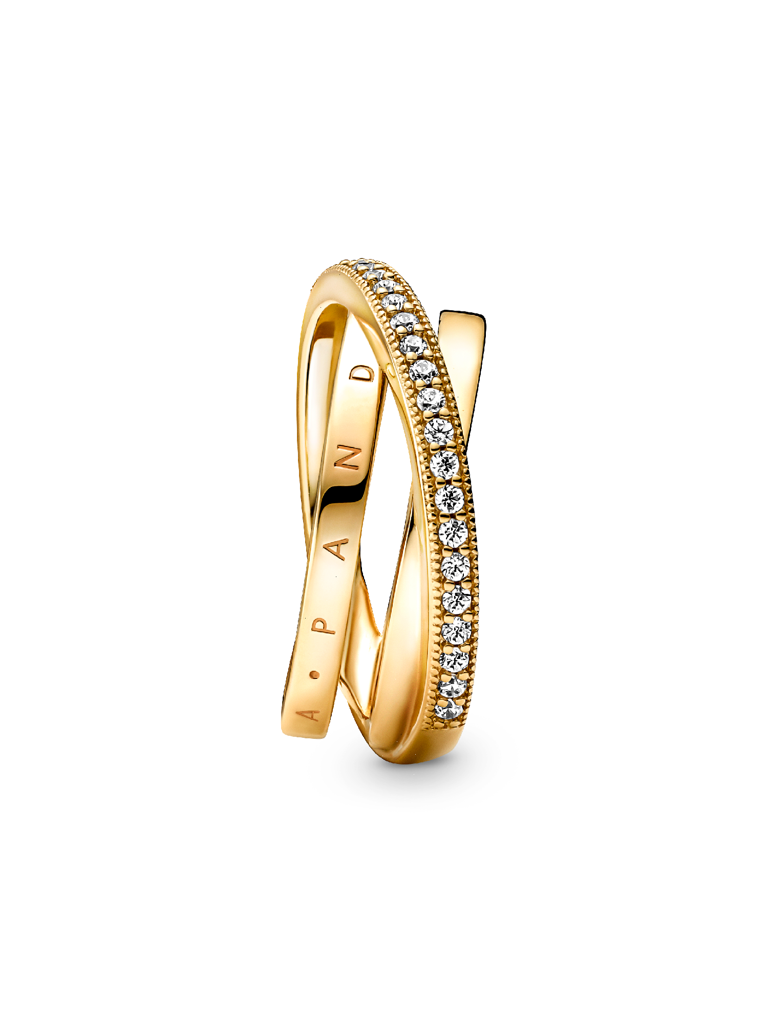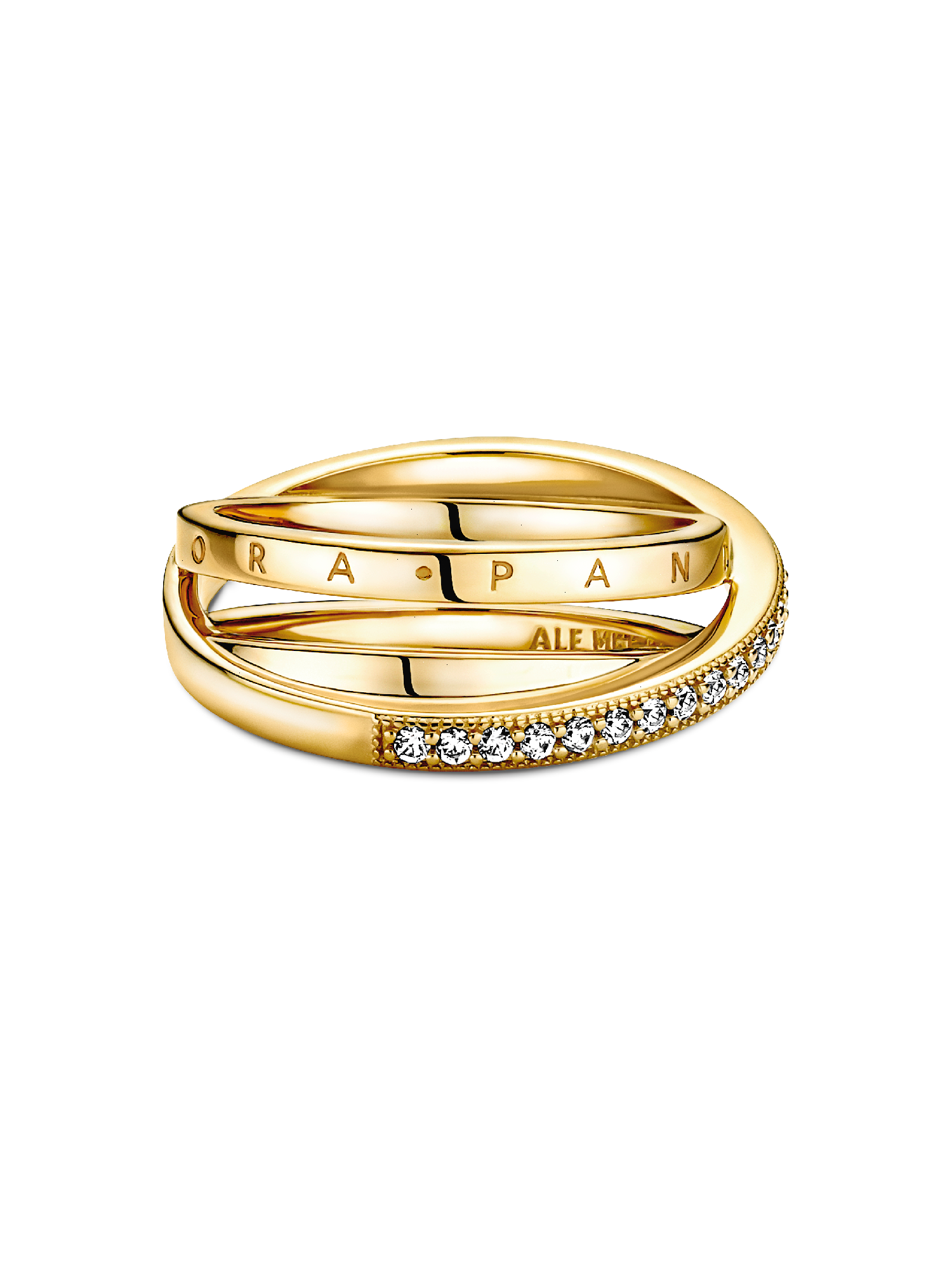Go for linear layers with the Crossover Pavé Triple Band Ring. Hand-finished in 14k gold plating, this ring features three bands, with one diagonally overlapping the other two. One inner band is embossed with the Pandora logo, the other inner band is polished and the outer band features clear cubic zirconia pavé framed by micro-beading. Inspired by the mesmerising structure of the solar system, this ring brings sleek, structural sophistication to any look.