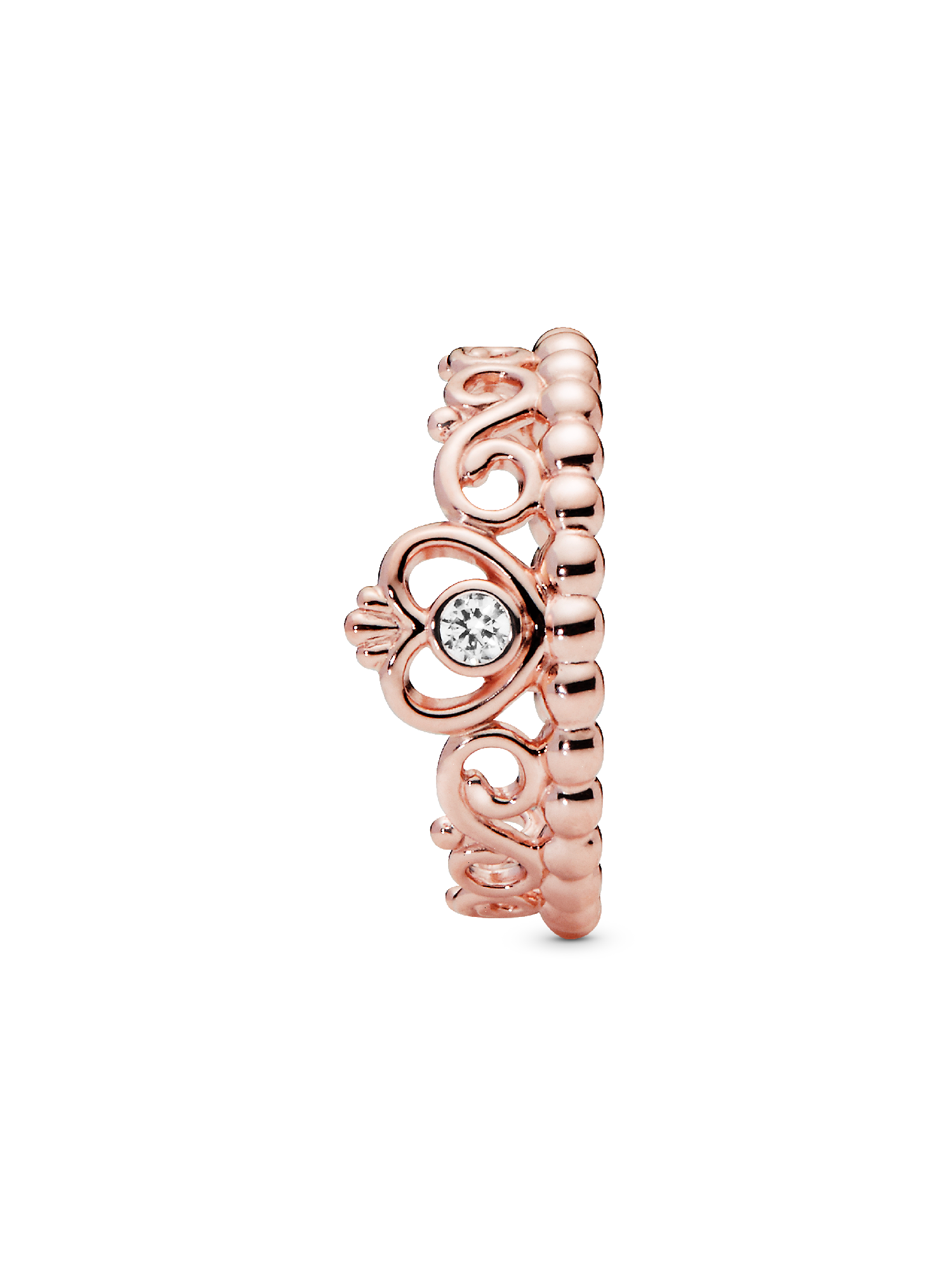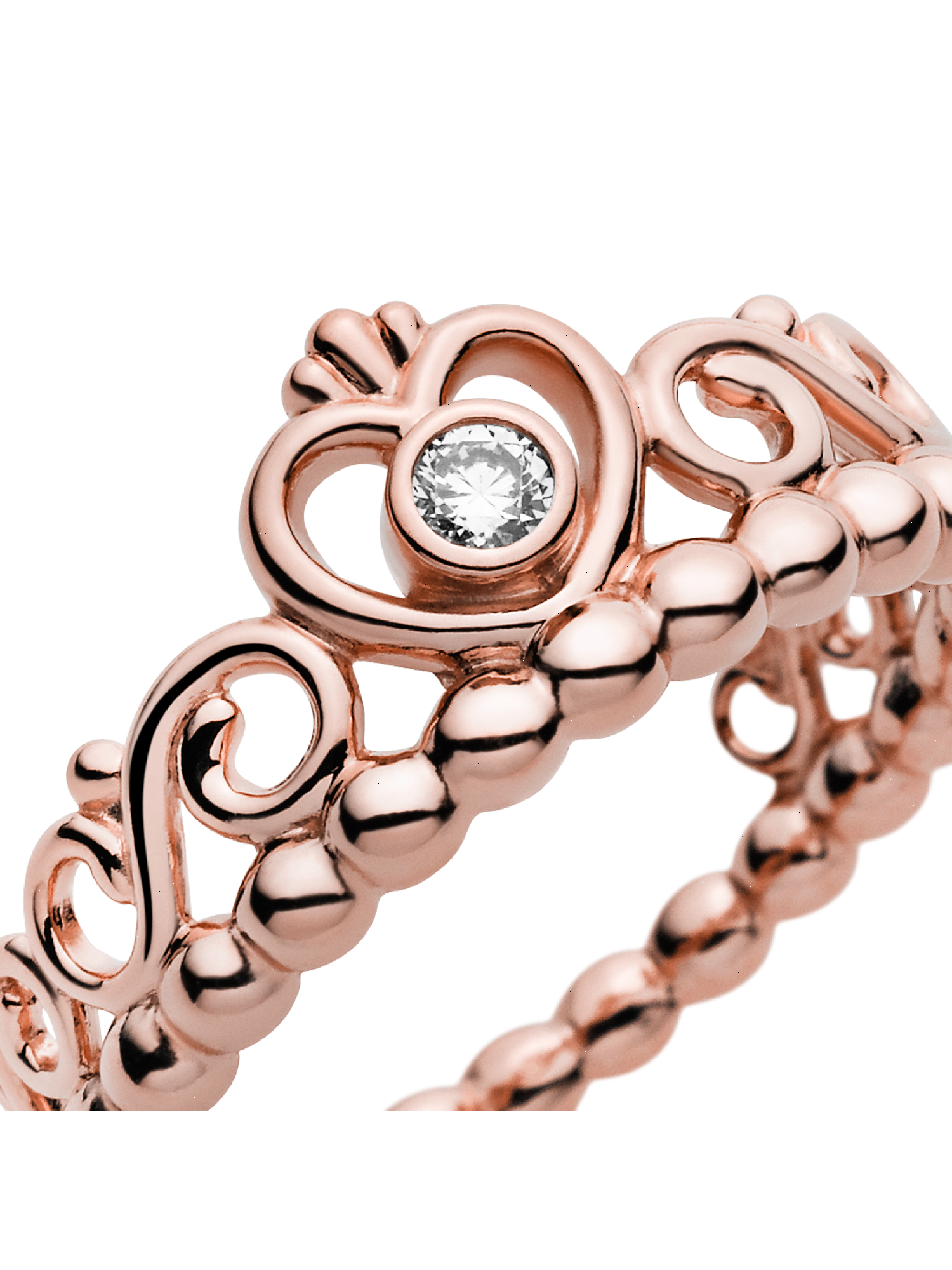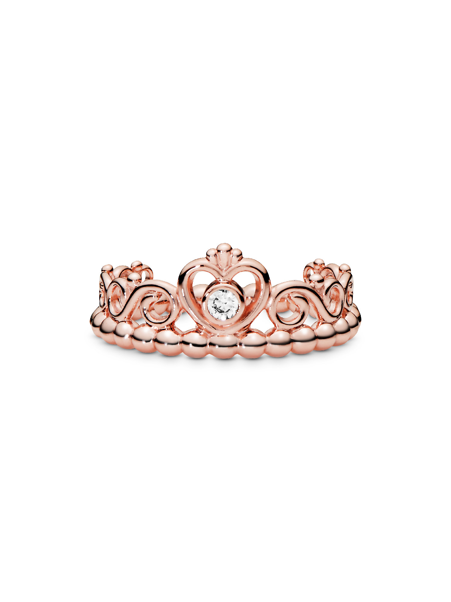 Feel like a princess every day with this magnificent Princess Tiara Crown Ring. Exquisitely plated with 14k rose gold, this enchanting style features a heart-shaped tiara design accented with a single shimmering cubic zirconia stone. Showcase the statement ring on its own or pair it with other Pandora princess rings for a fairy tale finish.