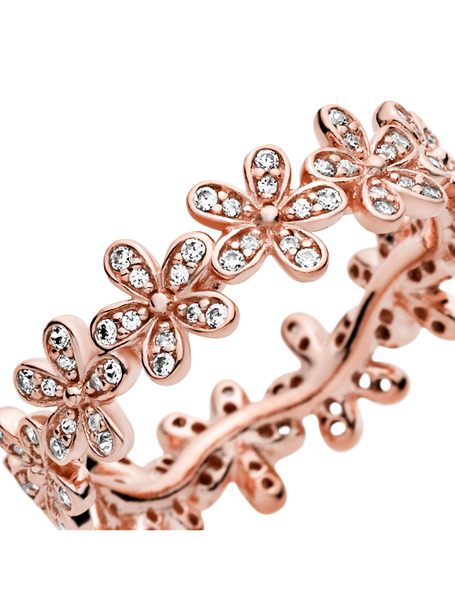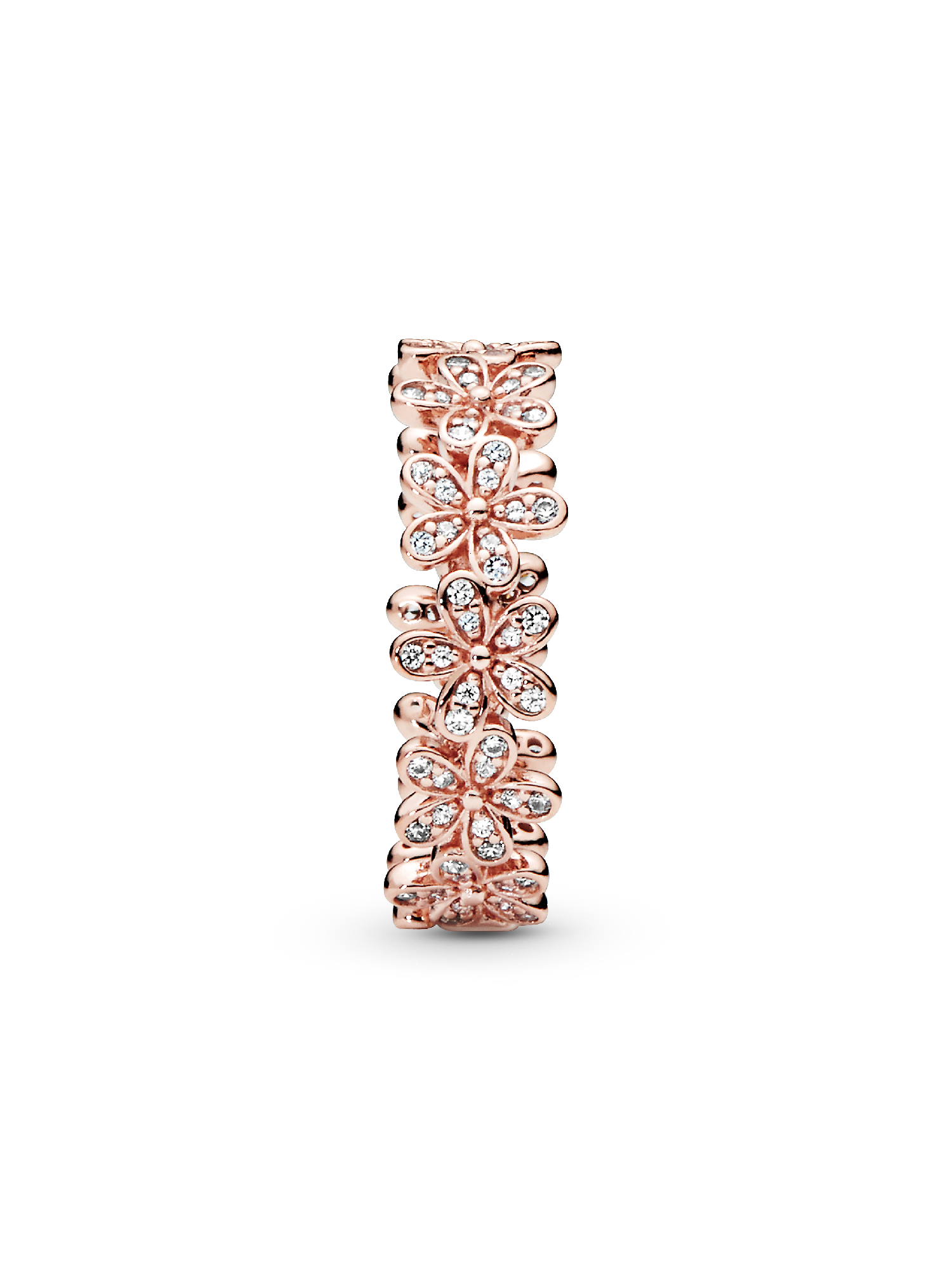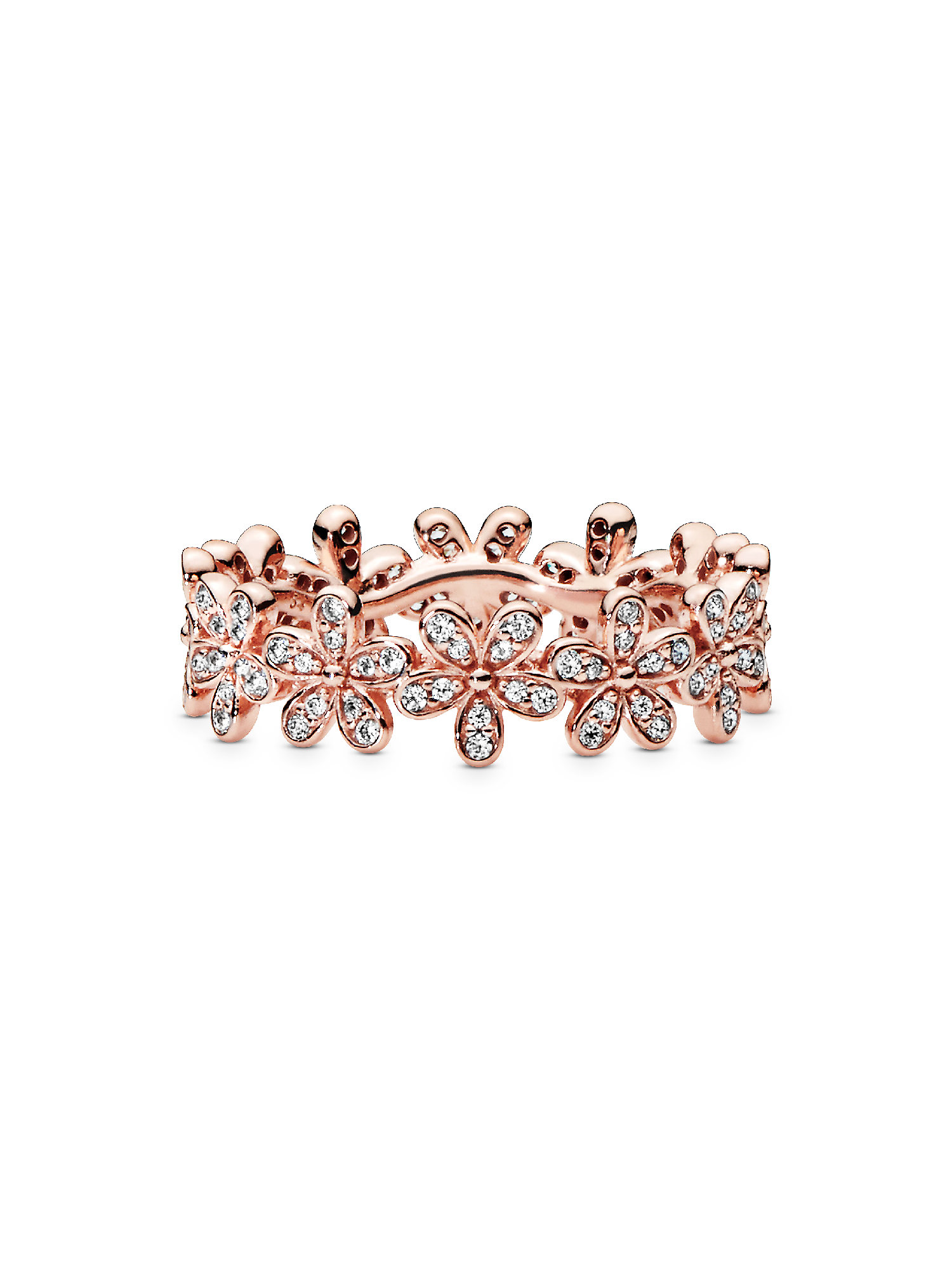 Wrap your finger in flowers with this dazzling Daisy Flower Ring plated with 14k rose gold. Evoking feelings of joy and happiness, the delicate chain of daisies is adorned with shimmering cubic zirconia stones that catch the light. Wear it solo for everyday elegance, or with the Pandora Daisy Earrings and matching necklace for a fabulous floral look.