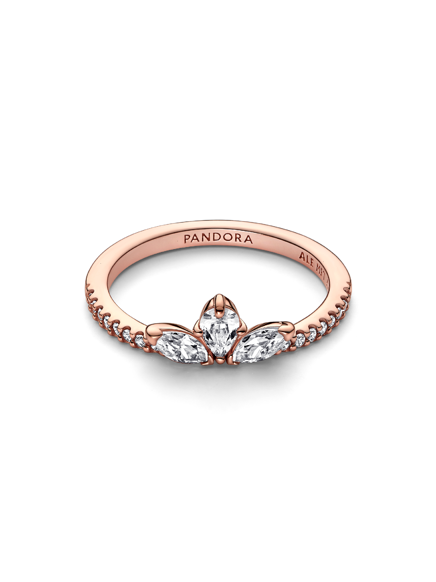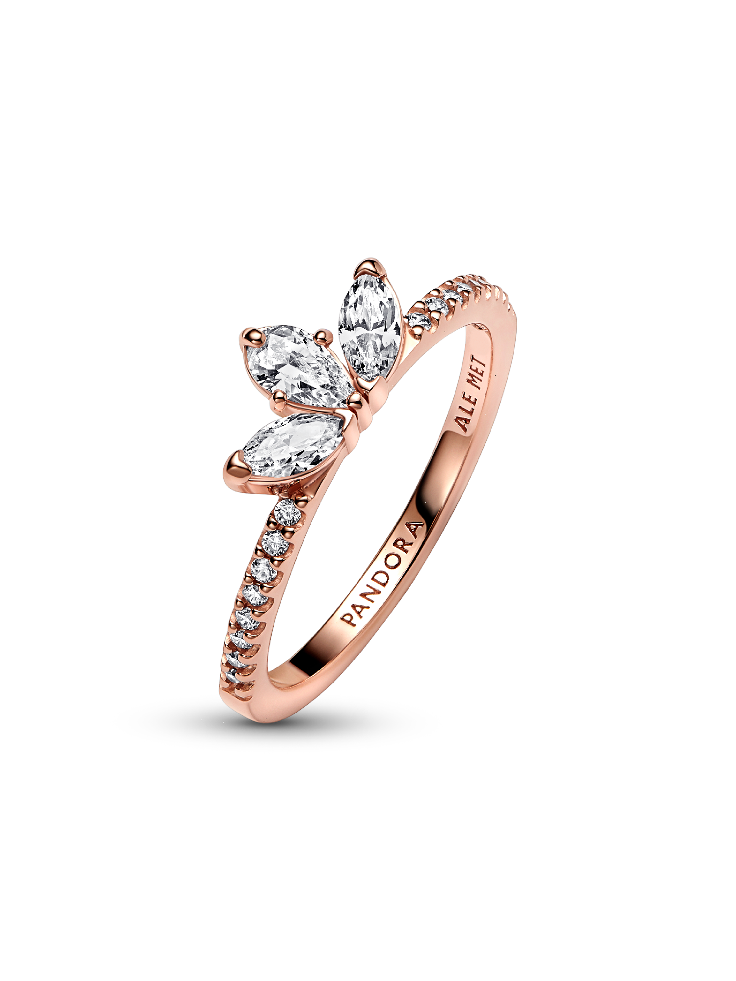 Our Sparkling Herbarium Cluster Ring features three central stones in a petal shape, two marquise-shaped and one pear-shaped. Finished in 14k rose gold plating, this elegant ring is inspired by the beauty of nature, with petal silhouettes that will never go out of style. When styled back-to-back, they form a whole cluster motif, giving an air of completeness to your stack.
