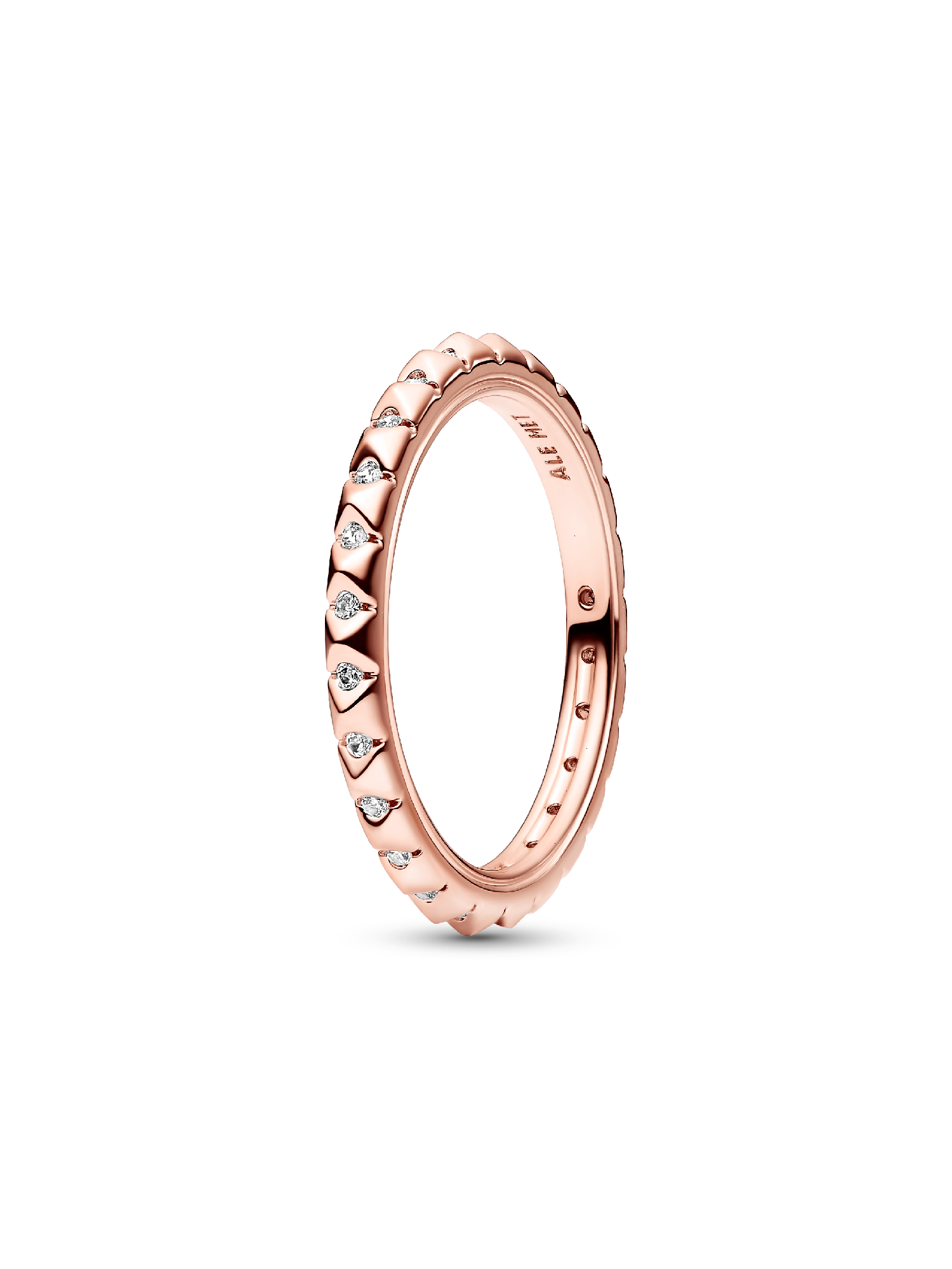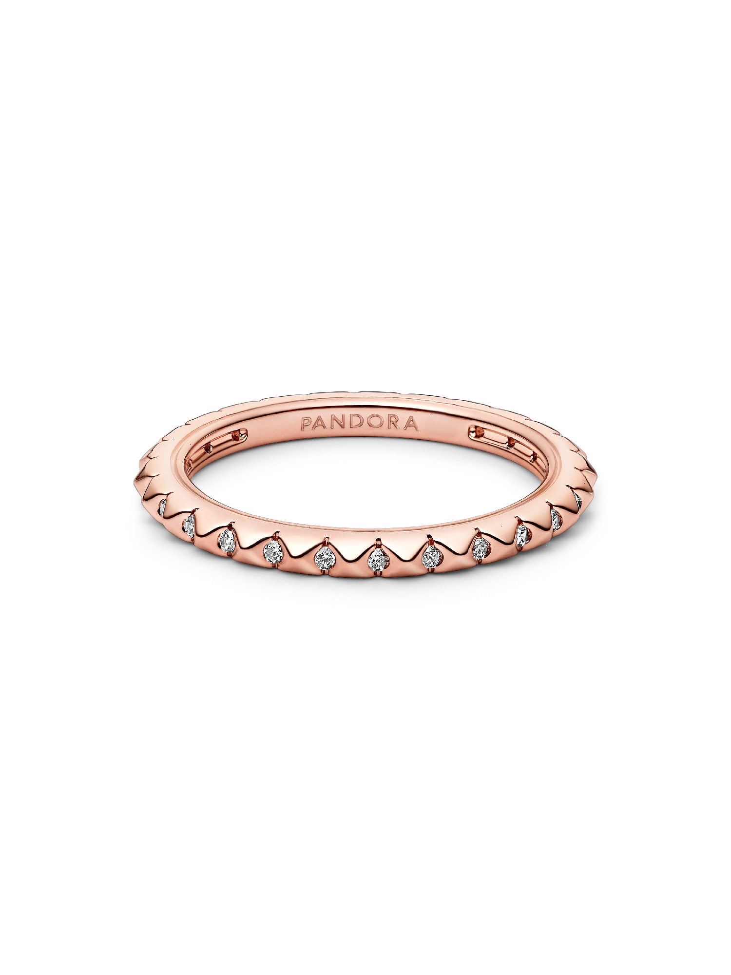 It's rosé all day with the Pandora ME Pyramids Ring. This 14k rose gold-plated ring is punctuated by pyramid studs with clear cubic zirconia stones set between them. A grooved line along the edges of the ring adds a subtle, sleek design detail. Edgy yet elegant, this effortlessly cool piece will become a go-to option that works with everything, inspiring you to customise a fresh look every day.