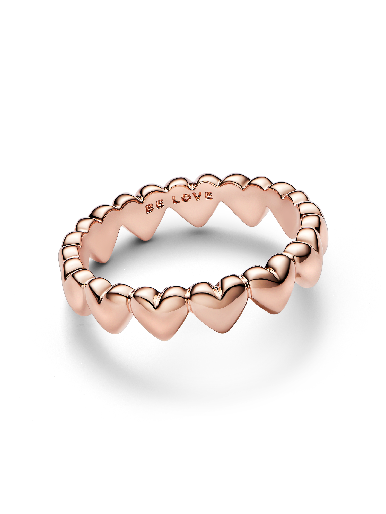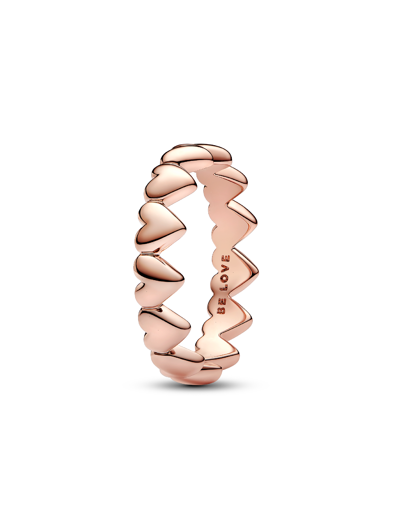 Give a gift from the heart with this 14k rose gold-plated ring. Expertly crafted with a row of hearts making up the band, this romantic design looks equally beautiful worn on its own or layered with contrasting Pandora rings. Give it as a gift for a meaningful way to express your love, or treat yourself to a piece you'll love wearing over and over.