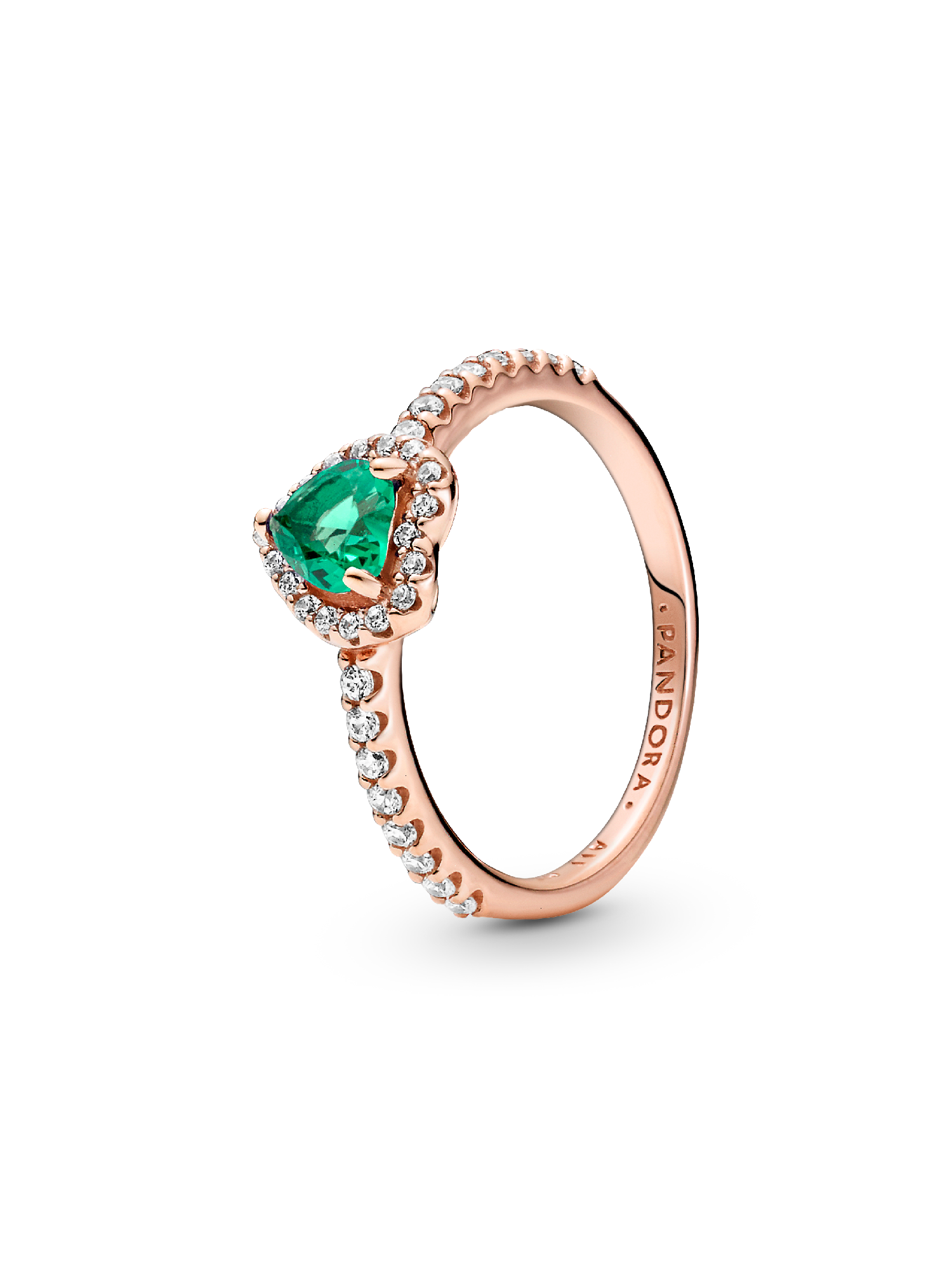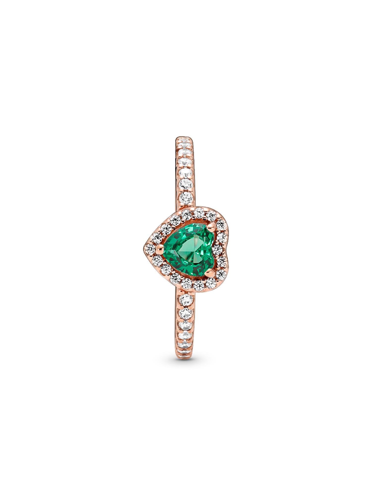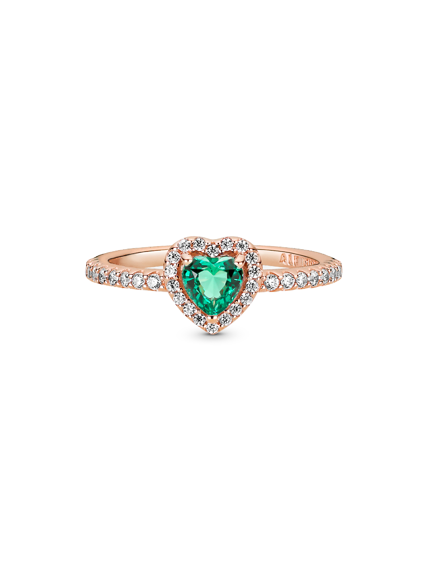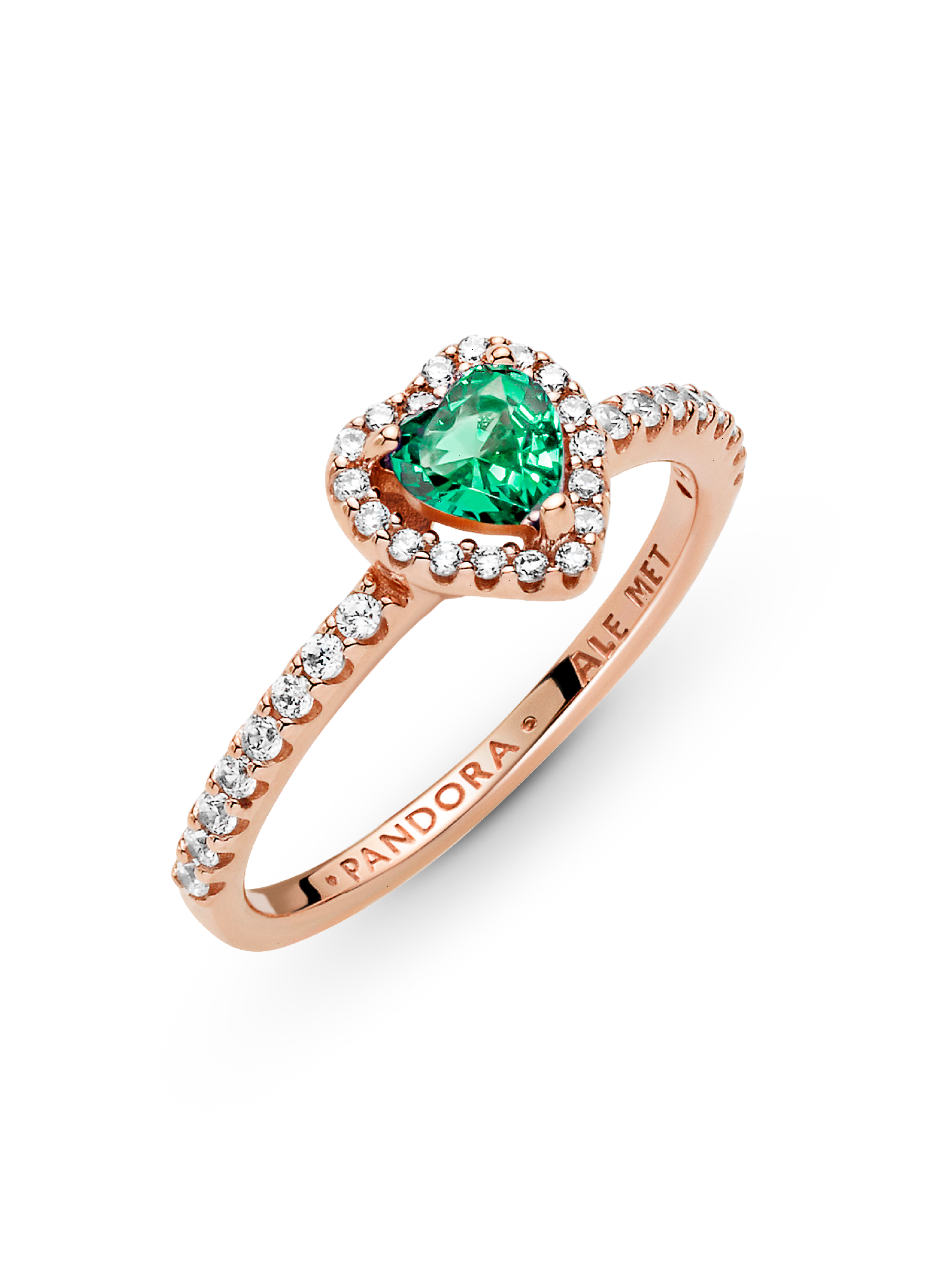 Add a sophisticated touch to your look with the Sparkling Elevated Heart Ring. The ring draws inspiration from the classic Pandora Timeless collection. Hand-finished in 14k rose gold unique metal blend, this piece features a green heart-shaped central, elevated stone. Clear cubic zirconia create the halo and decorate half of the ring band, with the Pandora logo inside the shank. Stack this ring with hand-finished styles in sterling silver for a statement mixed metal look.