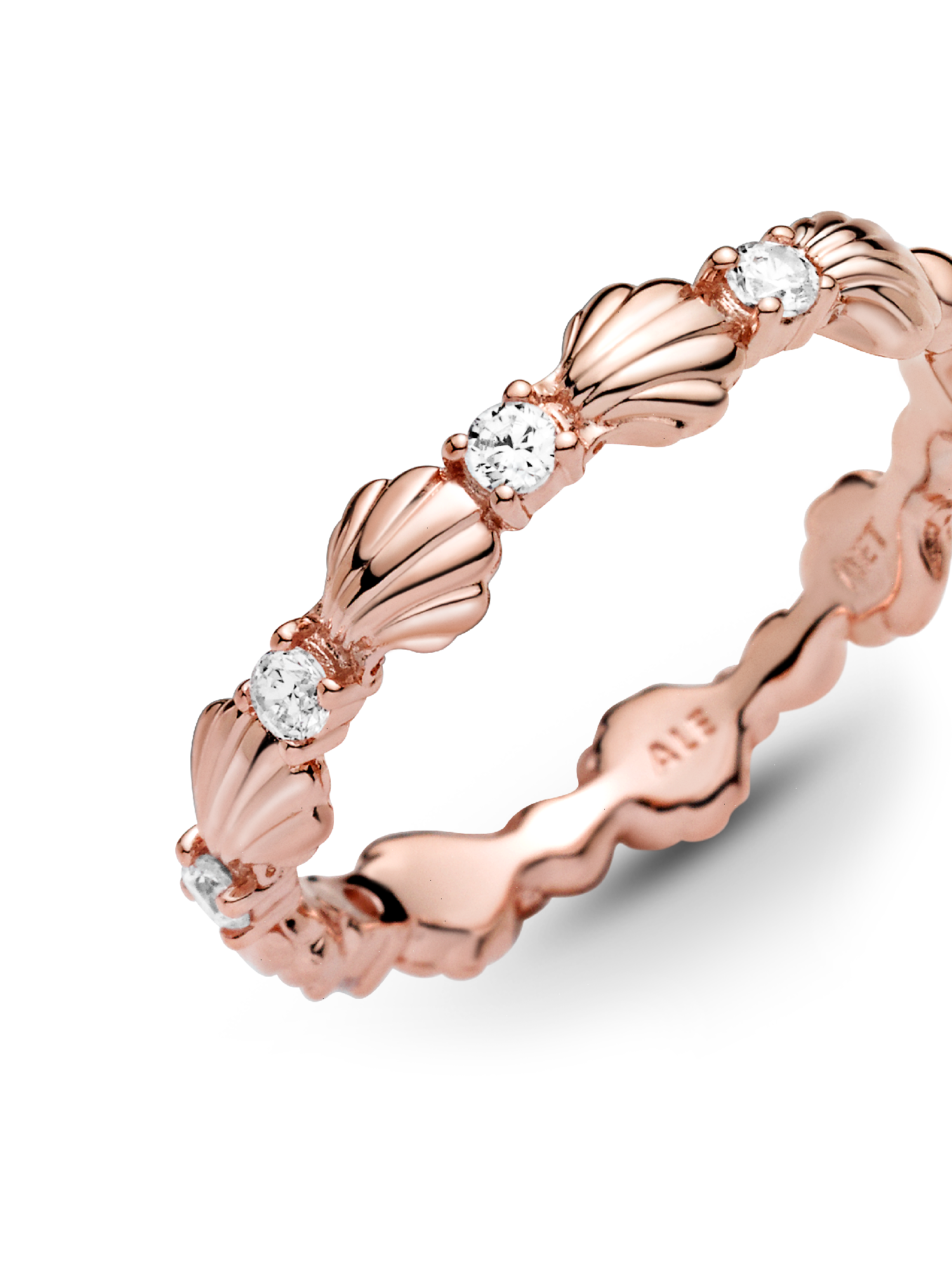 Add the mystery of treasures from the depths of the ocean to any outfit with this Sparkling Seashell Band Ring. Hand-finished in 14k rose gold plating, this seashell ring features five bead-set round brilliant cut clear cubic zirconia set on a line of shells. You can wear it by itself or with other ocean-themed band rings to put the finishing touches on any beach-inspired look.