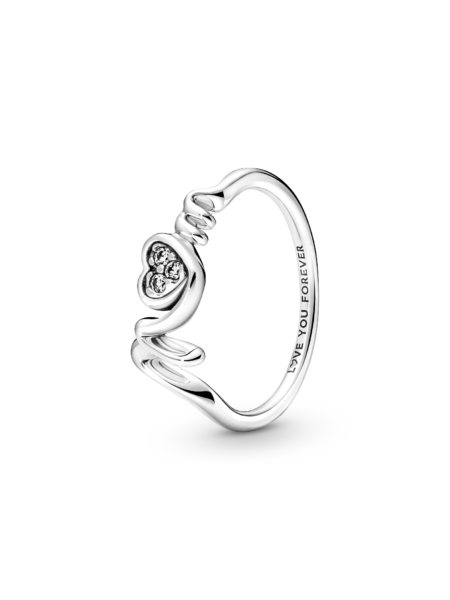 A gift for Mum that says it all. The sterling silver Mum Pavé Heart Ring features a ring shank that flows into "Mum" script with three bead-set brilliant-cut clear cubic zirconia decorating the heart. The engraving on the inside of the ring shank reads "LOVE YOU FOREVER", celebrating the devotion of mothers all over the world.
