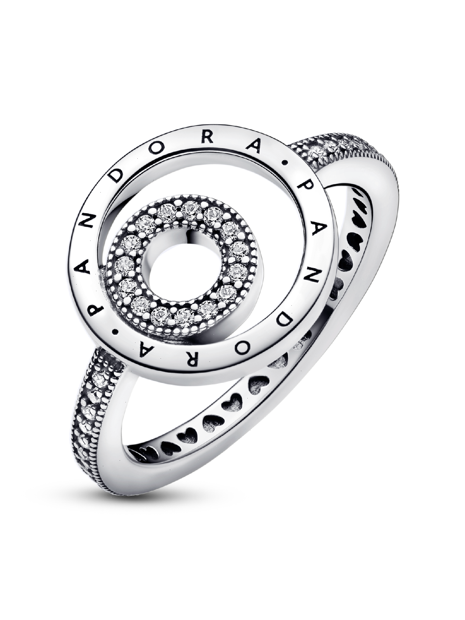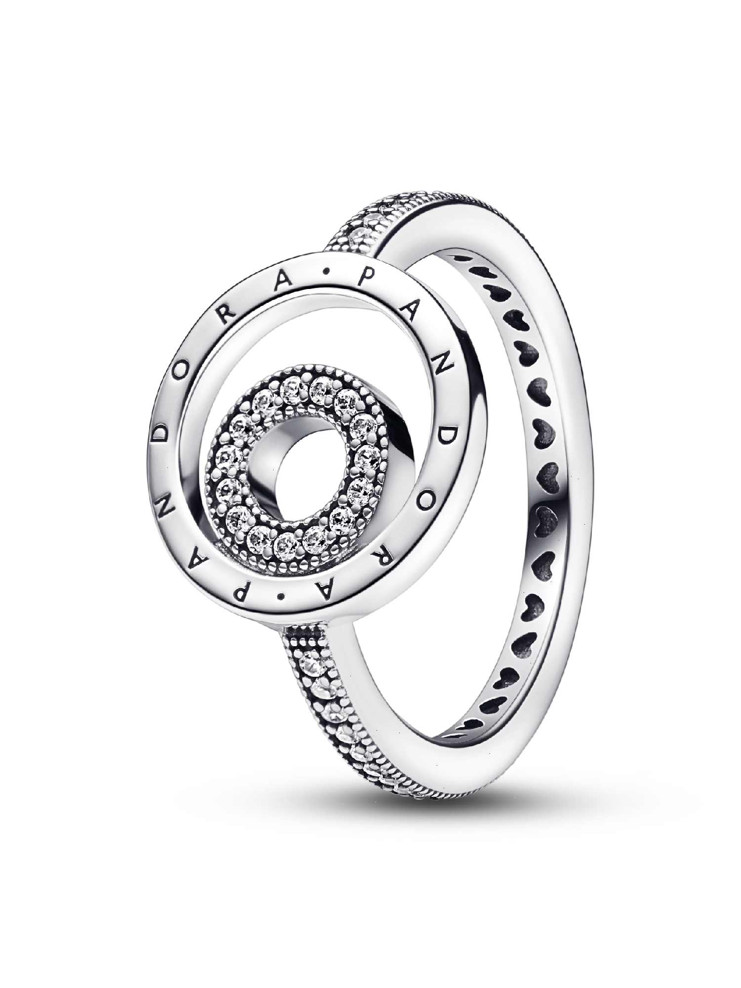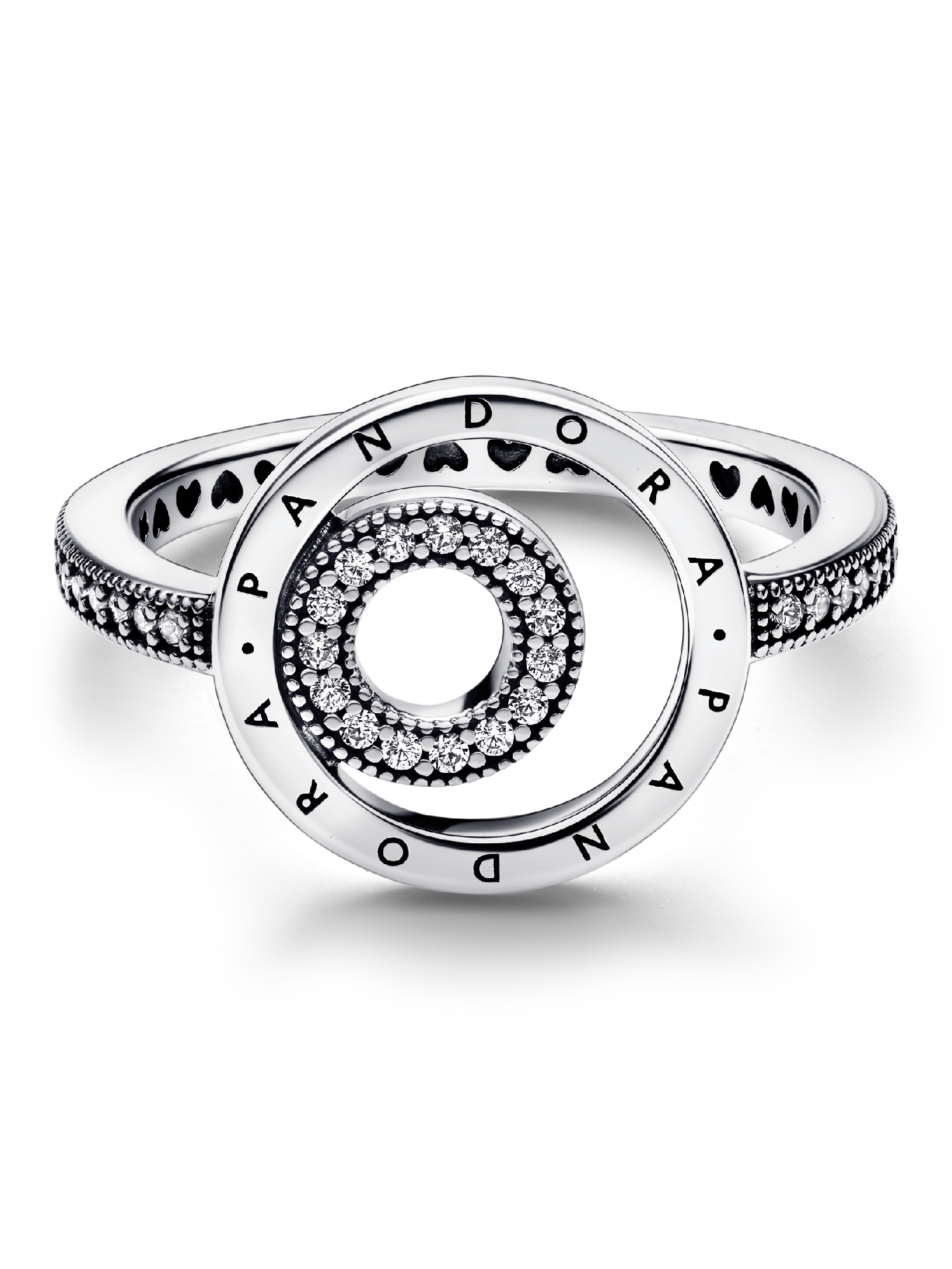 Crafted in sterling silver, the Pandora Signature Logo Circles Pavé Ring combines iconic design elements to create a sophisticated jewelry box staple. The off-centered placement of the inner circle adds a dynamic quality to the design, with rows of microbeading and pave for sparkle and texture. Wear this ring as a statement piece to elevate any outfit.
