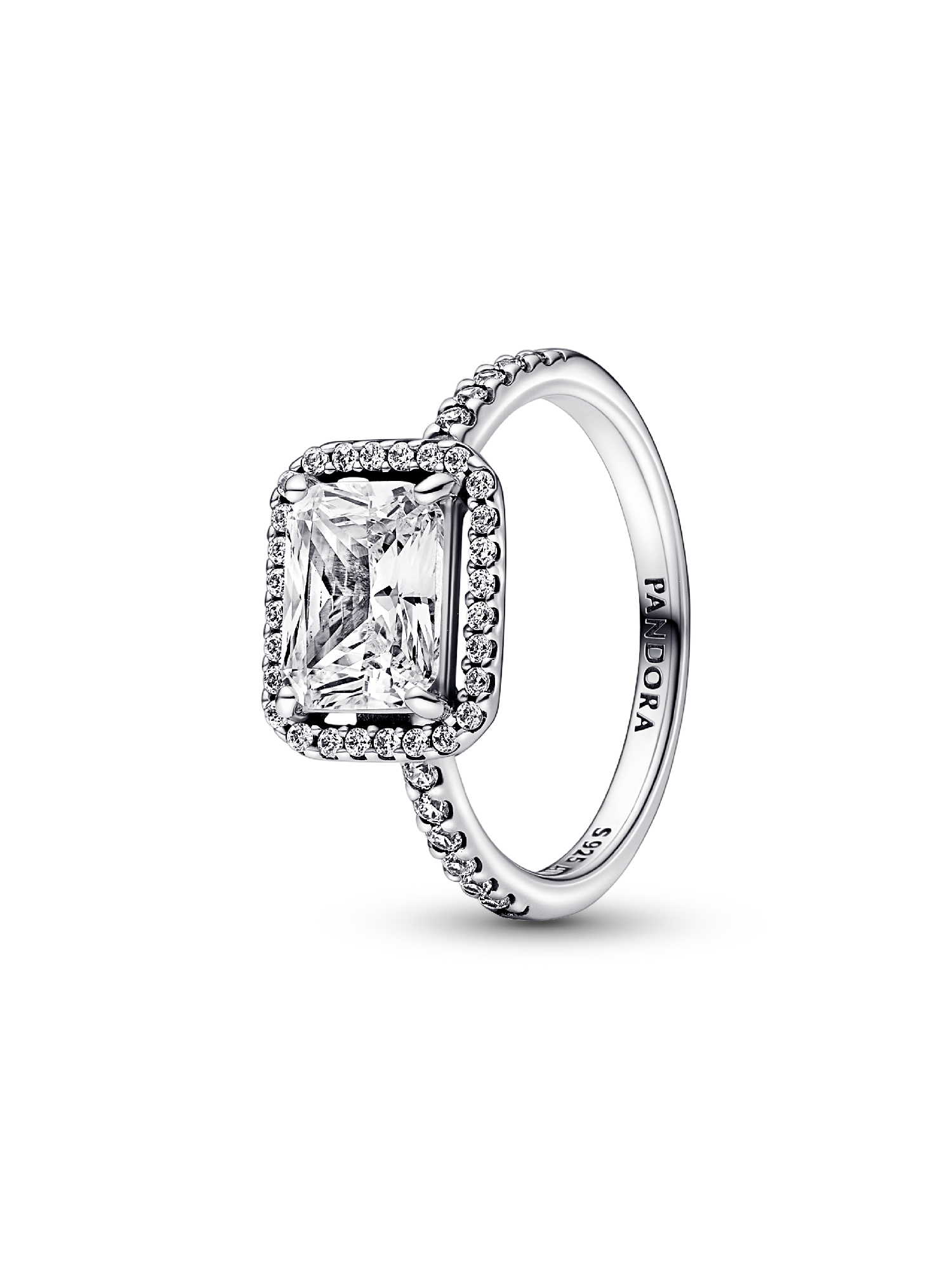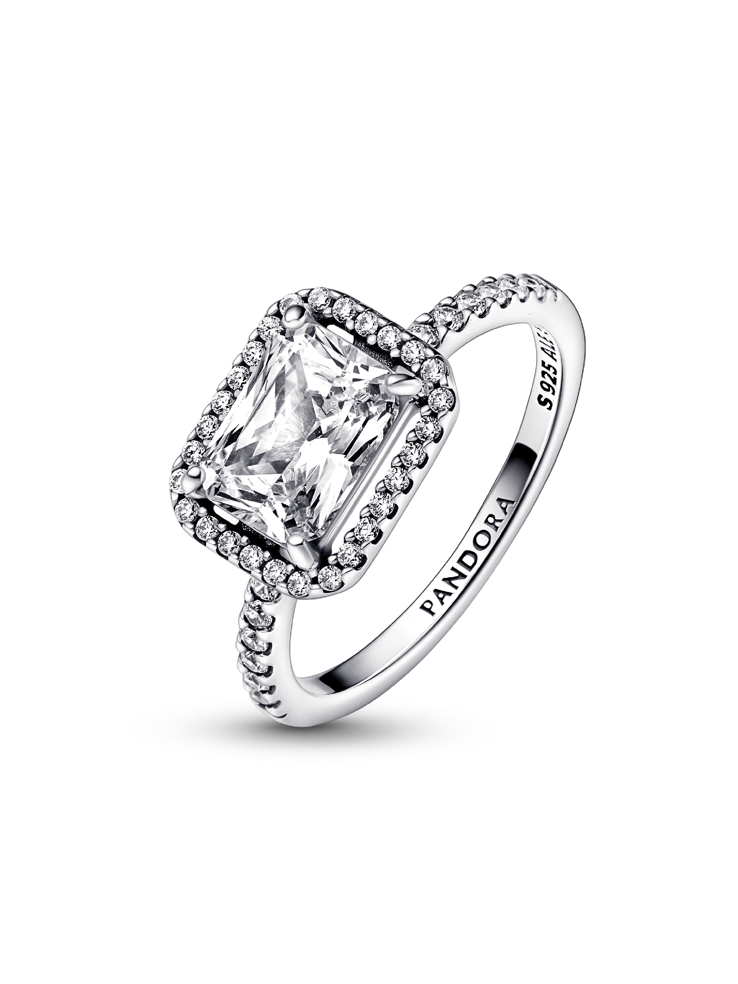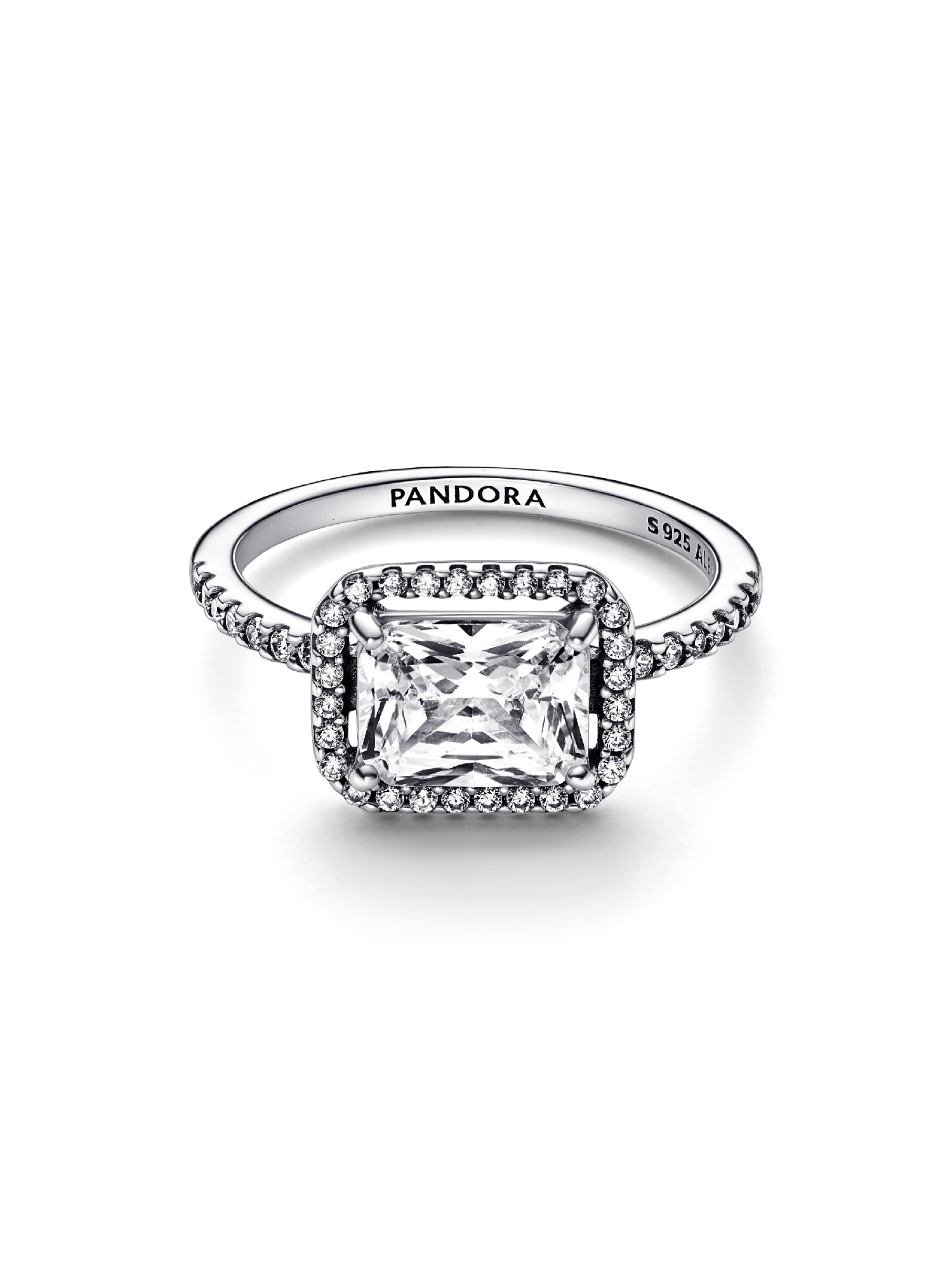 This stunning vintage-inspired ring is one you'll treasure forever. Crafted in sterling silver, this sophisticated Pandora Timeless ring is embellished with a halo of sparkling cubic zirconia stones and features a large rectangular radiant-cut stone as a stand-out centerpiece. Wear it on its own as a statement cocktail ring or style it with contrasting Pandora rings for a fresh, contemporary look.