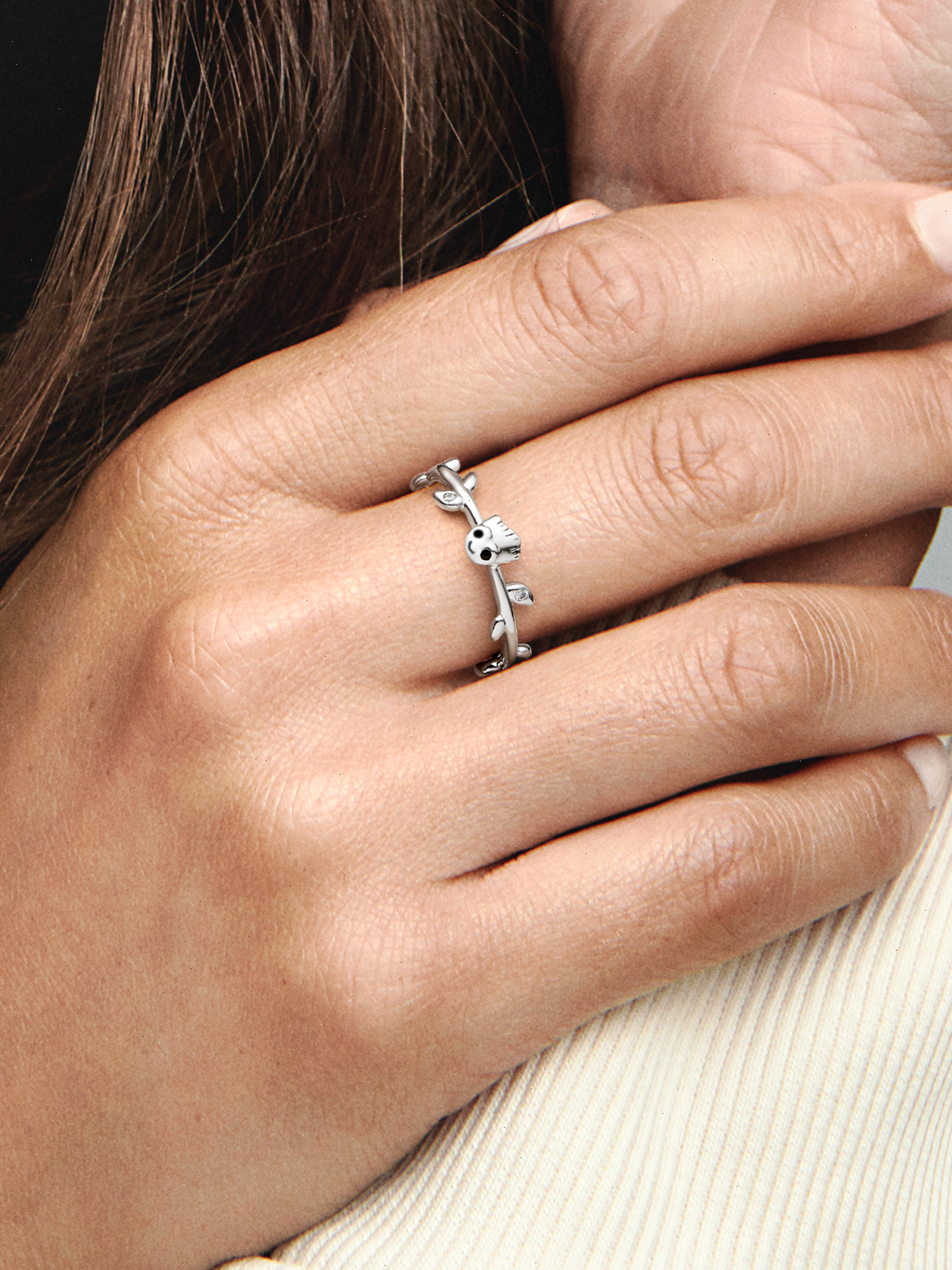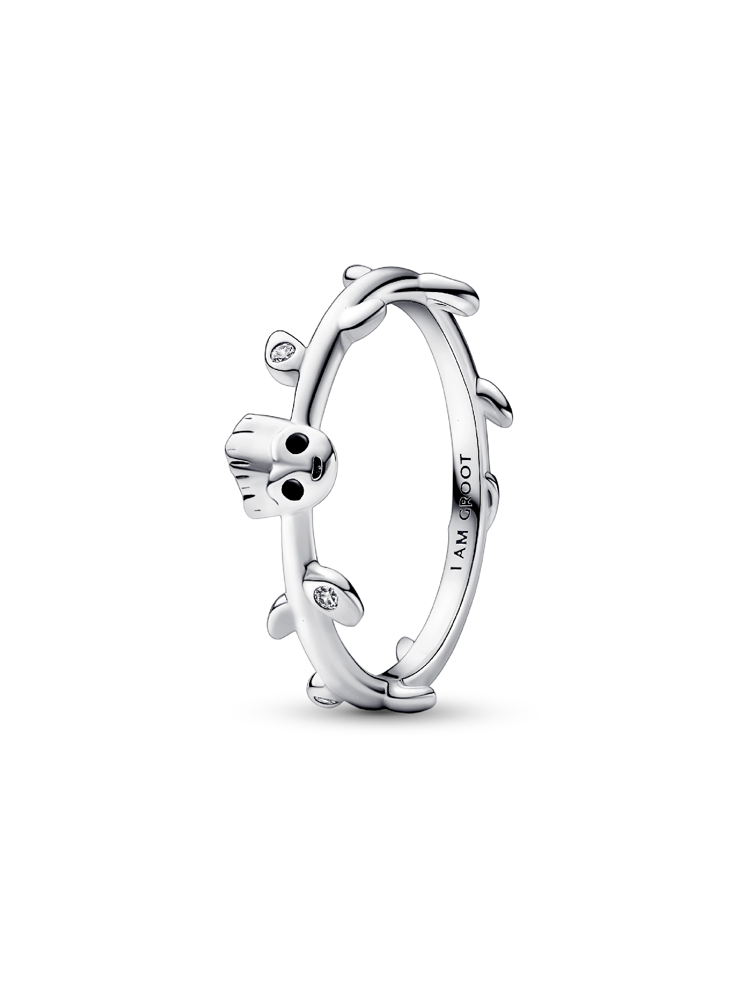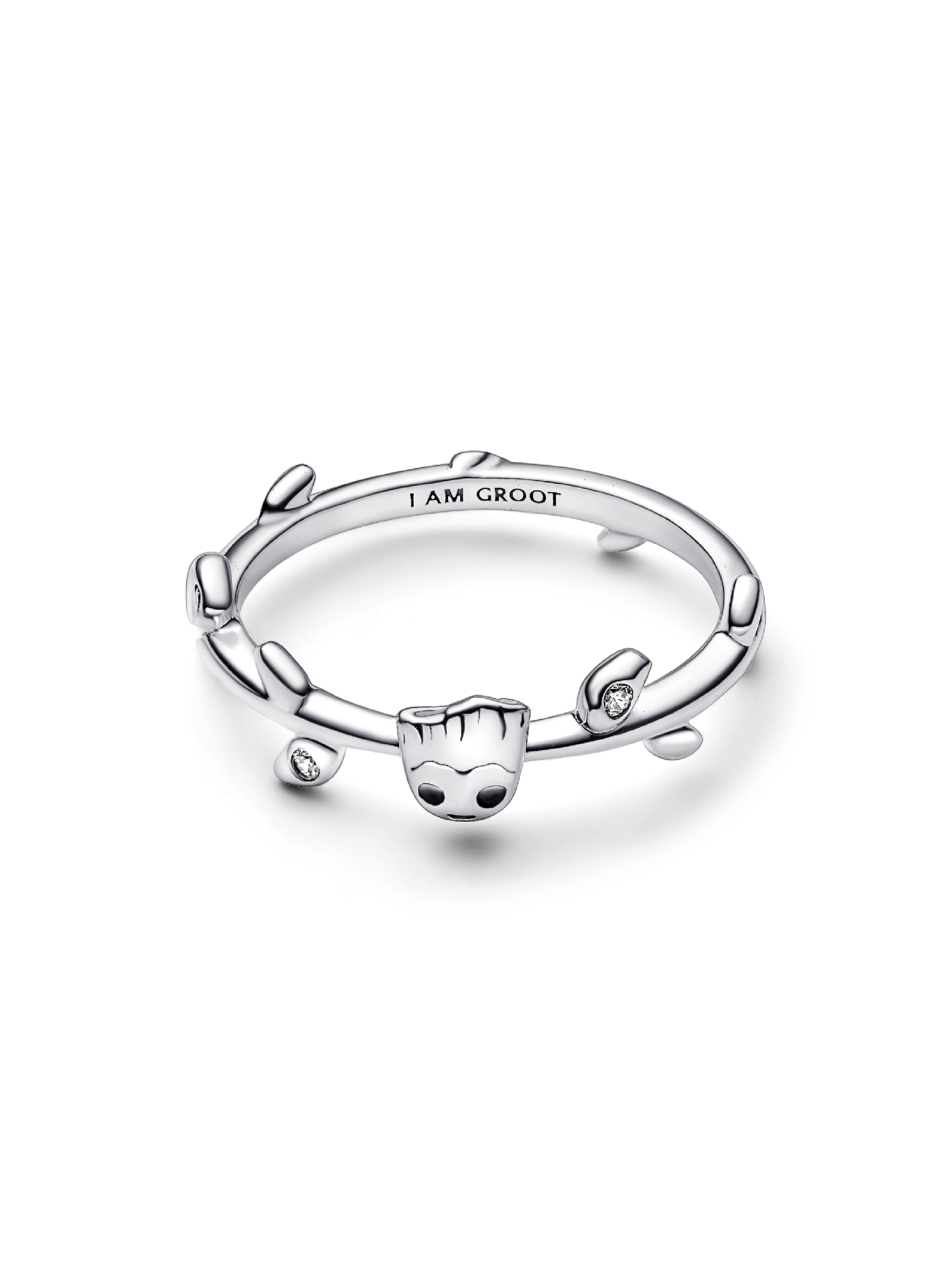 Find the hero within yourself with our Marvel Guardians of the Galaxy Groot Leaf Ring. Hand-finished in sterling silver, it features Groot's sweet, smiling face at its center and leaves around its band. Adding depth and sparkle, Groot's eyes are detailed with hand-applied black enamel and four of the leaves are flush-set with clear cubic zirconia. The only thing he ever says, "I AM GROOT" is engraved along the inside of the band. Add this ring to your collection as a symbol of your ability to grow stronger every day.
