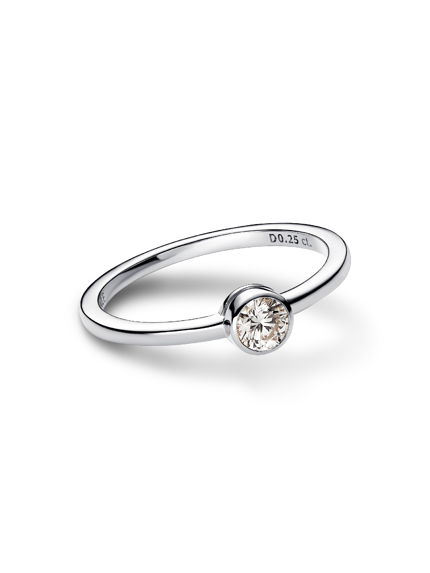 Meet your new essential lab-grown diamond ring. The Pandora Era Bezel Sterling Silver Lab-grown Diamond Ring features a 0.25 carat lab-grown diamond in a sterling silver bezel setting with a sleek, contemporary aesthetic. Cut-outs on the back and sides of the bezel setting let in the light for ultimate sparkle. A classic that brilliantly rises above time, it's the perfect elevated staple. Wear it alone for a minimalist styling or add subtle sparkle to your ring stack. Each Pandora Lab-grown diamond is treated with a post-growth color enhancement called annealing.