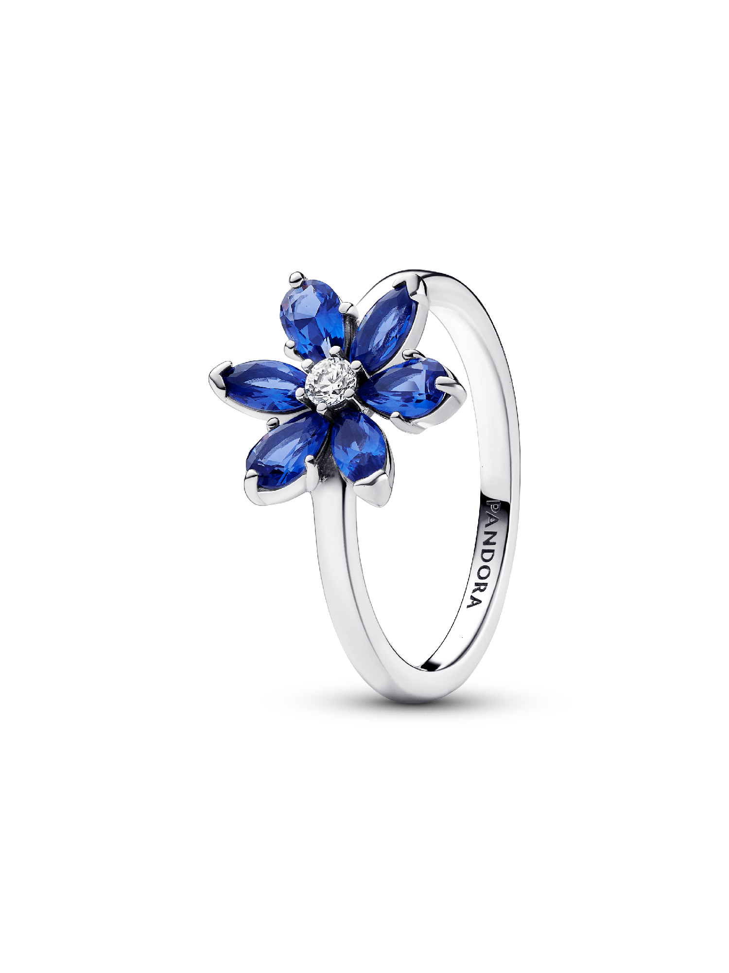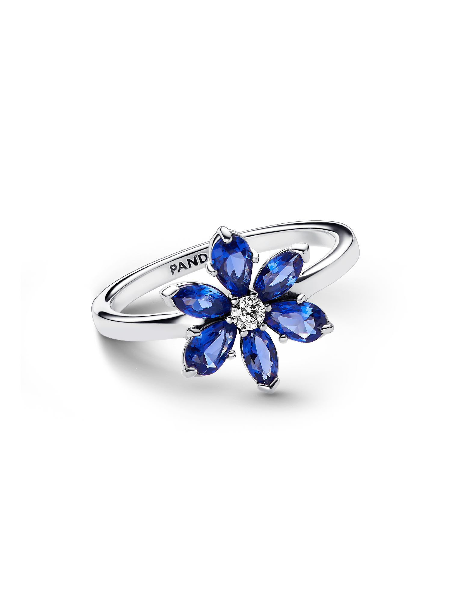 Sparkle in color with the Sparkling Herbarium Cluster Ring. Featuring man-made crystals in the shape of a flower, this sterling silver ring celebrates the beauty of nature. A cluster of alternating pear-shaped and marquise-shaped blue stones are set around a clear center stone, their various shapes evoking the natural symmetry found in the outdoors. Gift it to a nature lover in your life or wear it yourself alongside other Pandora herbarium-inspired styles for an eye-catching coordinated look.
