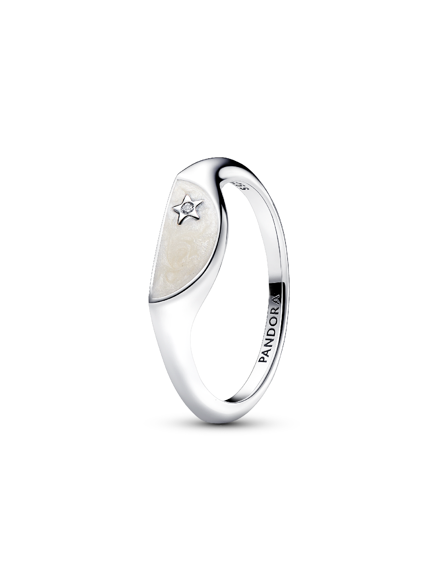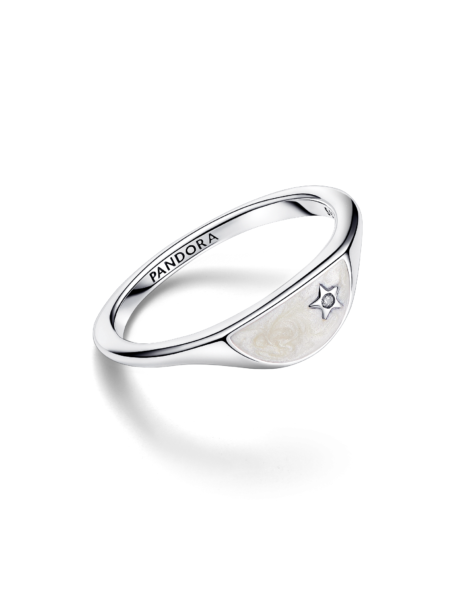 Invoke the power of opposites when you wear the Pandora ME Halved Enamel Signet Ring. A sterling silver ring features a semicircle with a raised star – which has a sparkling stone set at its center – surrounded by shimmering white-and-beige enamel. Wear this sterling silver signet ring alone or with the 14k gold-plated Pandora ME Halved Enamel Signet Ring, which is designed to fit together with this ring and place the stars opposite one another.
