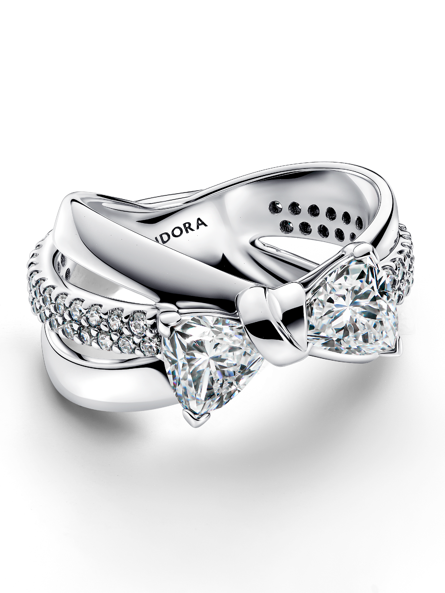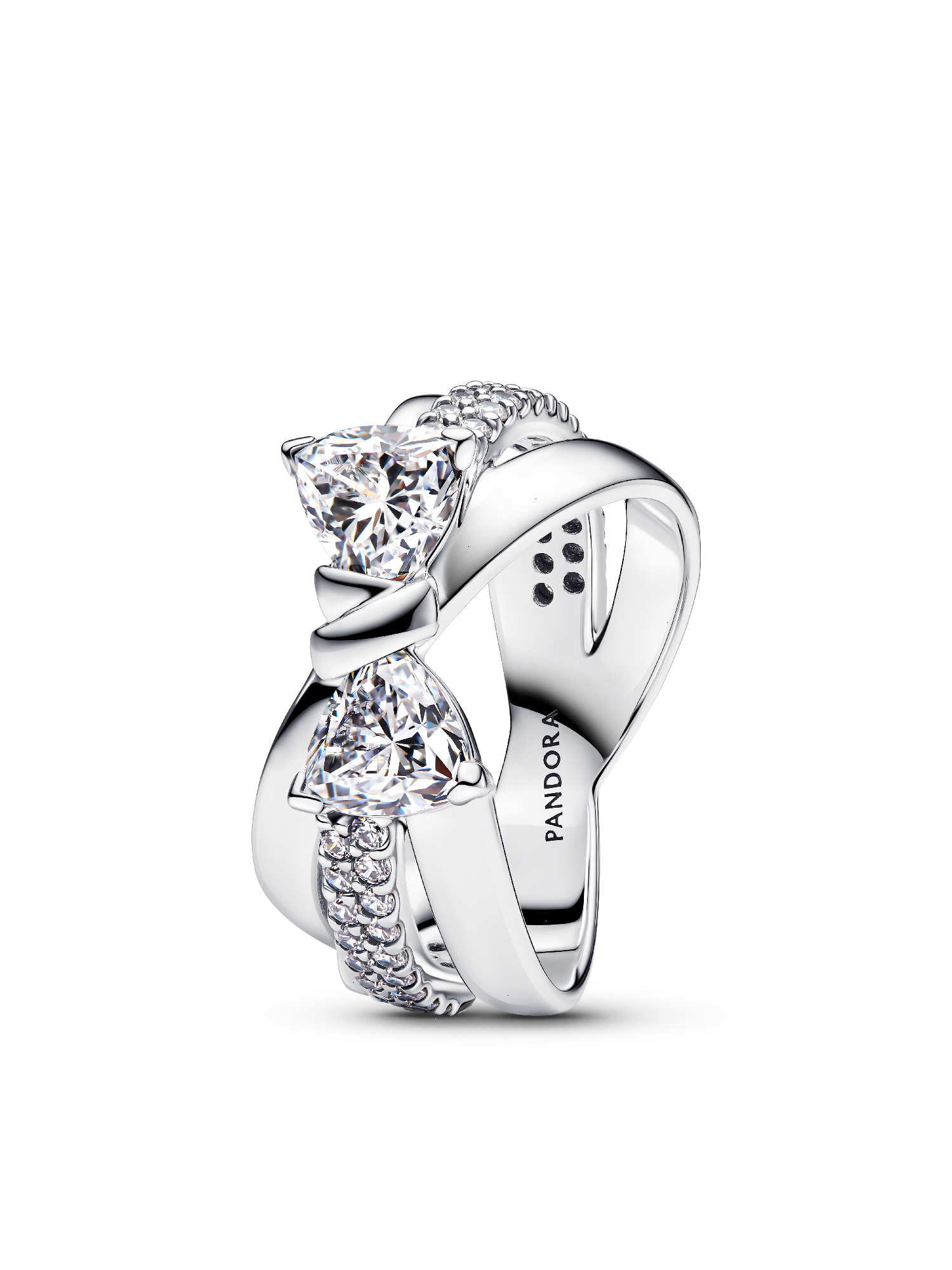 The Sparkling Bow Crossover Ring, crafted in sterling silver, features a bow-shaped motif surrounded by sparkling clear cubic zirconia. The triple band design showcases a row of stones on the mid-line, while the polished outer lines add a touch of shine. Perfect for festive occasions, this ring pairs perfectly with both casual and evening outfits, adding a hint of sparkle to any look.