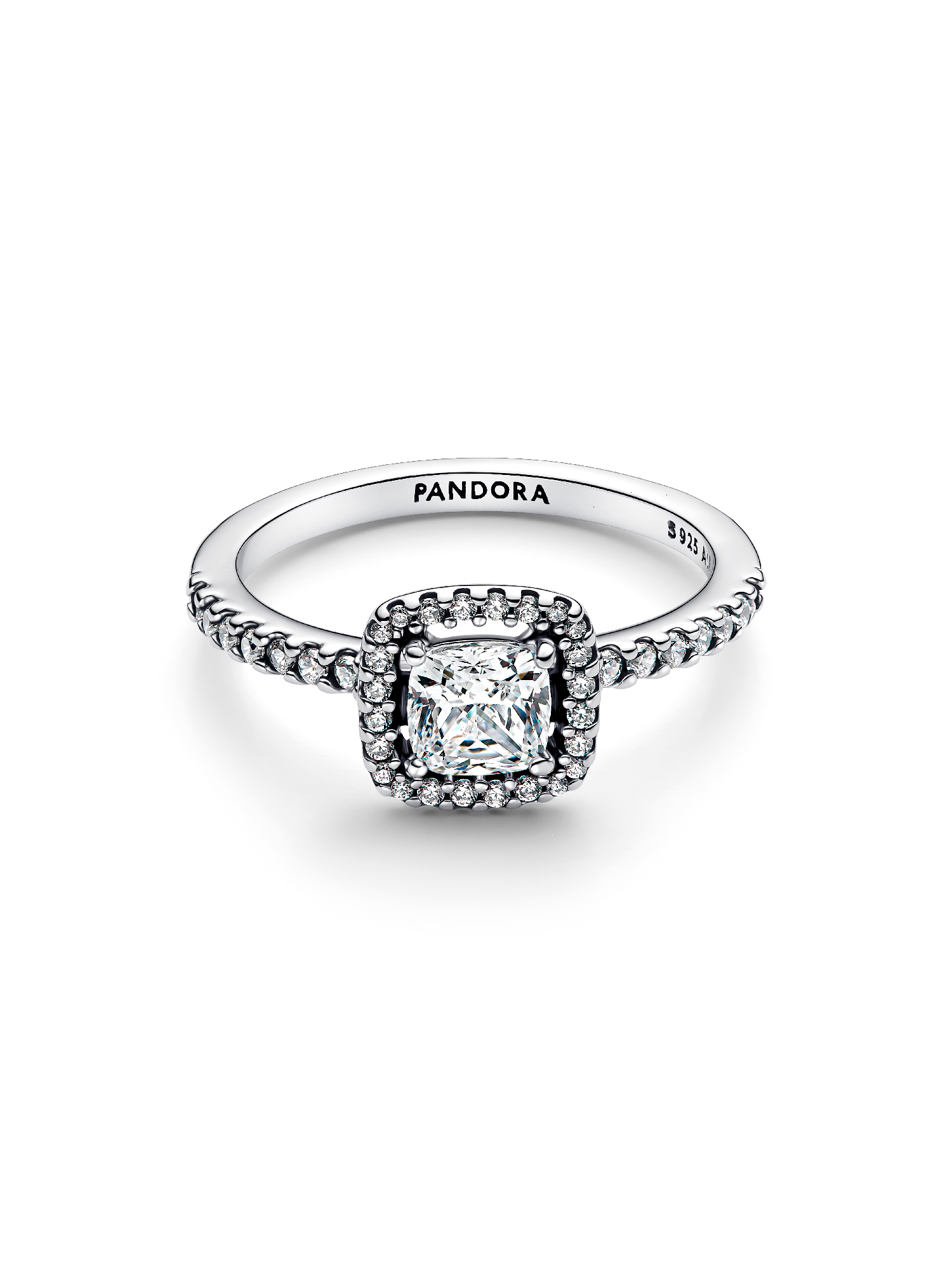 Celebrate you, in stones and sterling silver. With a cushion-cut, squared cubic zirconia at the center surrounded by a halo of pavé, this ring is designed to catch the light and accentuate your inner shine.