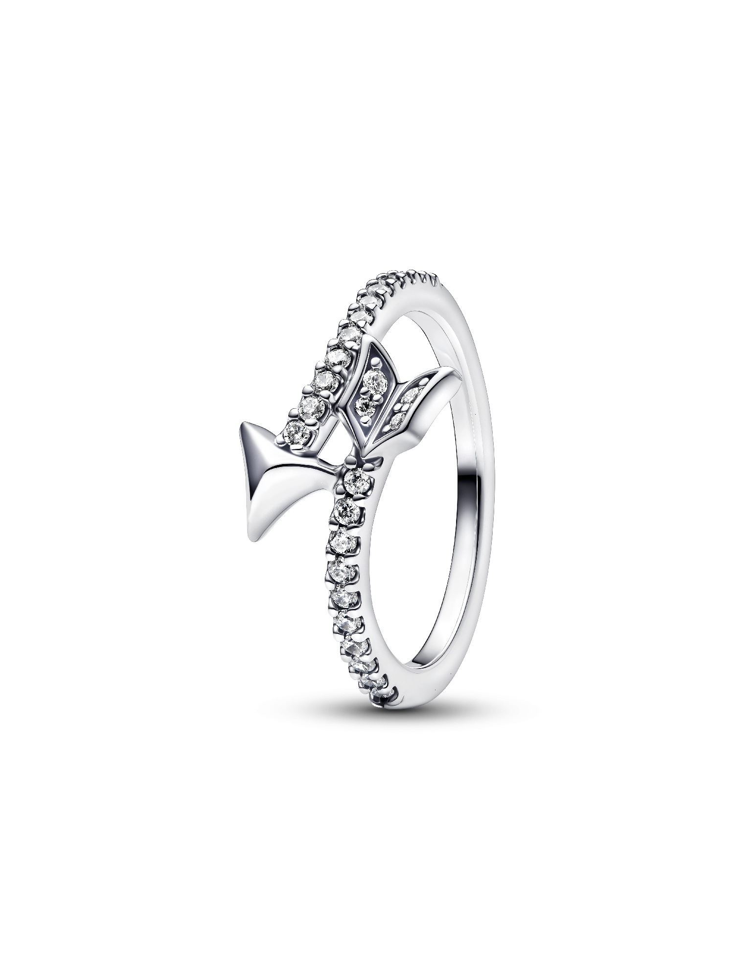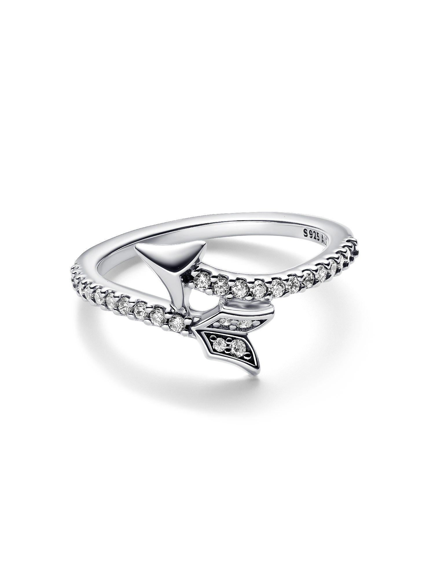 Feeling lovestruck? The Sparkling Arrow Ring features a striking Cupid's arrow motif, crafted from sterling silver. The half-pavé band elegantly mimics the shape of an arrow, complete with a polished tip and curved fletching. Stack it with other minimalist rings for a modern look or wear it solo for a statement piece with subtle symbolism.