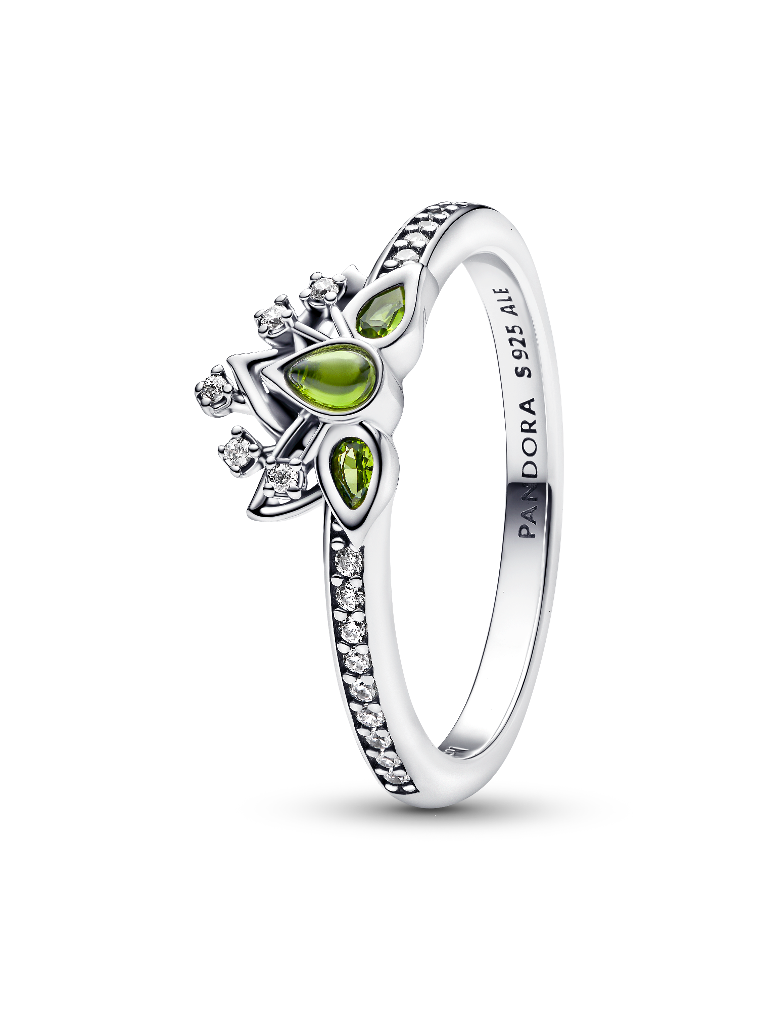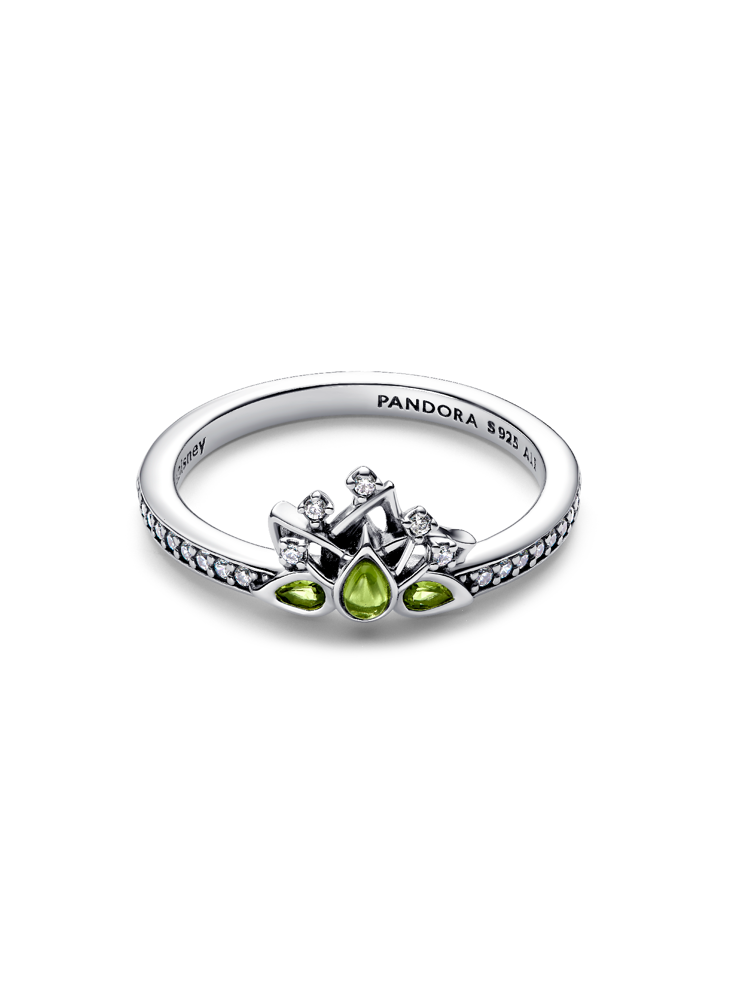 Be unapologetically you, like Disney's Tiana, with this Disney Princesses ring. Crafted from sterling silver, the enchanting design features three pear-shaped light green crystals, all complemented by 18 bead-set and 5 prong-set round brilliant-cut cubic zirconia. Together, the stones create a lily pad shape with openwork leaves, adorned with smaller stones that mimic Disney's Tiana’s very own tiara. Bring princess energy to every day with this special ring, and stack it as a reminder to trust your power to shine.