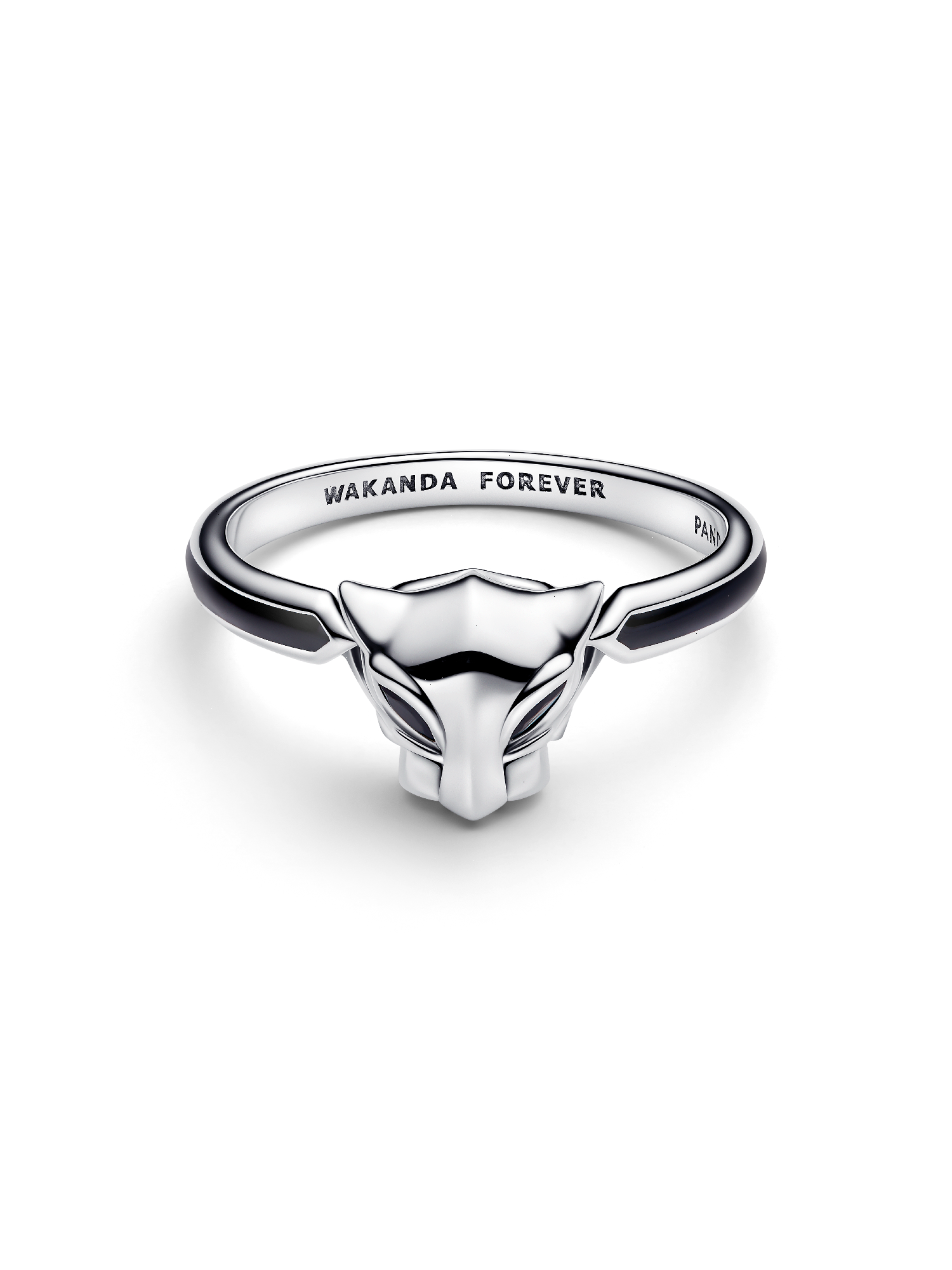 Channel the power of Wakanda's legendary warrior king with a ring inspired by Marvel's Black Panther. Made of sterling silver and set with two black man-made crystals, it features a 'WAKANDA FOREVER' engraving.