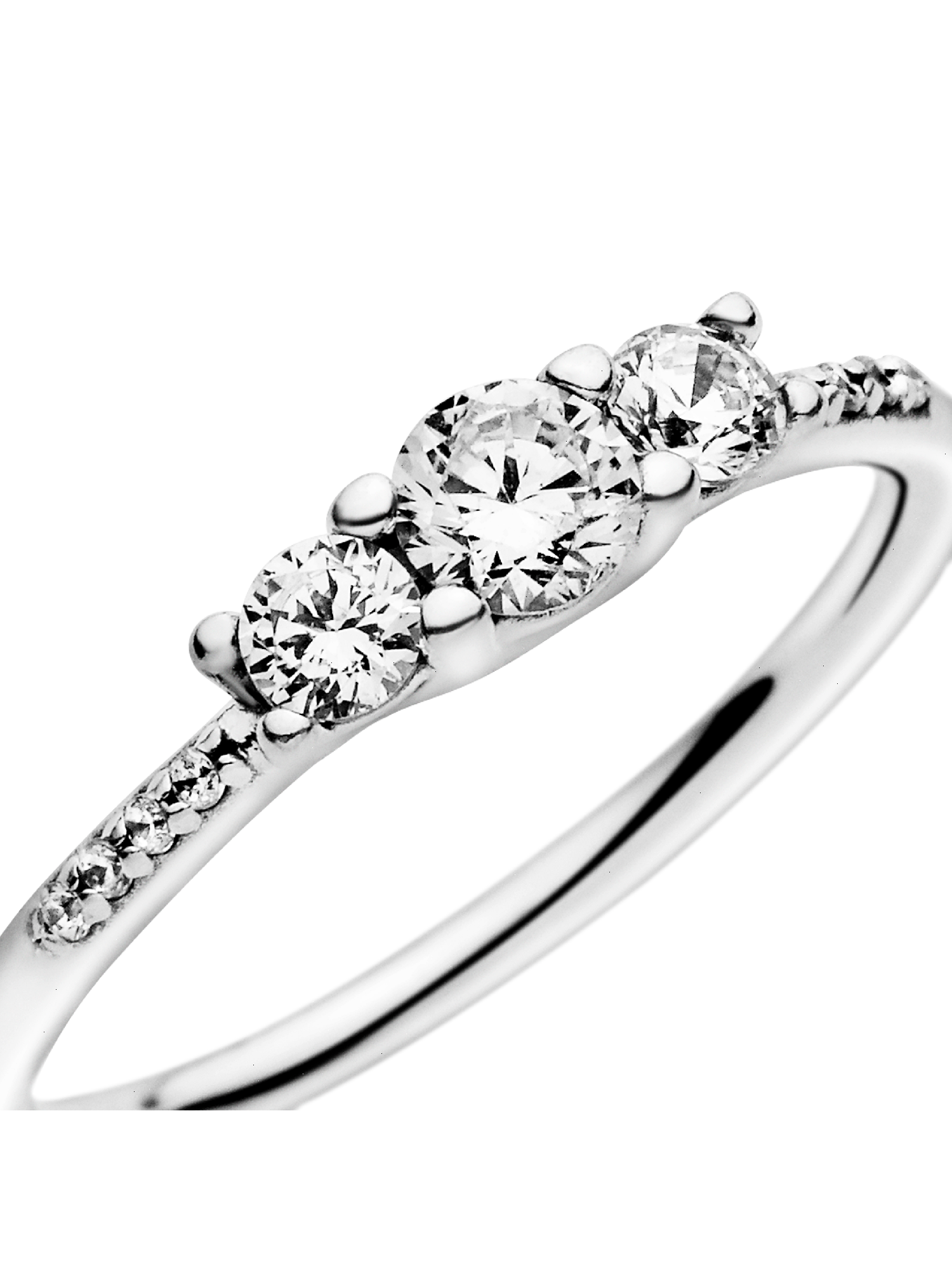 Lend a touch of sparkle to every occasion with this timelessly elegant ring. Beautifully crafted in sterling silver, the classic design features a trio of brilliant-cut cubic zirconia stones, surrounded by tiny shimmering stones. Let it shine on its own, or mix and match with other Pandora rings for a modern twist.