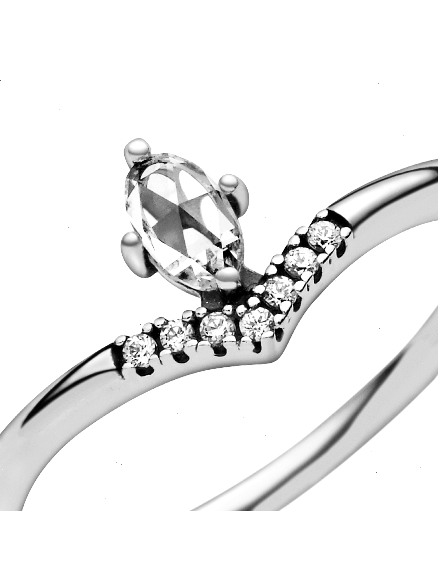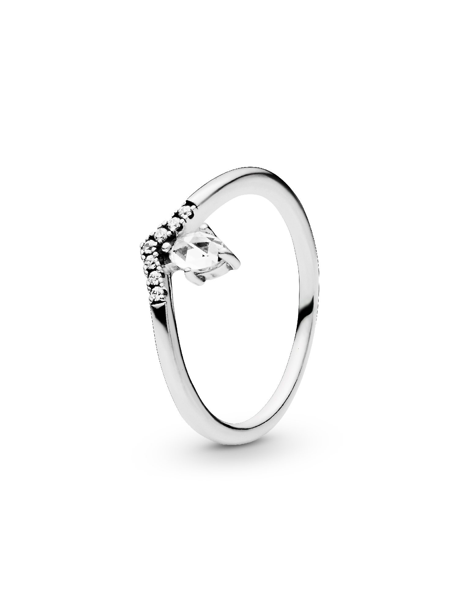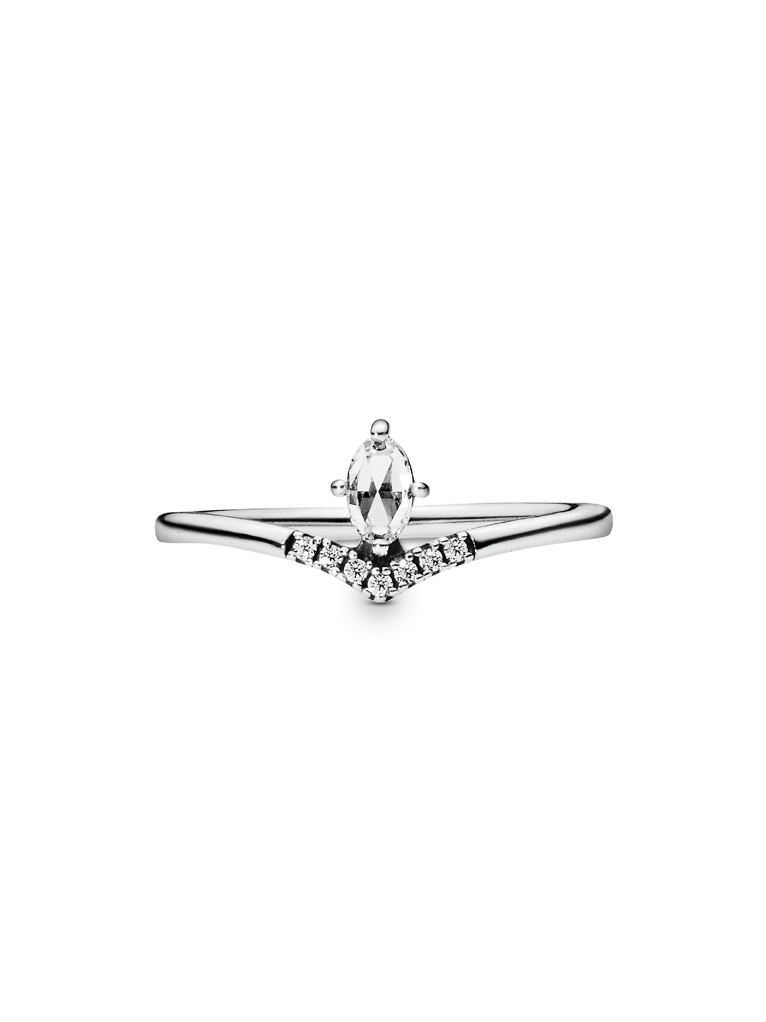 Keep luck on your side with this Pandora Wish ring in the timeless wishbone shape. The classic sterling silver style is topped with round cubic zirconia and a single oval stone. The sparkling details create a striking tiara-effect to adds sparkle to your stack. Wear it up or across fingers, adding other wishbone pieces from the collection to create a look that's uniquely you.