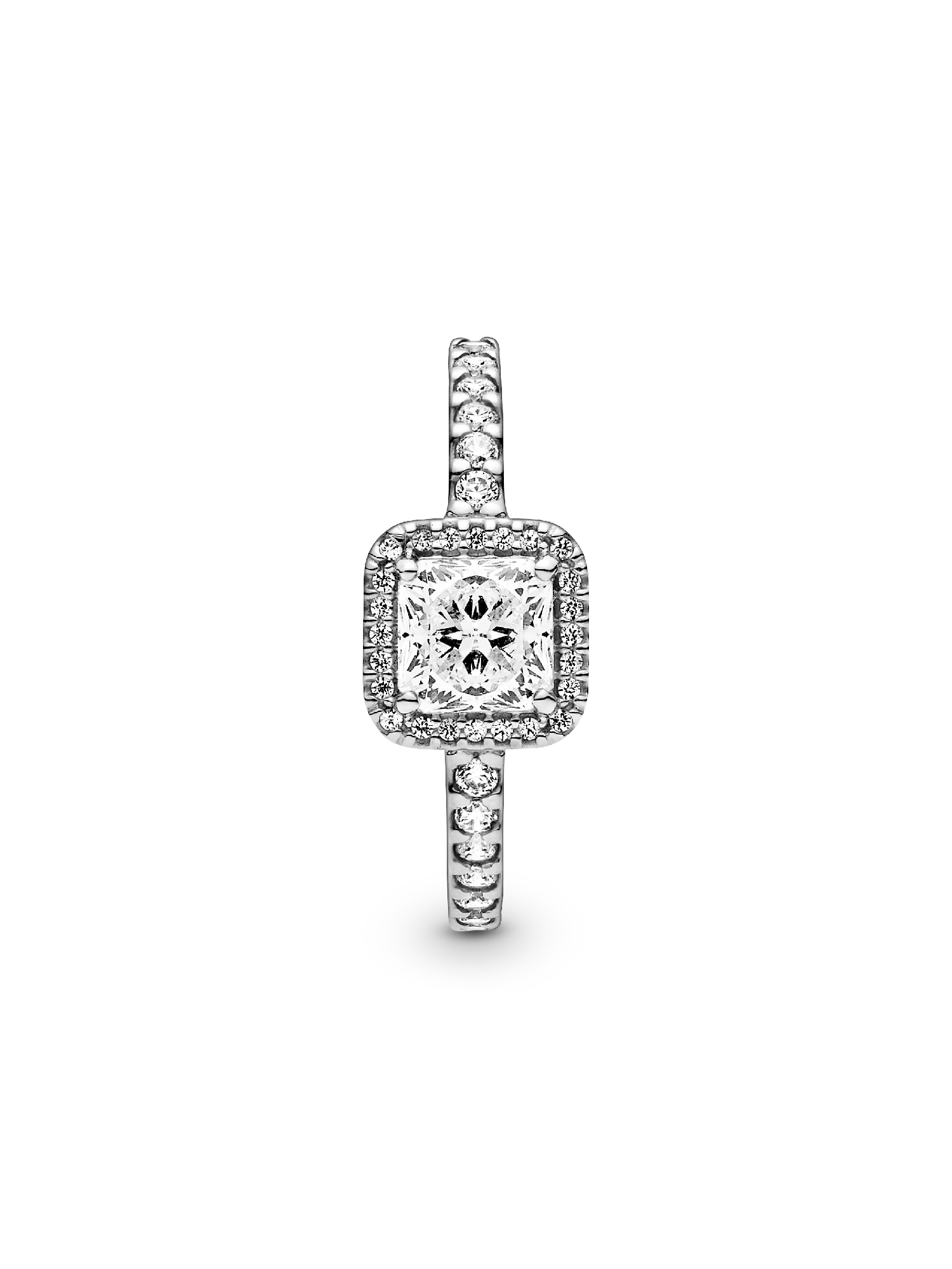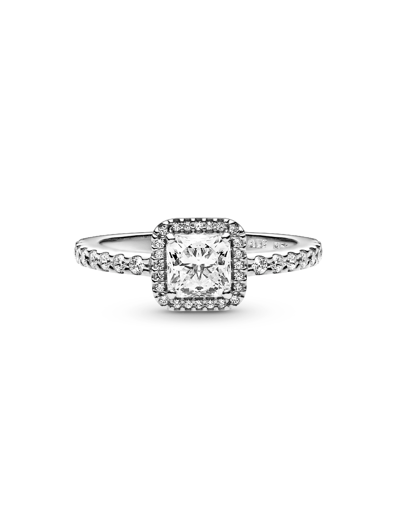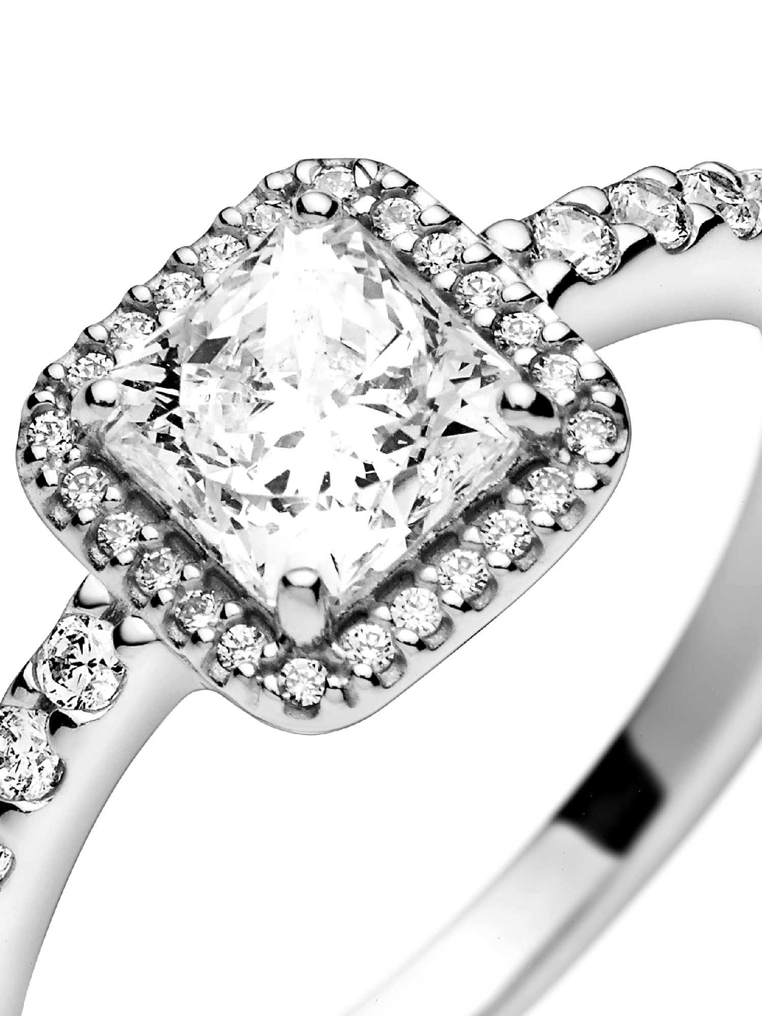 This stunning vintage-inspired ring is one you'll treasure forever. Crafted in sterling silver, this sophisticated style is embellished with sparkling cubic zirconia stones and features a large, square-cut stone as the centerpiece. Wear it on its own as a statement cocktail ring or style it with contrasting Pandora rings for a fresh, contemporary look.