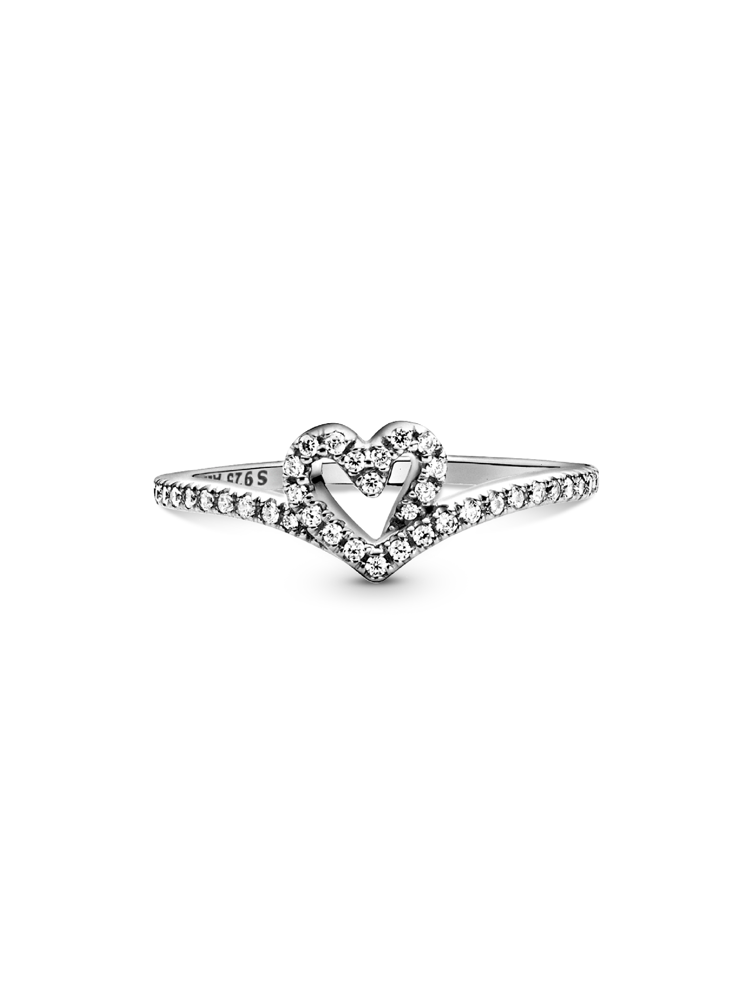 Gift the one you love the Sparkling Wishbone Heart Ring. Hand-finished in sterling silver, this piece is inspired by classic Pandora design elements. The heart detail has been incorporated into the series' iconic V-shape to create a heartfelt design. Clear cubic zirconia decorate the heart and top of the ring shank. Present this style to someone special to show how much you care.