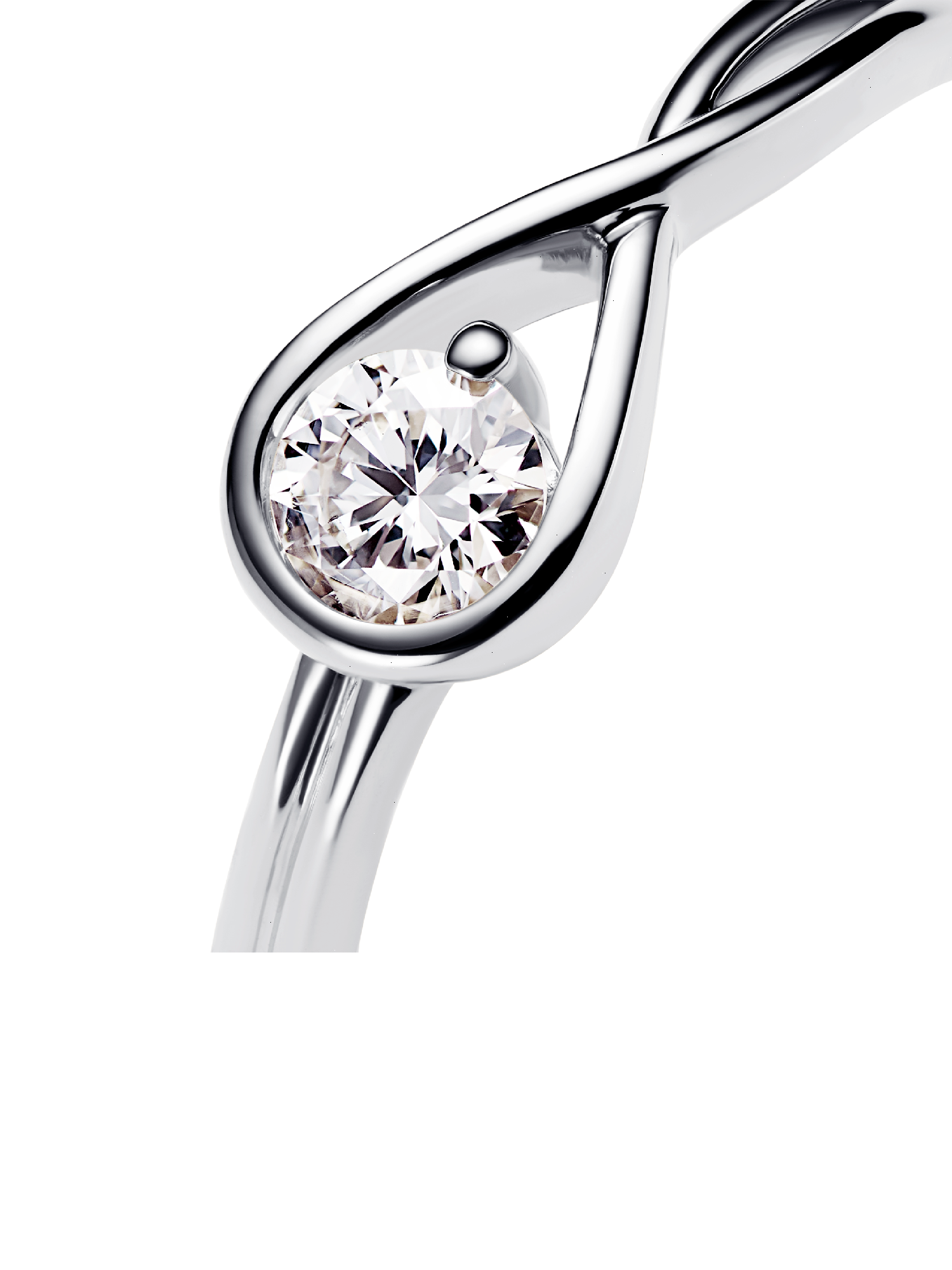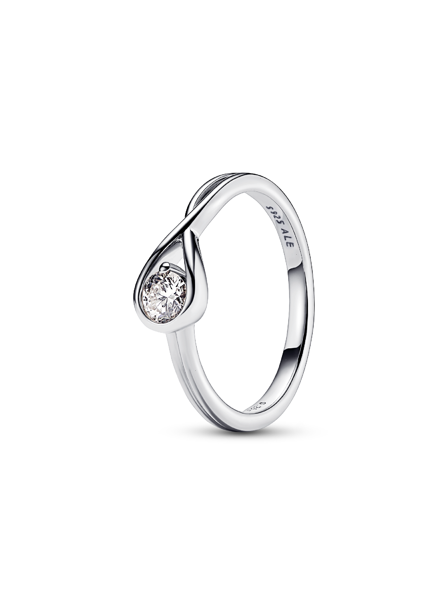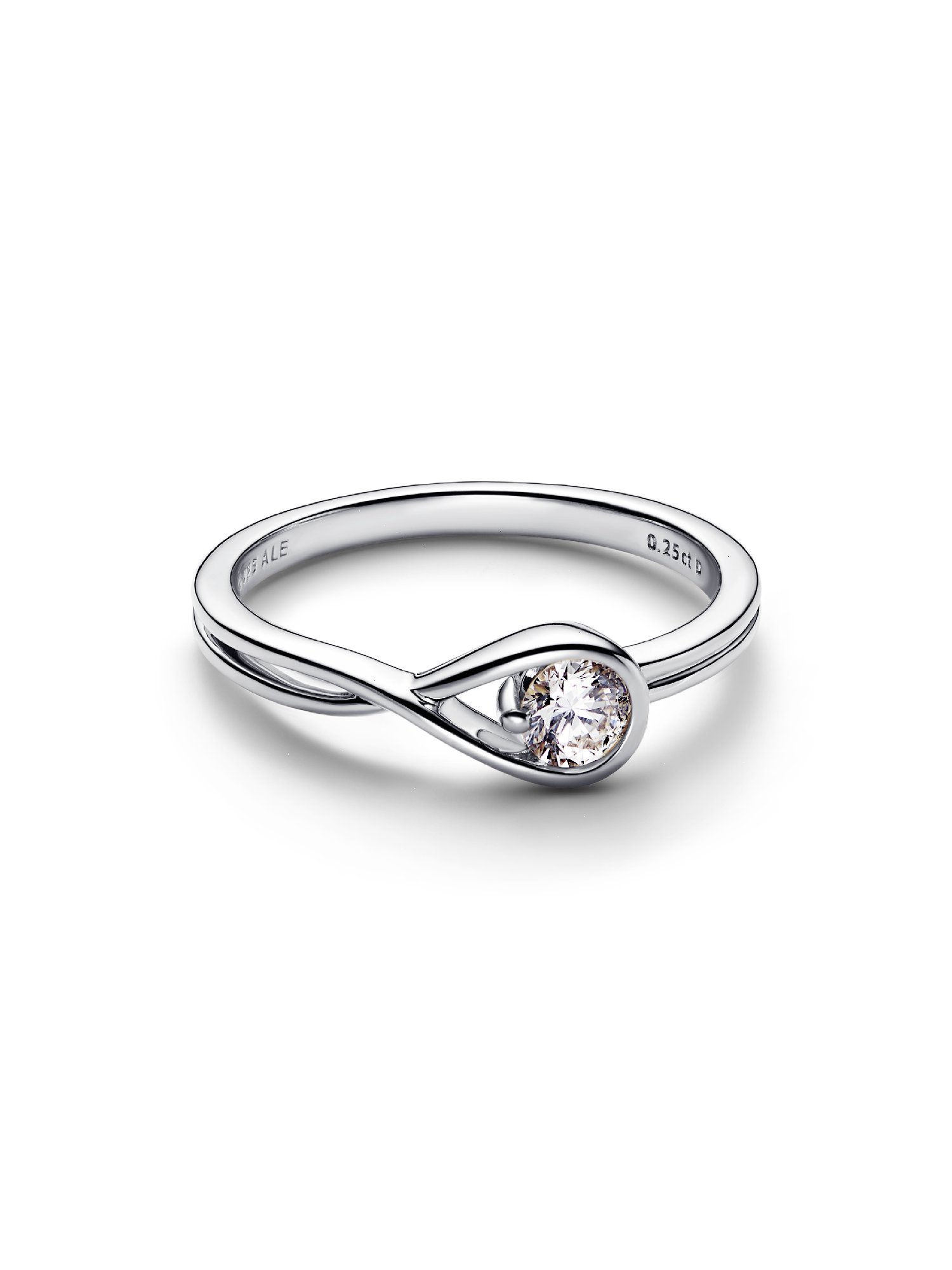 A solid sterling silver ring hand set with a 0.25 carat lab-grown diamond. A beautiful statement of empowerment and possibility, or a simple yet eloquent declaration of love. This ring features a scintillating round brilliant excellent cut lab-grown diamond in a modern infinity setting that flows seamlessly around the stone. It can be worn alone or stacked with other rings from the Pandora Infinite collection. Each Pandora Lab-grown diamond is treated with a post-growth color enhancement called annealing.