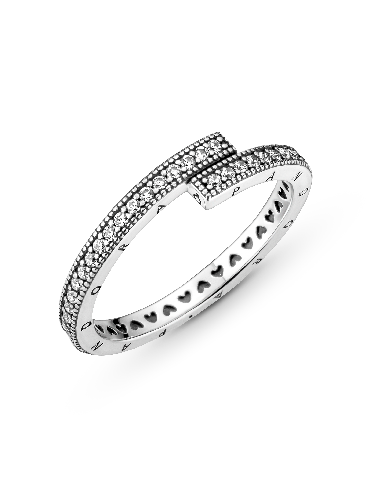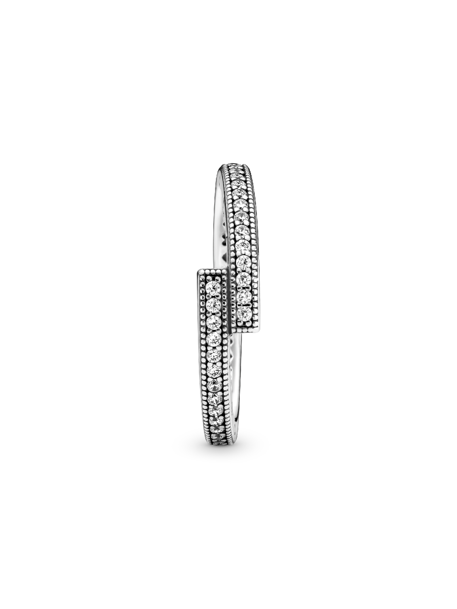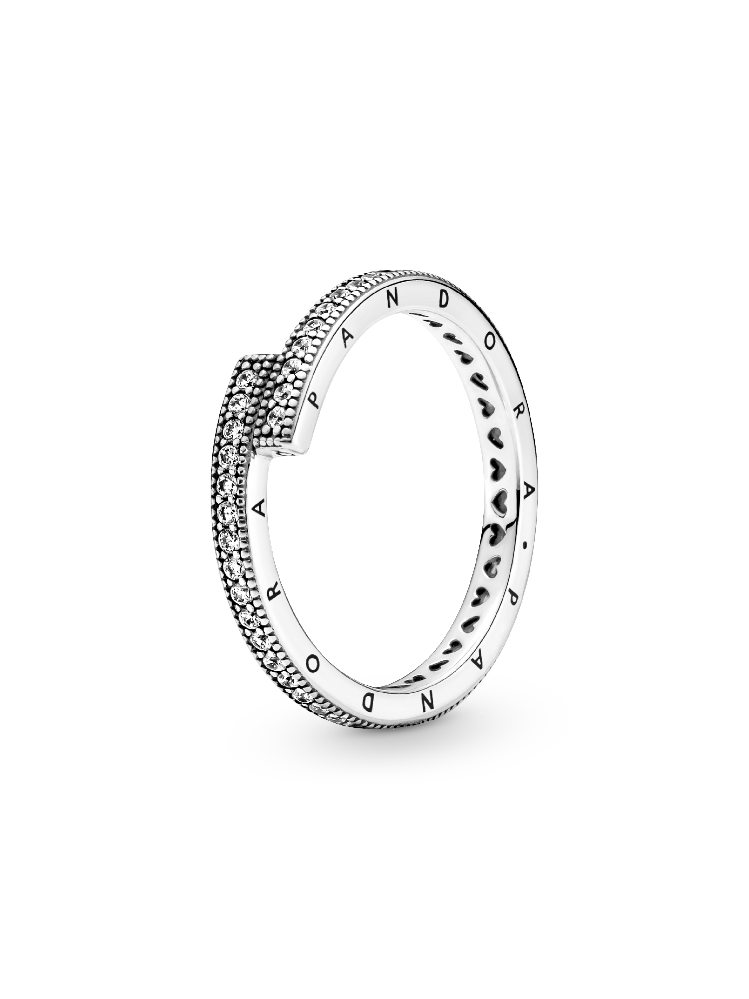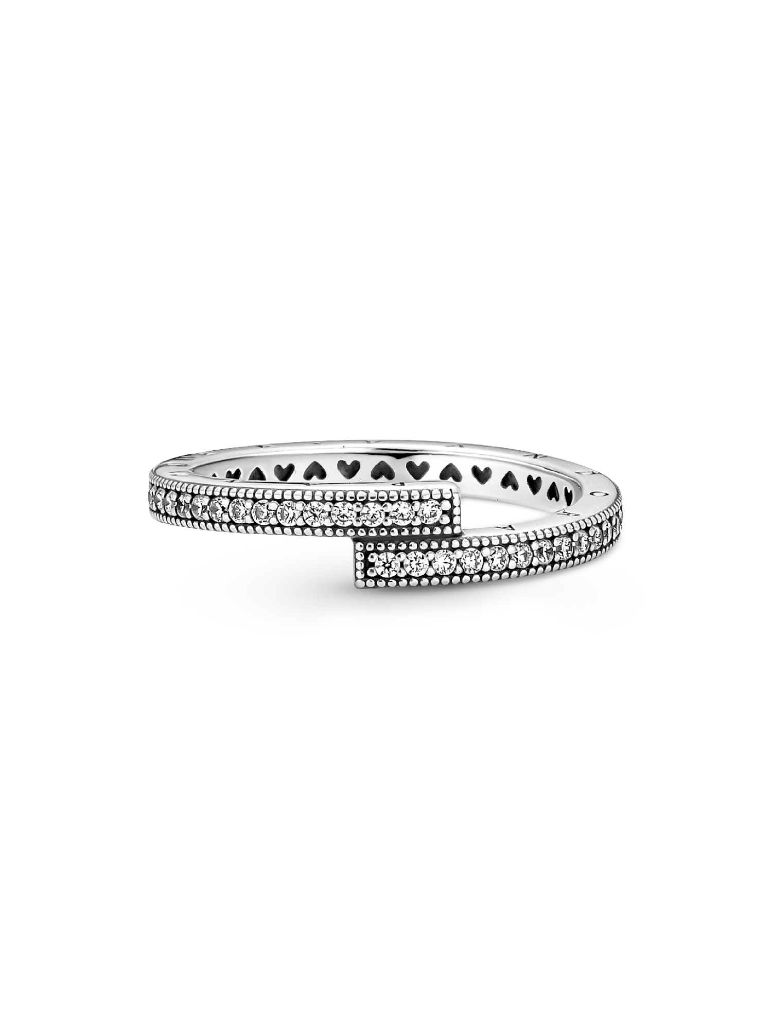Opt for modern minimalism with the Sparkling Overlapping Ring. This Sterling Silver ring features an asymmetrical design where the square ends of the band slightly overlap to create 90-degree angles. The outer band features clear cubic zirconia pavé framed by micro-beading, the sides have the Pandora logo and the inner shank has cut-out hearts. There are two Pandora Crown O monograms at the end of each profile. Subtly stunning on its own or show-stopping when multiple are stacked together, this ring makes a clean, chic statement.